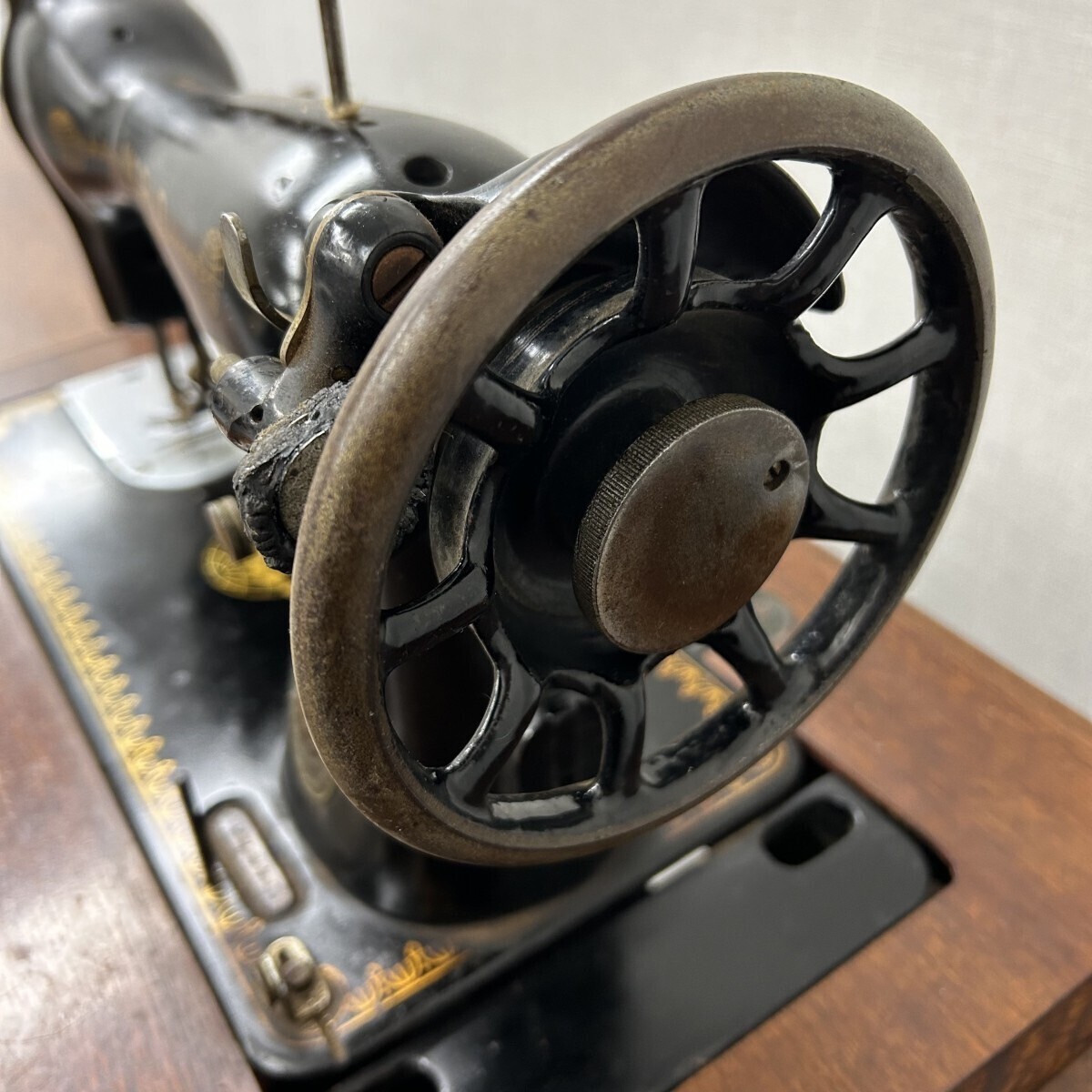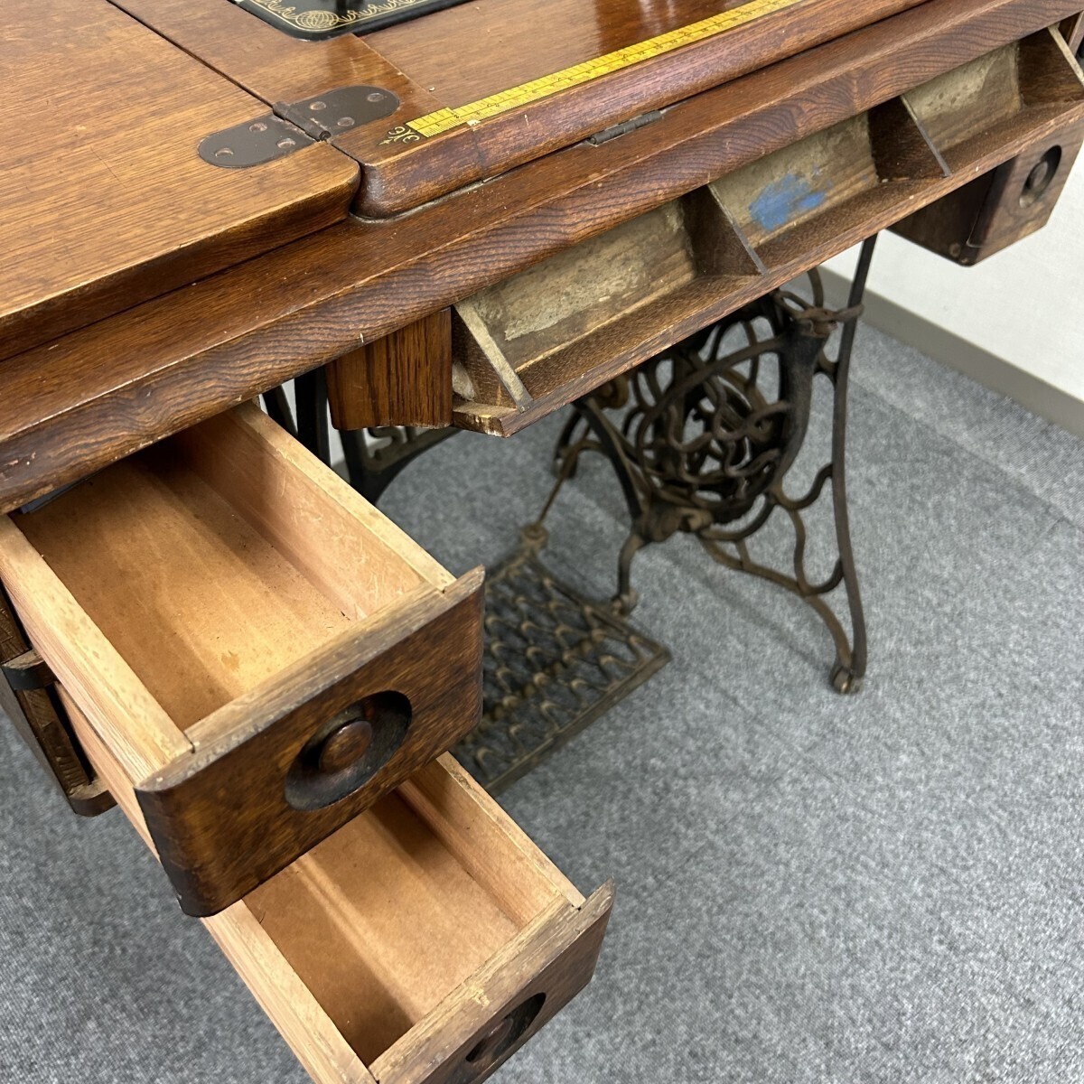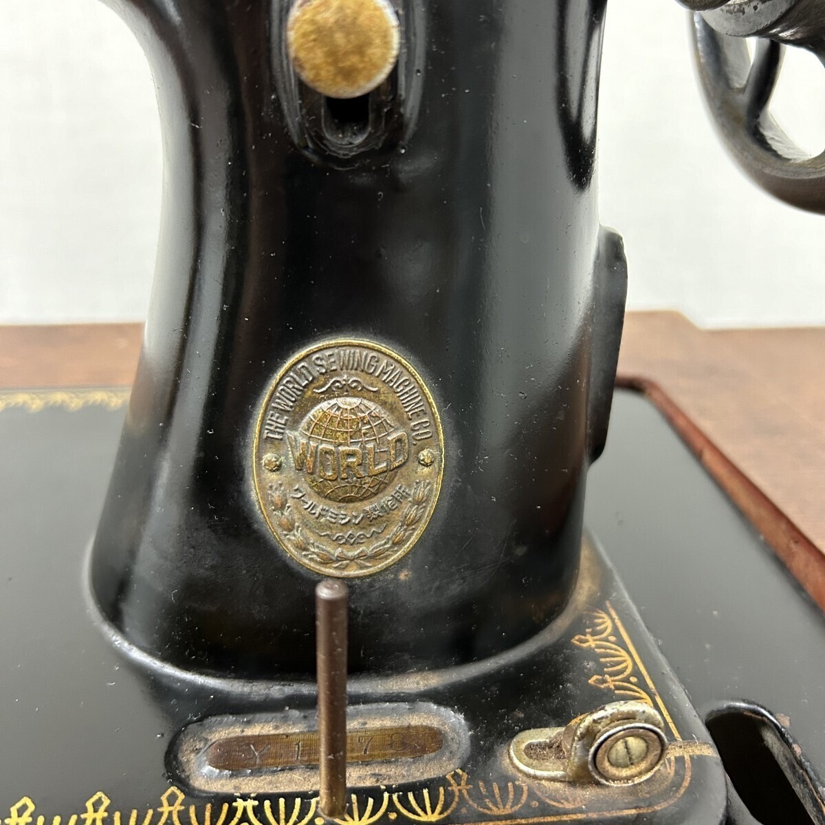 美しい装飾が施されたWORLDの足踏み式ミシンです。