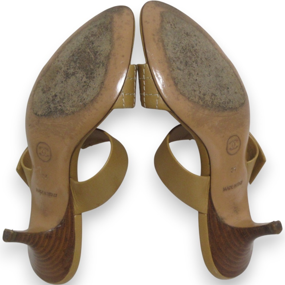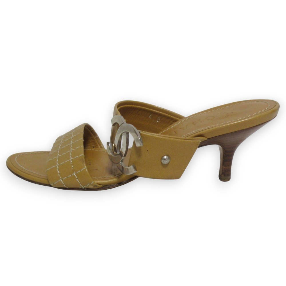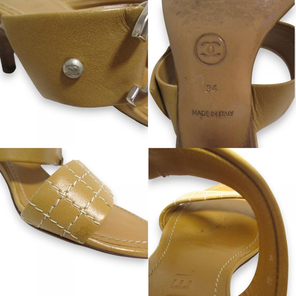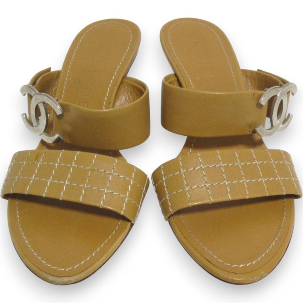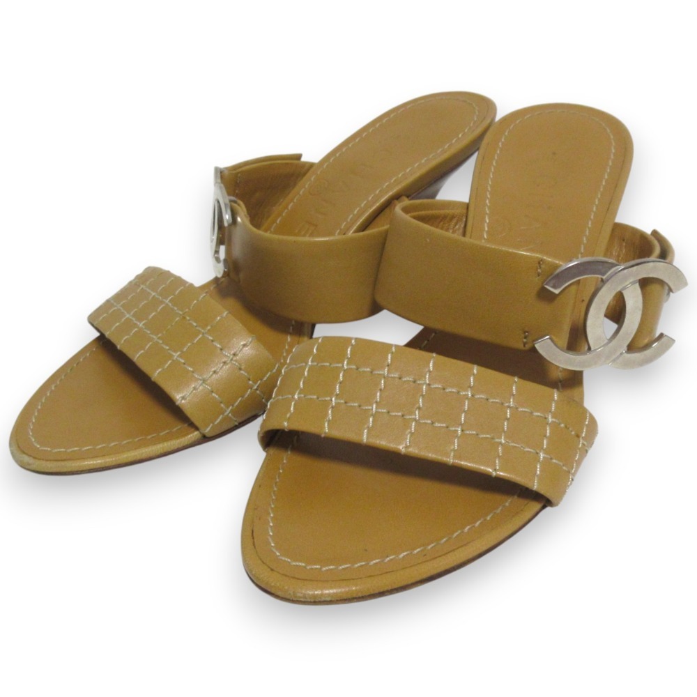 良品 CHANEL シャネル ココマーク ダブルストラップ ヒール サンダル ミュール 34 約21cm ベージュブラウン×シルバー金具