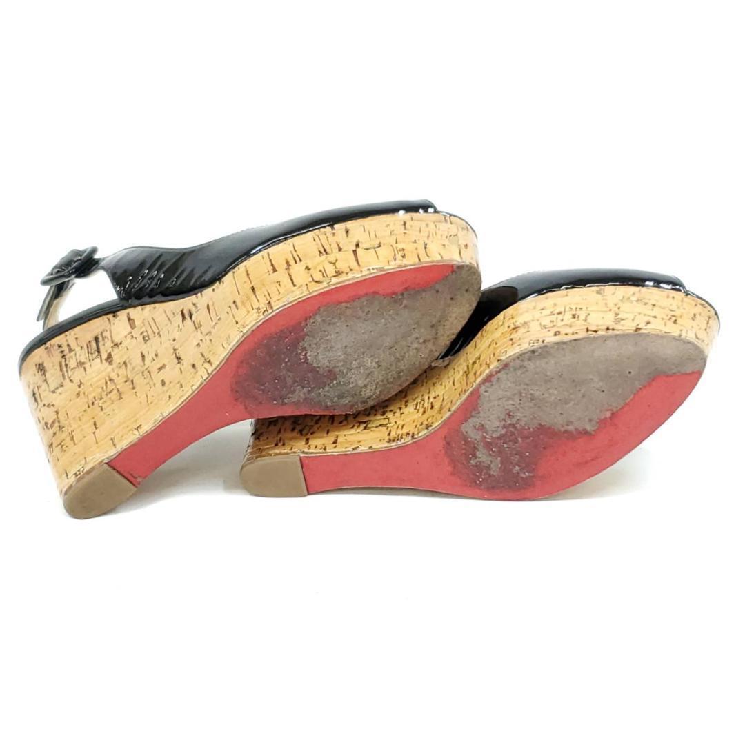 ブラックのエナメルアッパーに、ナチュラルなコルク素材の厚底ヒールが映える、ラグジュアリー&リゾート感のある一足。