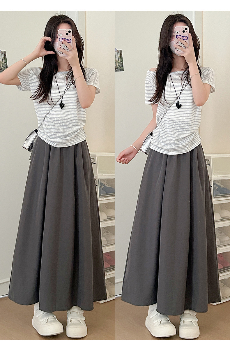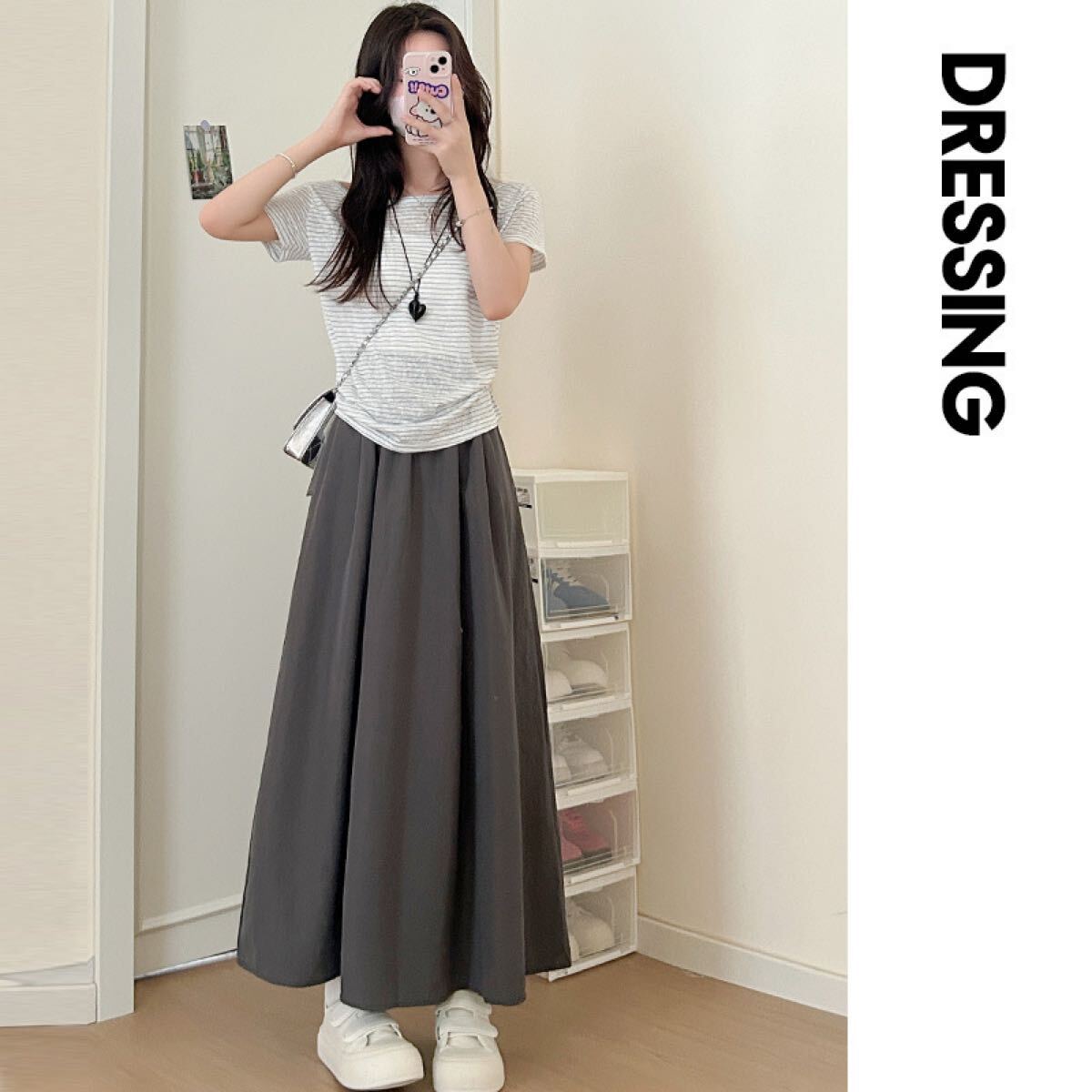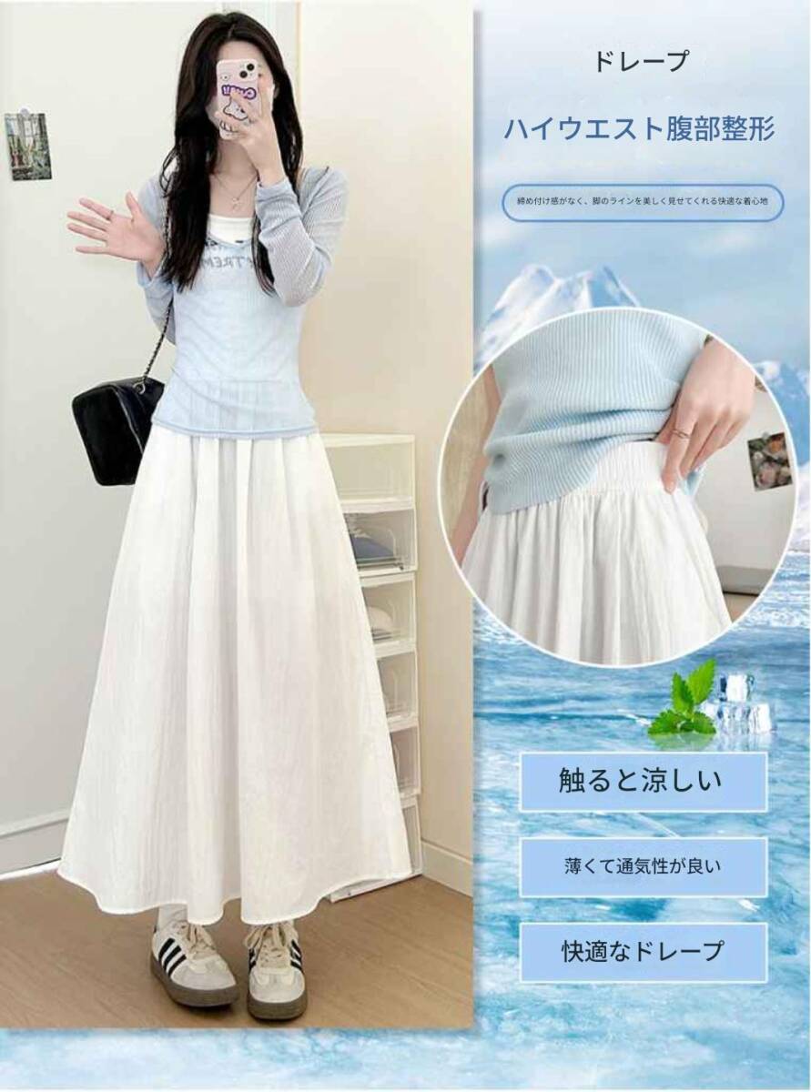 軽量素材のベージュフレアロングスカート、ウエストリボン付きでスタイリッシュ。