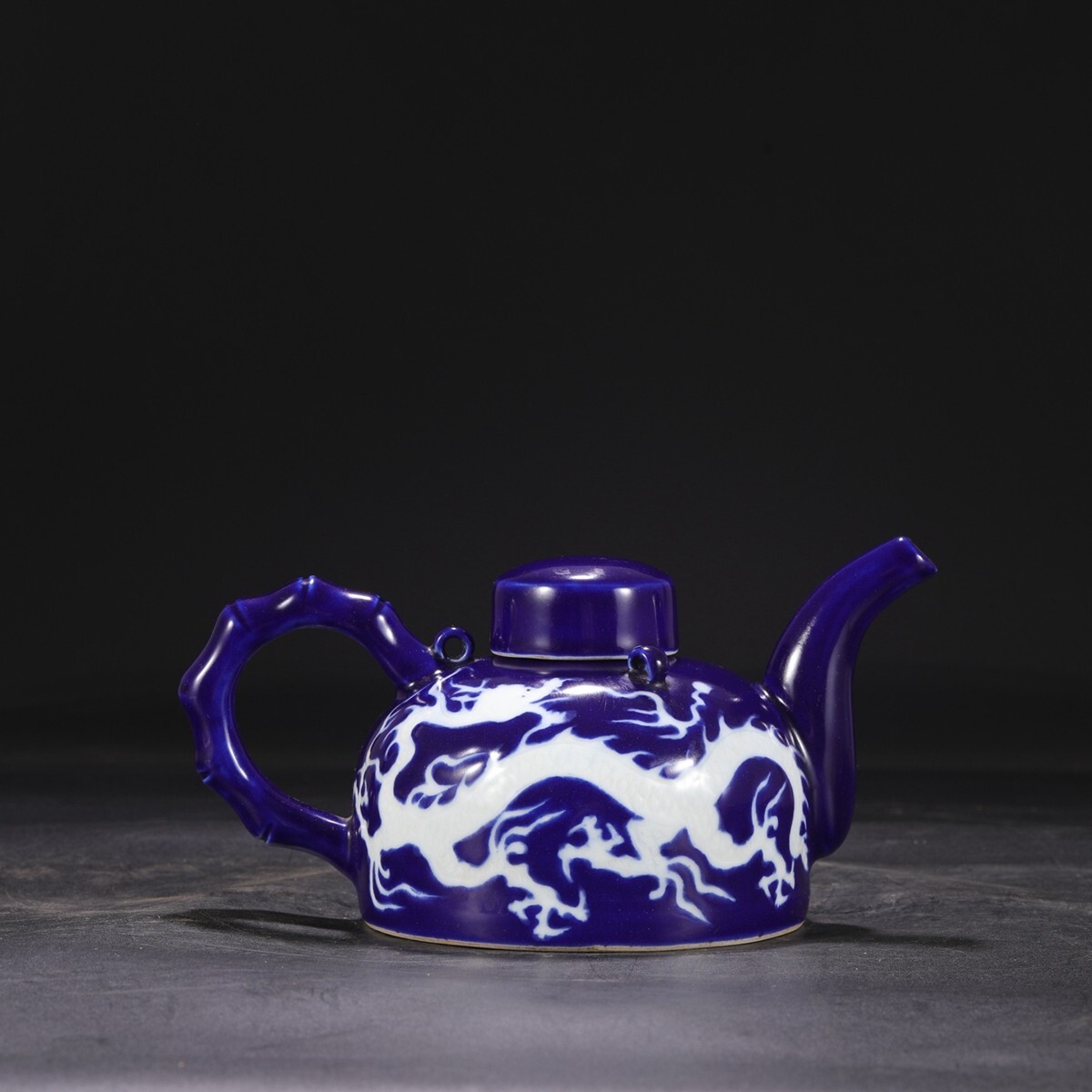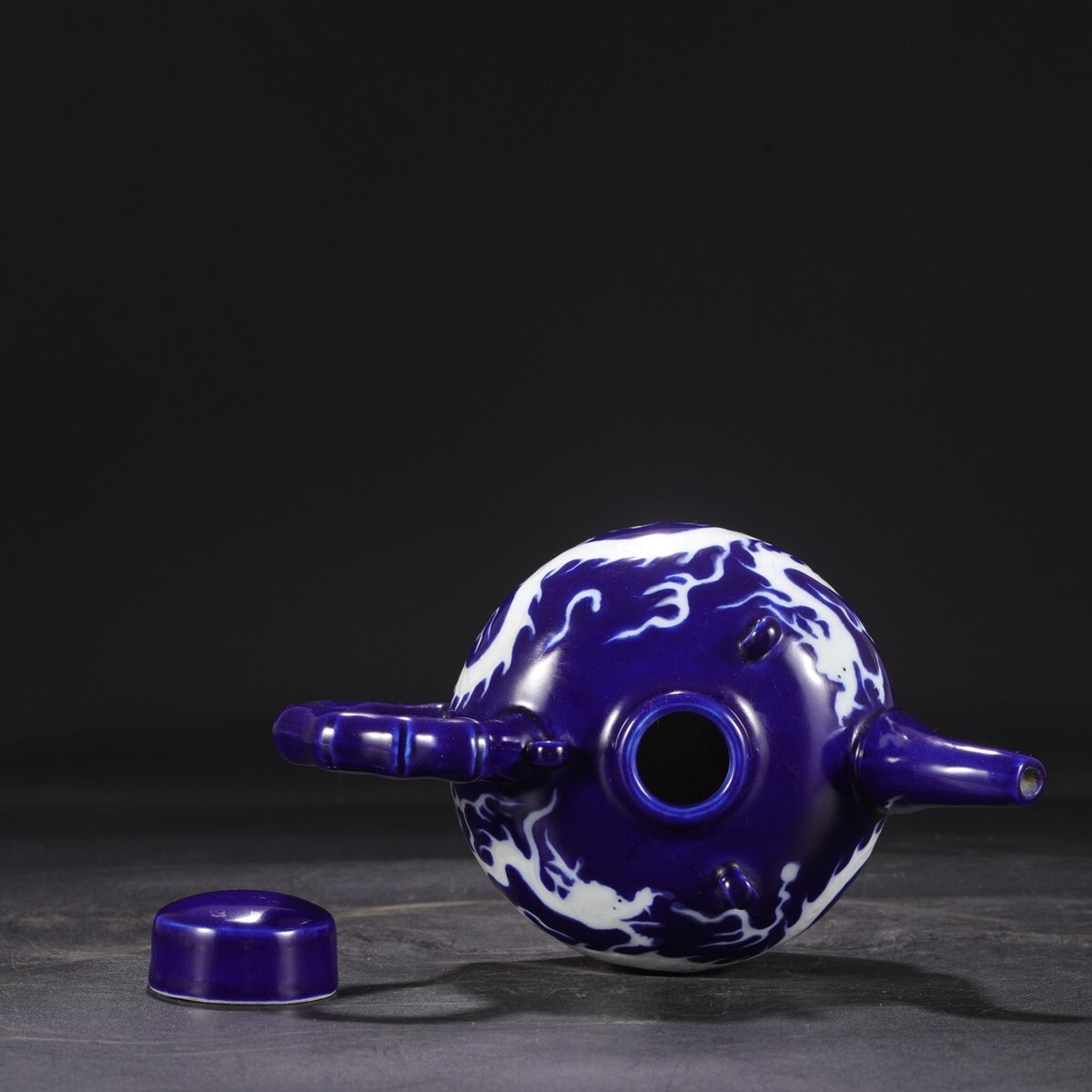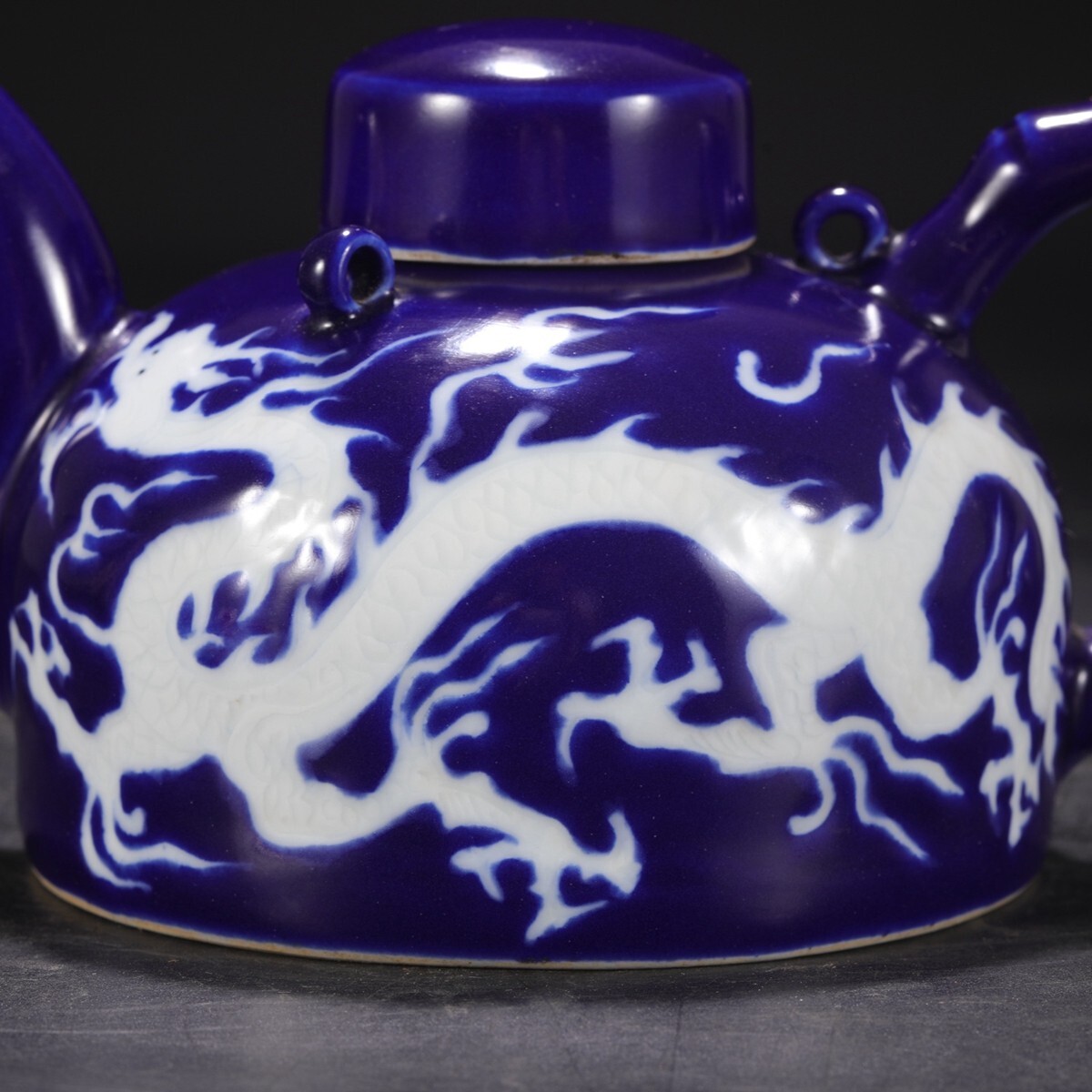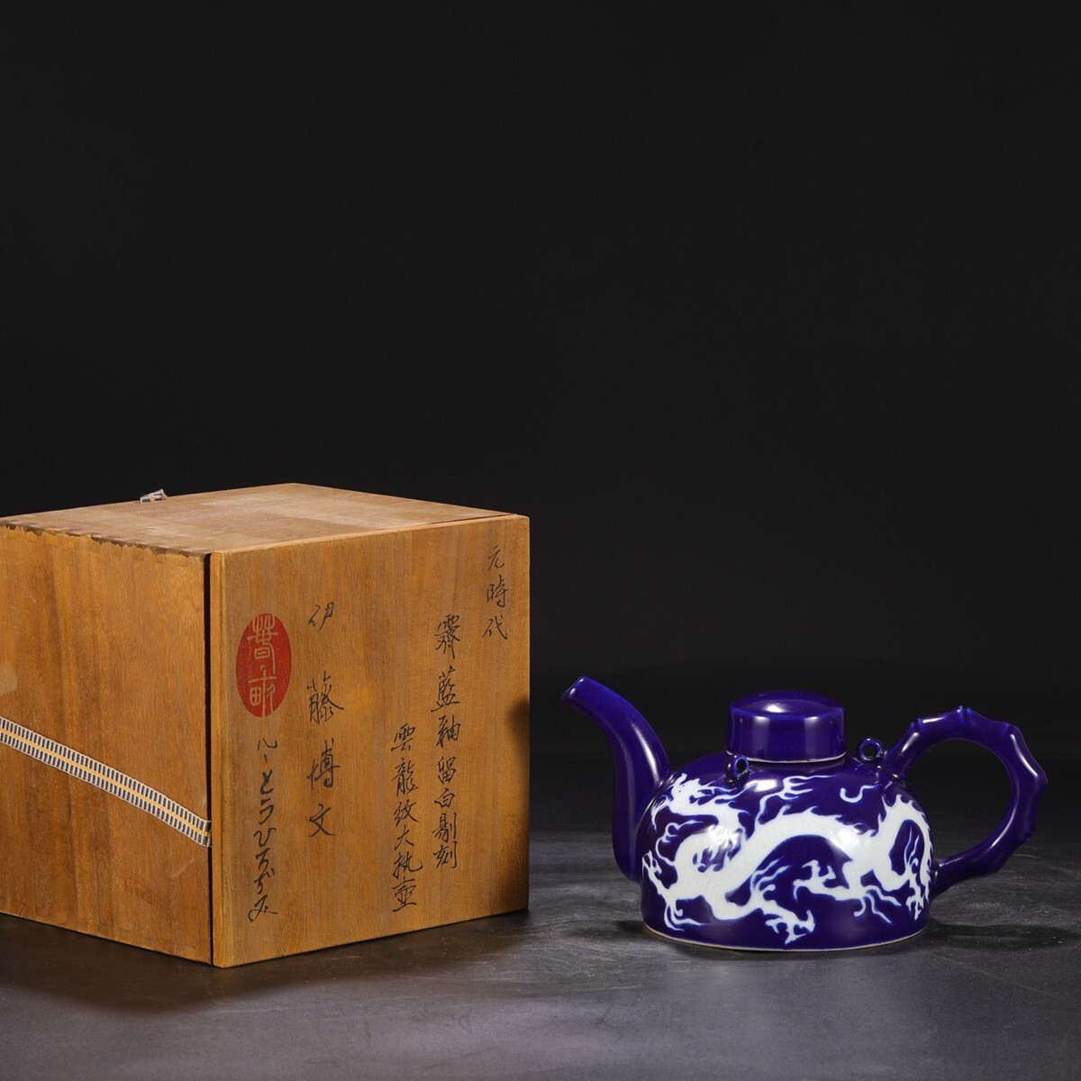「元時代 陶磁器 霽藍釉留白剔刻雲龍紋 大執壺」染付 置物 擺件 古賞物 中国古美術 旧蔵出