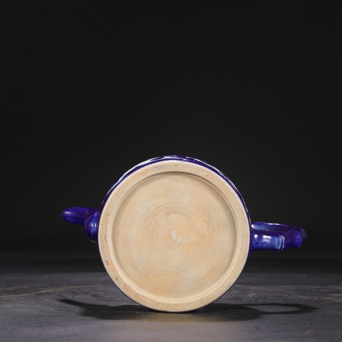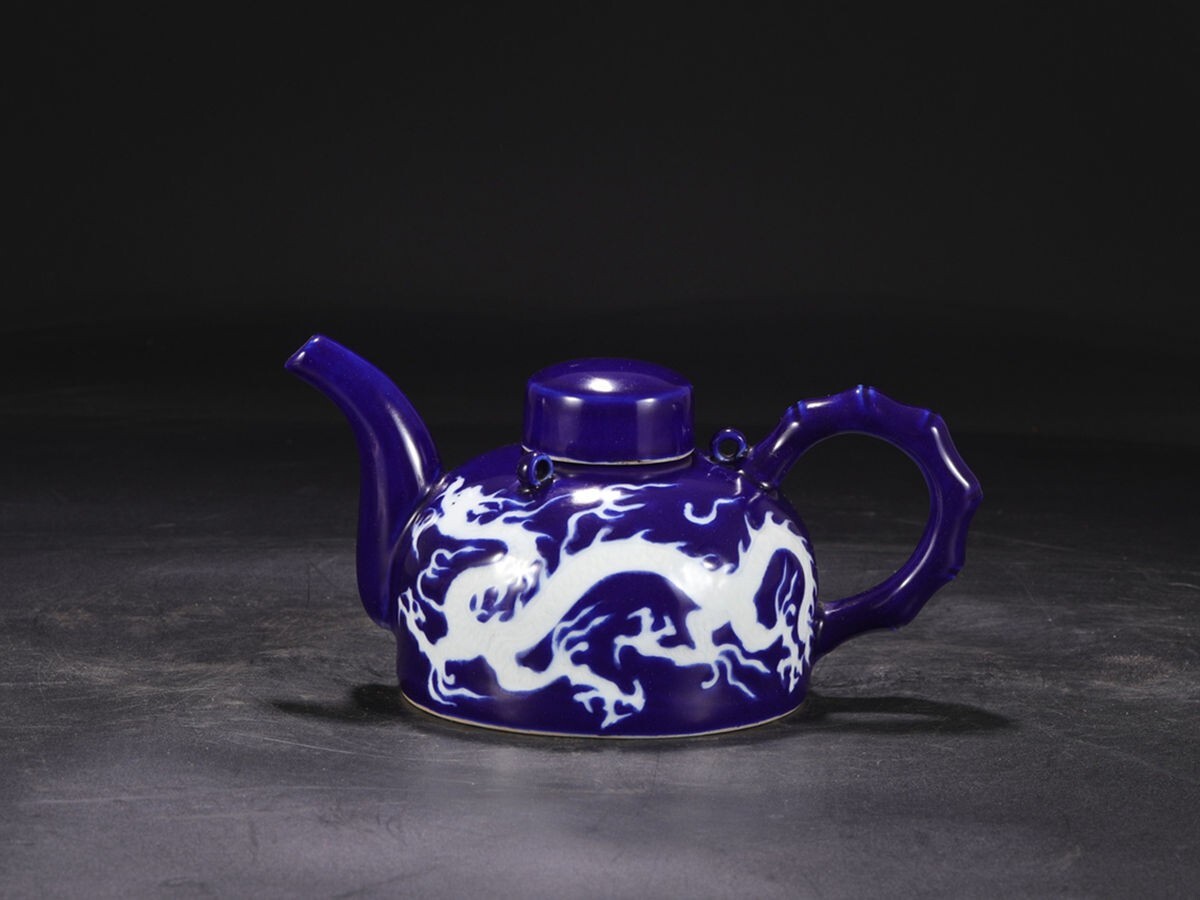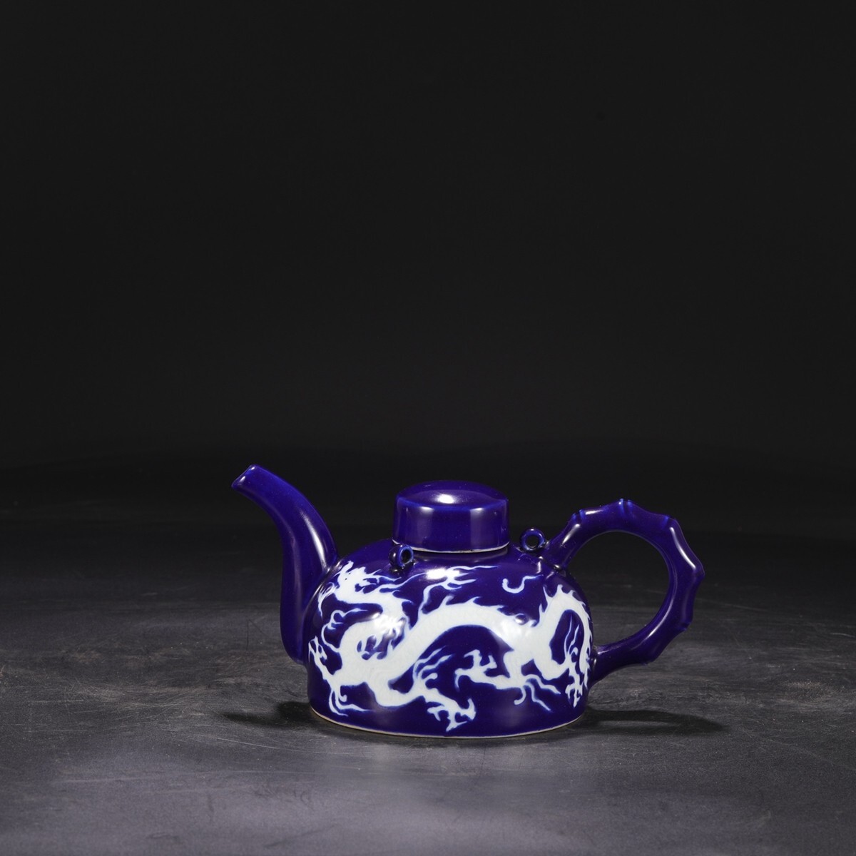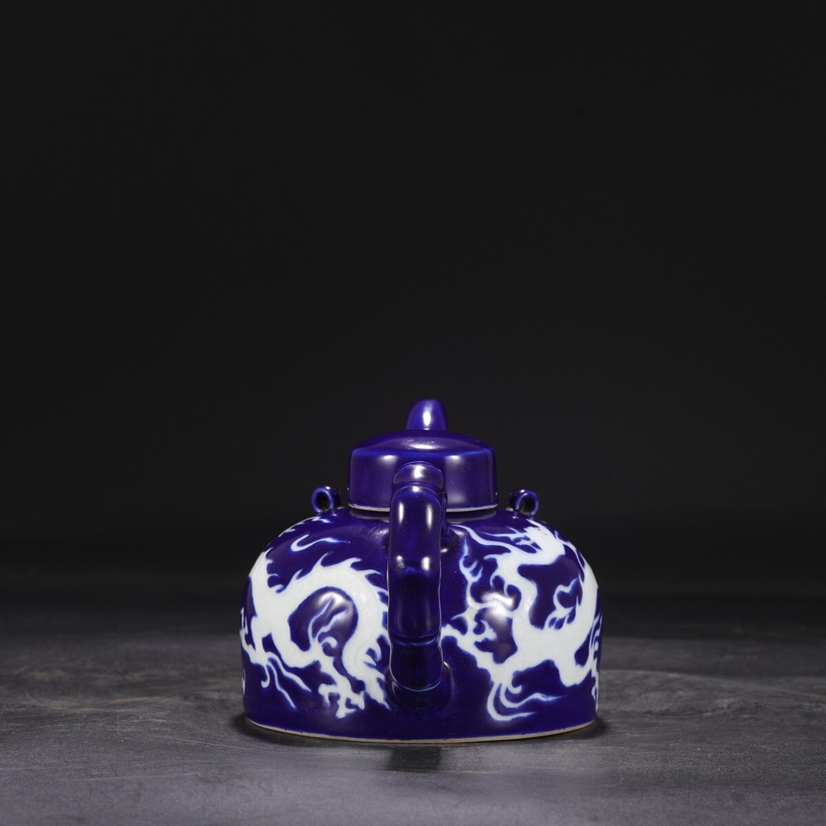 「元時代 陶磁器 霽藍釉留白剔刻雲龍紋 大執壺」染付 置物 擺件 古賞物 中国古美術 旧蔵出