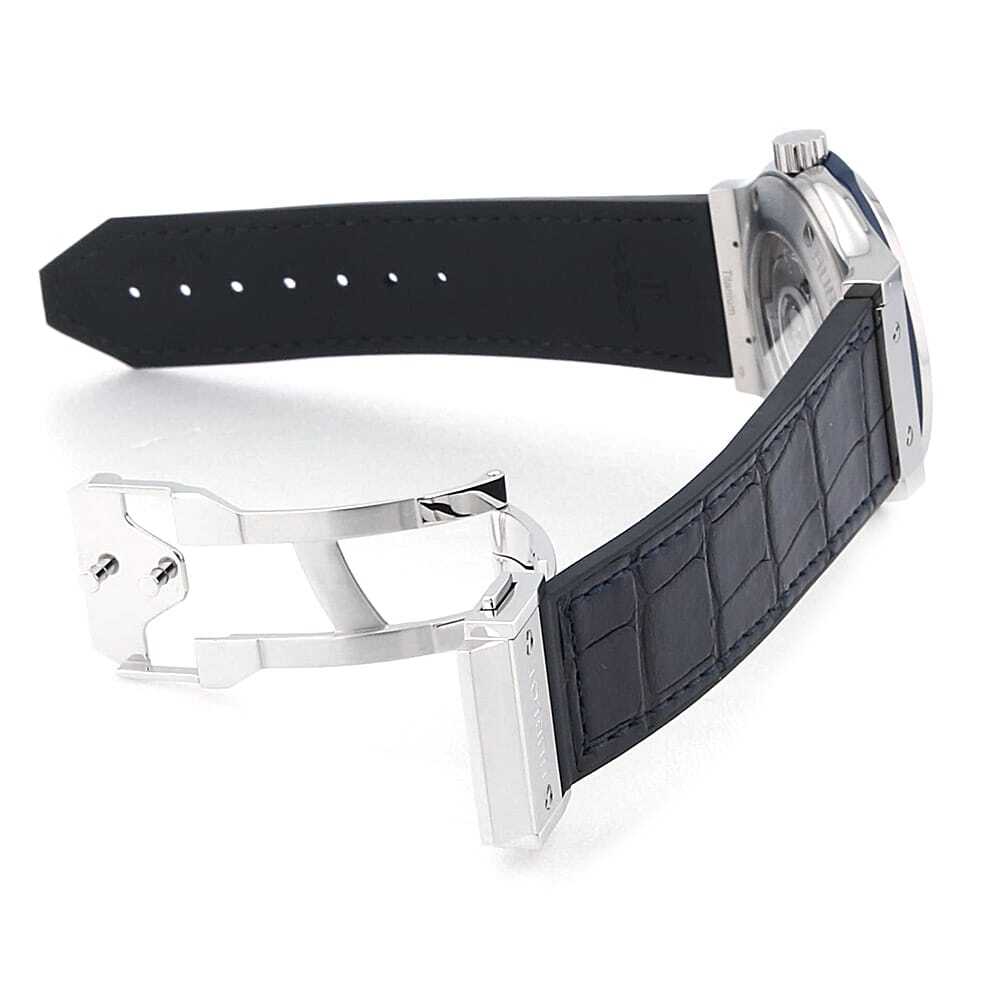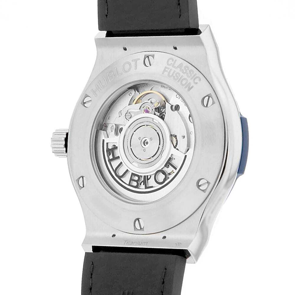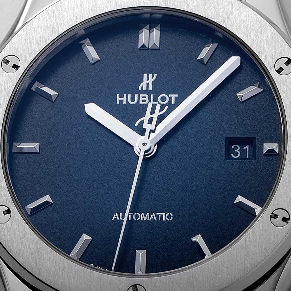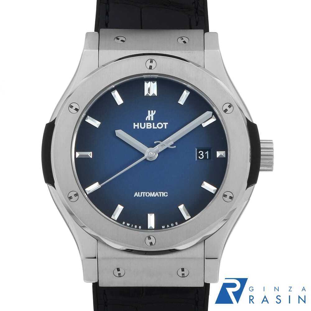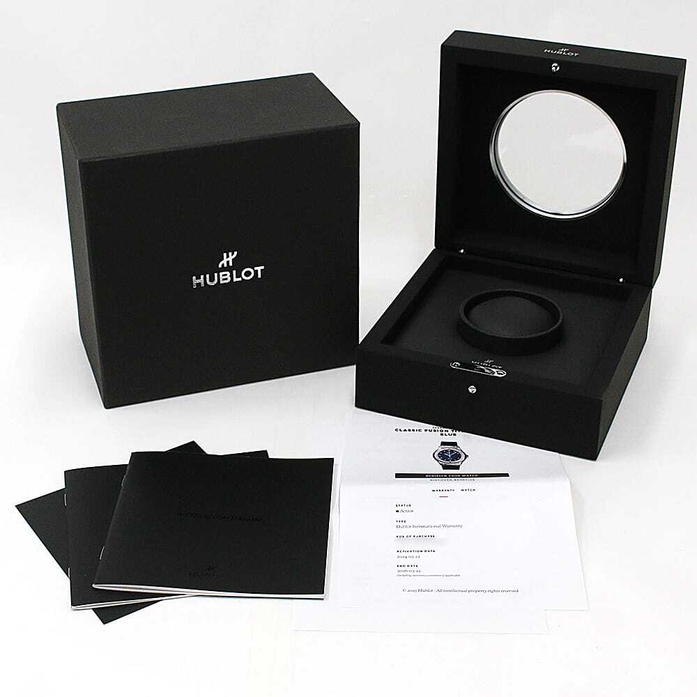 | モデル情報 | 大ヒット作"ビッグバン"から始まったウブロの新しいコンセプト"フュージョン"。こちらは2018年に発表された新色のディープブルー文字盤です。グラデーションカラーが綺麗な日本限定モデルとなっています。端正なデザインながら衝撃に強いチタンを使用しているため、エレガントさとスポーティーな雰囲気を両立しています。自動巻きCal.HUB1100を搭載。パワーリザーブ約42時間。5気圧防水。 |