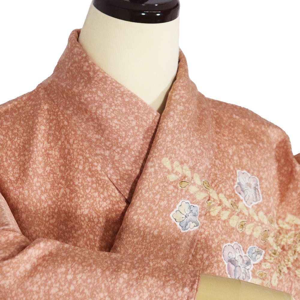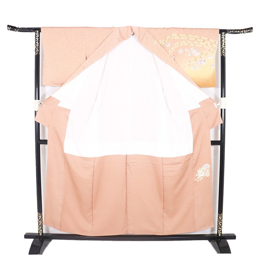 | コメント | 地色は和色大辞典より銀朱色・肉色・杏色・照柿色に 近いと思います。 右前身頃衽に作家落款入り。 袖丈短めです。 この訪問着は地色・柄はもちろんのこと 装飾などの細かい所にまでこだわっています。 模様も上品で、 照明や太陽の光にあたると、とても豪華にみえます。 とても上品な訪問着です。 生地の状態は良いと思います。 目立ったシミ汚れはないと思います。 美品です。 |