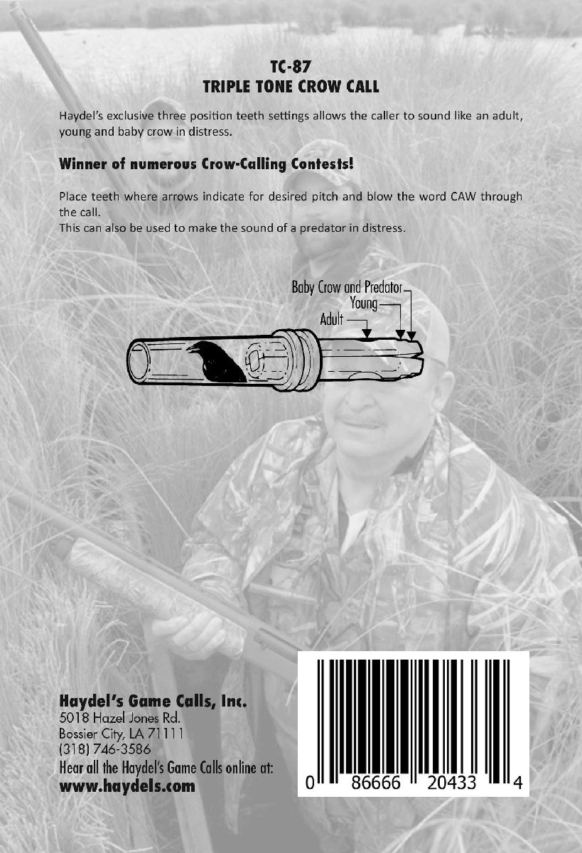 ブランド:Haydel'sGameCallsTC-87トリプルトーンクロウコール。Haydel独自の3段階の歯設定により、発信者が苦痛で大人、若者、赤ちゃんのカラスのように聞こえます。ホークの叫びは、リード横方向に吹くことで生成することができます。ゴブラーの位置決めにも効果的です。多数のクラウコーリングコンテストを受賞。マウスピース部分の噛む位置によって、大人や子供のカラスの声を出せるようになっています
