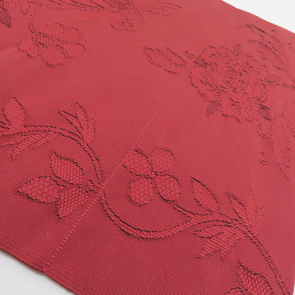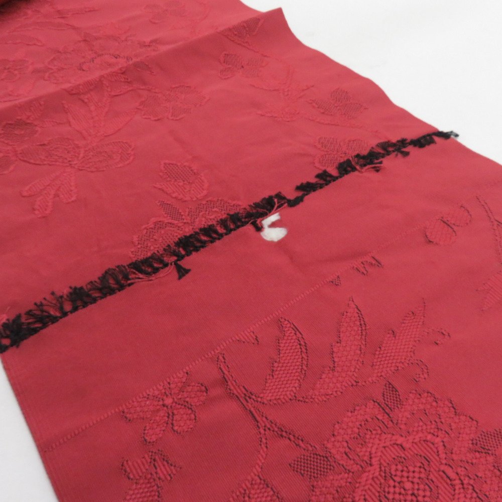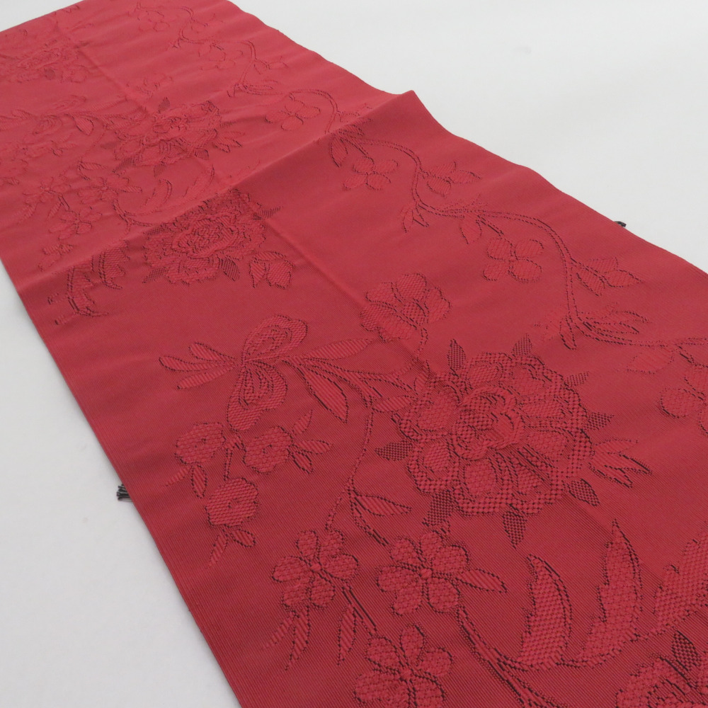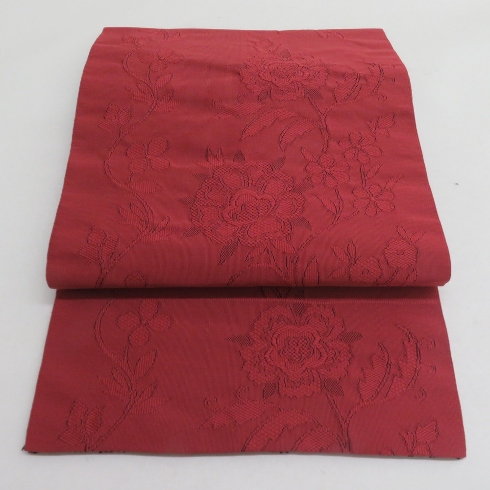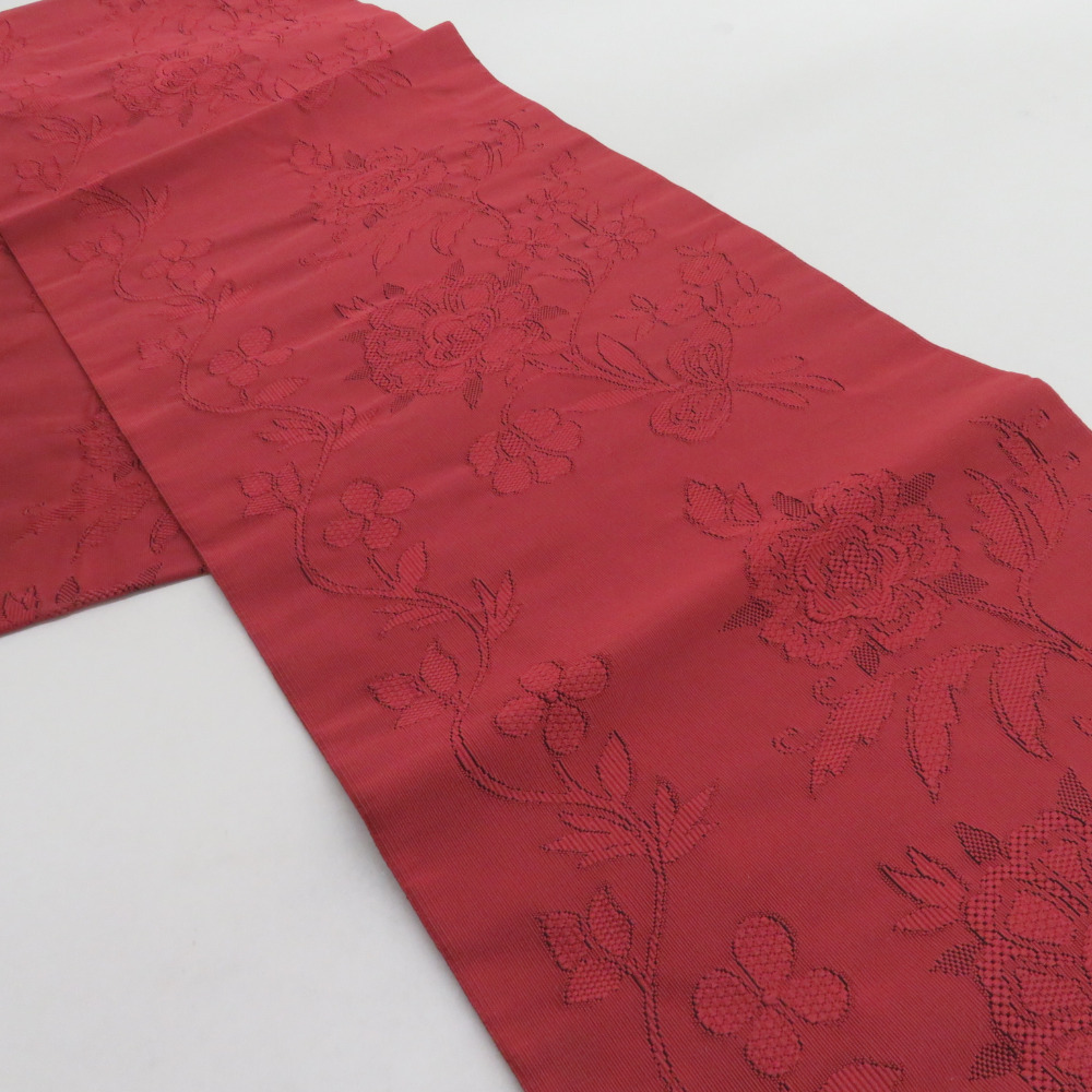 | 名古屋帯 綴れ 花唐草 正絹 赤紫色 全通柄 八寸帯 着物帯 長さ368cm |