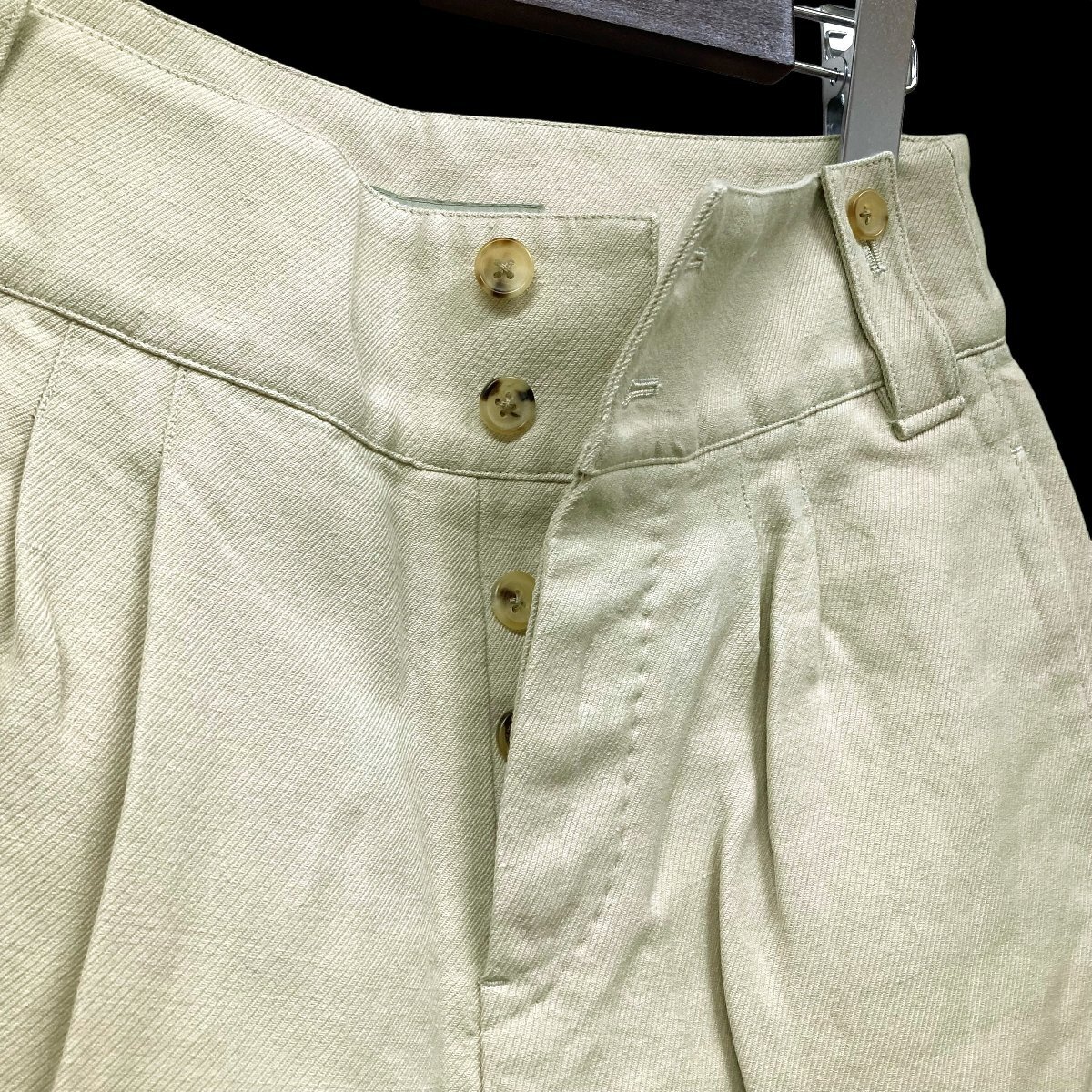フロントボタンフライ/ハーフ丈/ベルト通しあり/左右シームポケット/後ろ左右玉縁ポケット/日本製