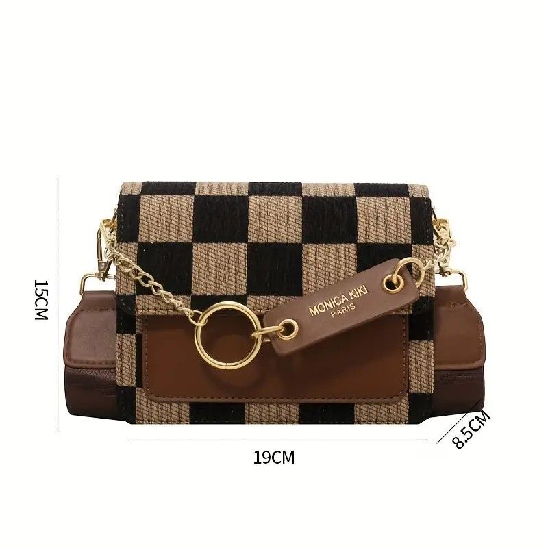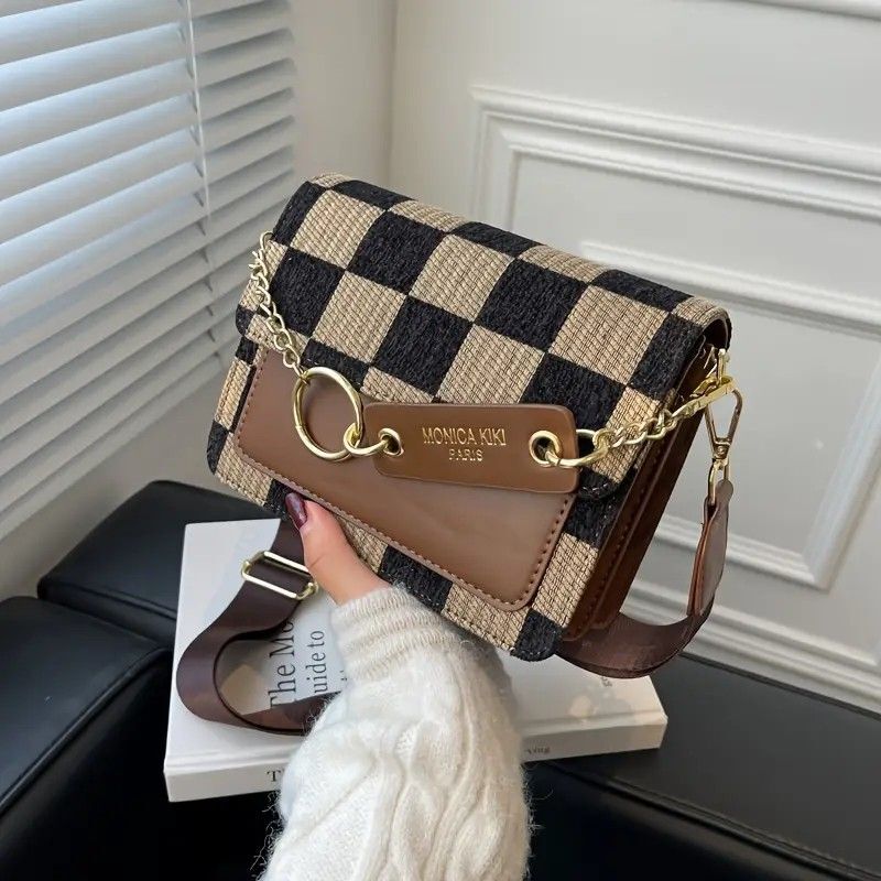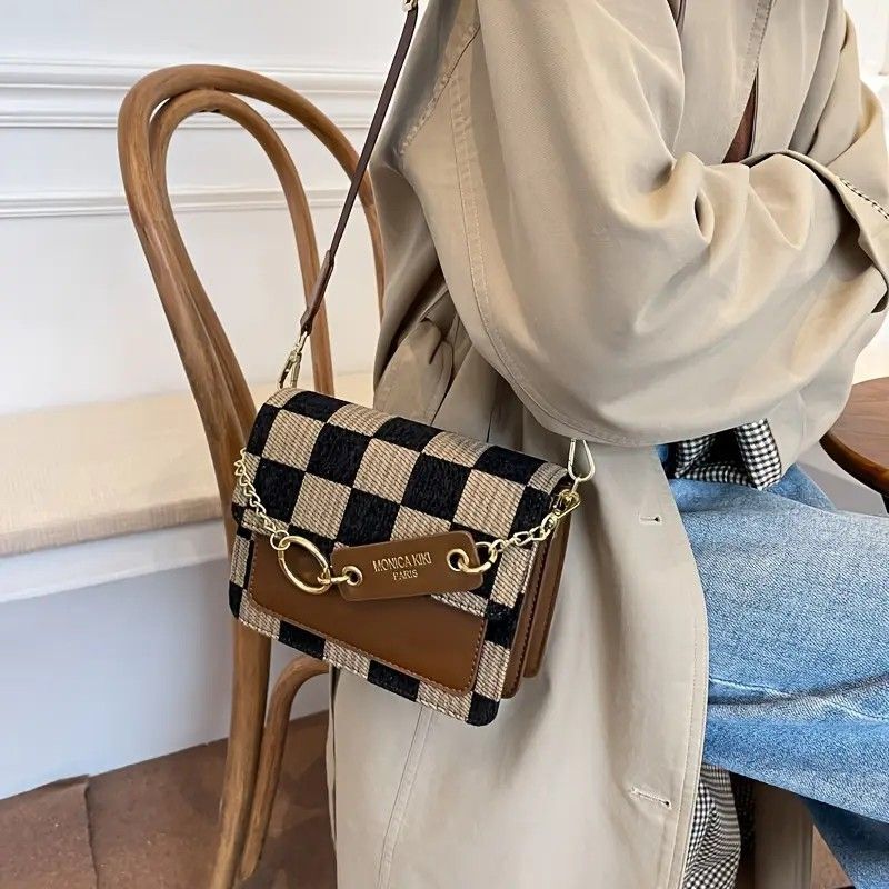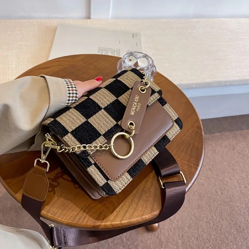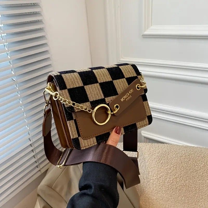 落ち着いたコーヒーベージュのチェック柄とゴールドトーンのハードウェアがアクセントの、コンバーチブルクロスボディバッグ。