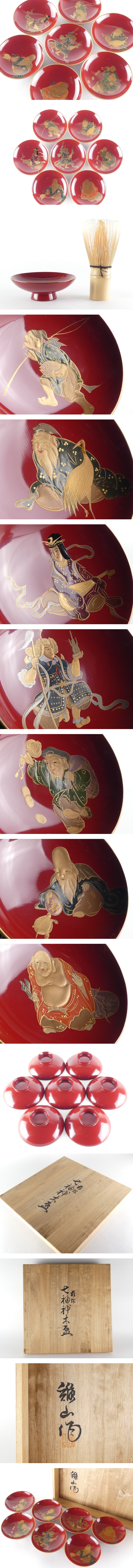 【扇屋】雄山 作「蒔絵 七福神木盃」共箱 幅 約9cm 高さ 約3cm 木製 朱塗 引盃 酒器 酒杯 漆芸