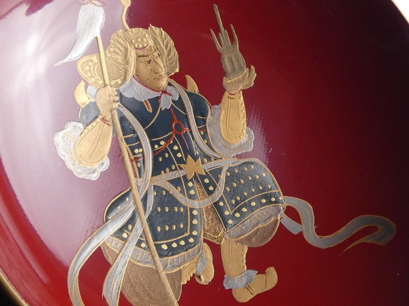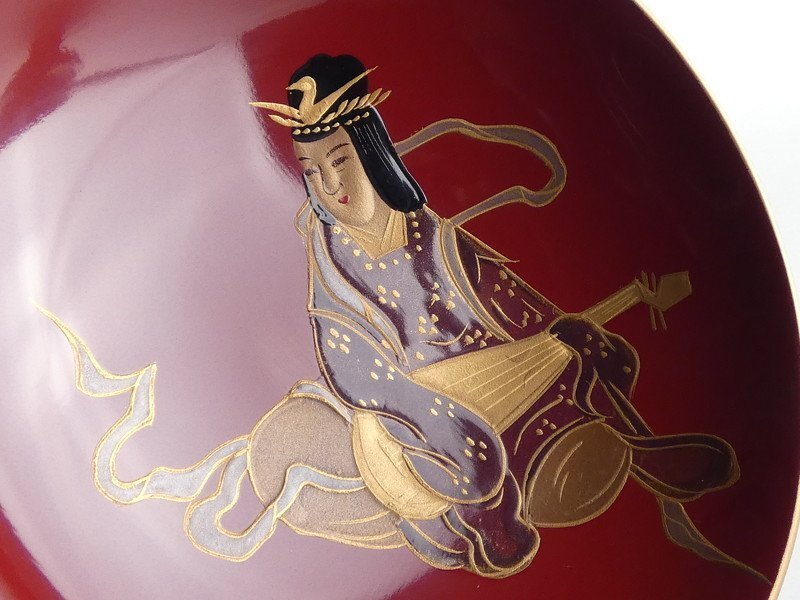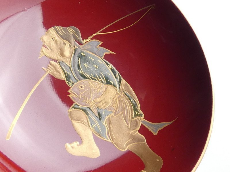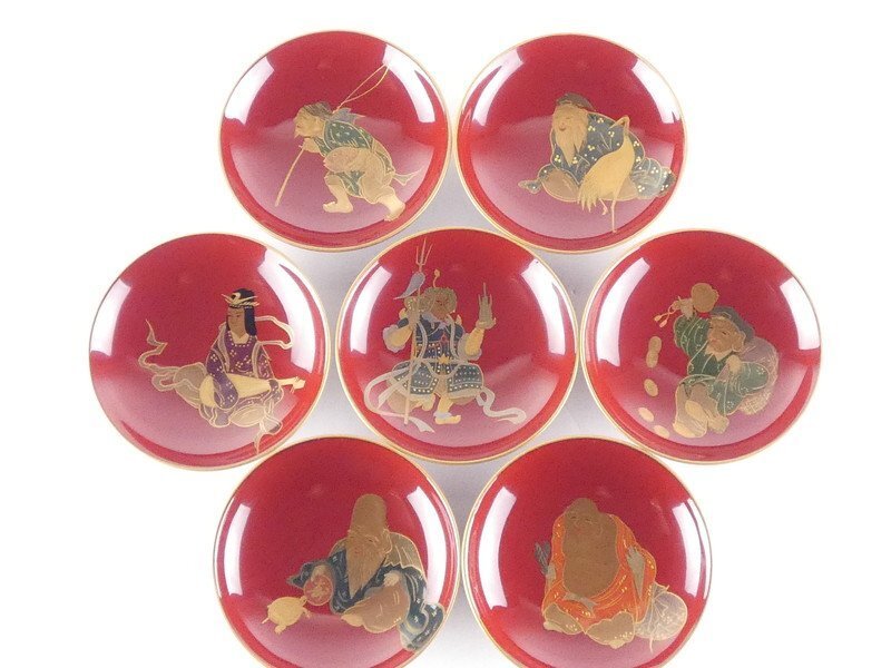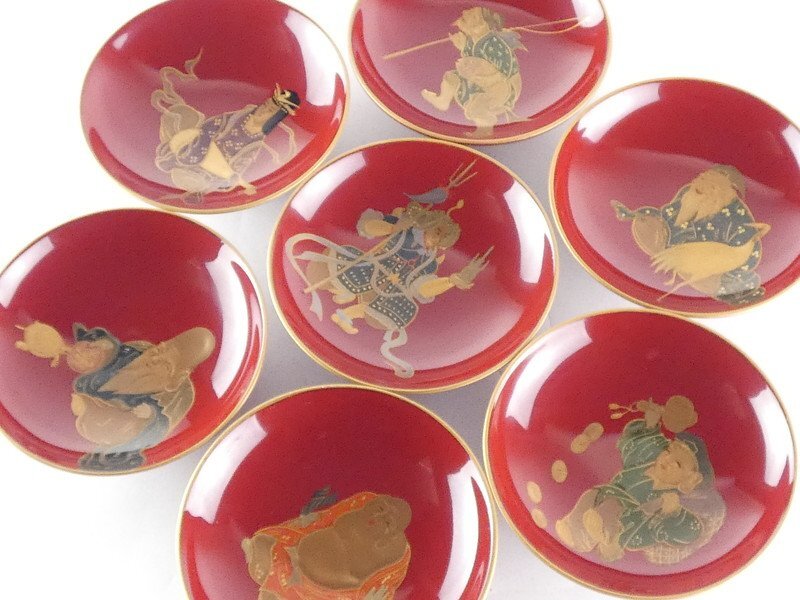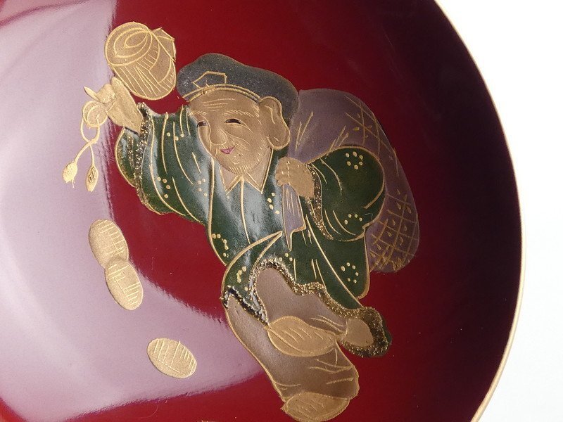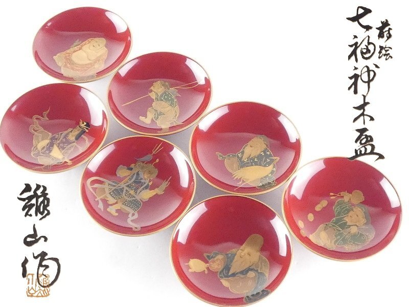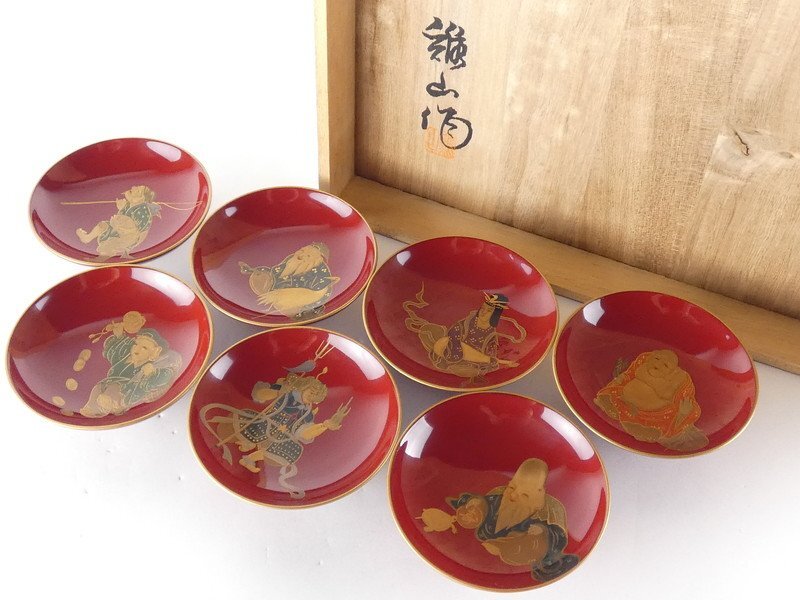【扇屋】雄山 作「蒔絵 七福神木盃」共箱 幅 約9cm 高さ 約3cm 木製 朱塗 引盃 酒器 酒杯 銚子 漆芸 茶事 茶席 茶懐石 懐石道具 C-3 mono