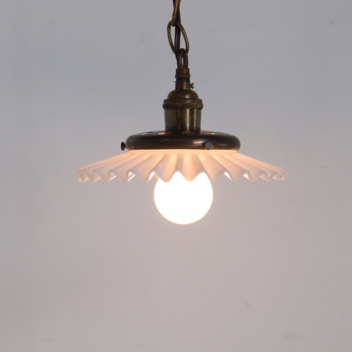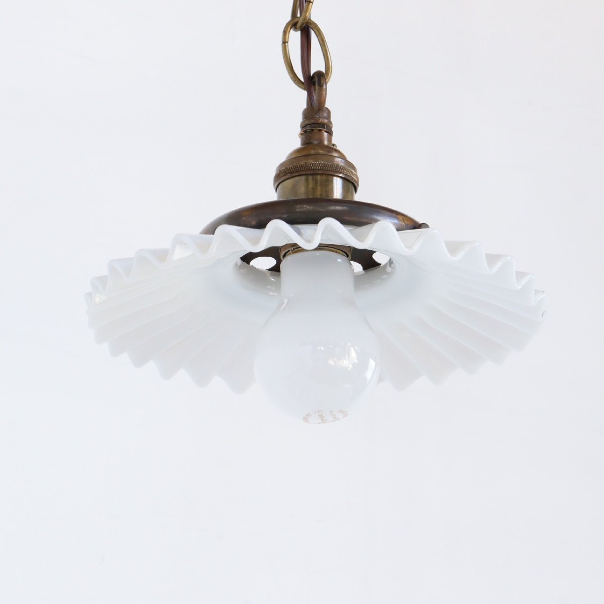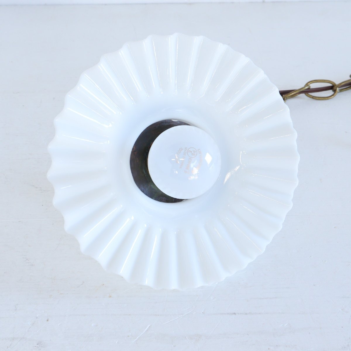 商品説明 explanation | 推定1930年から40年代頃のヴィンテージのフリルガラスペンダントランプです。 フリル型のシェードがとても魅力的で、ホワイトカラーのガラスが、優しく温かみのある光を灯してくれます。 アールデコ調の雰囲気で飾るだけでお部屋のアクセントになります。 ご自宅やお店の照明にいかがでしょうか。 |