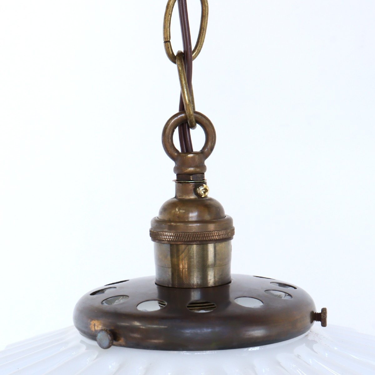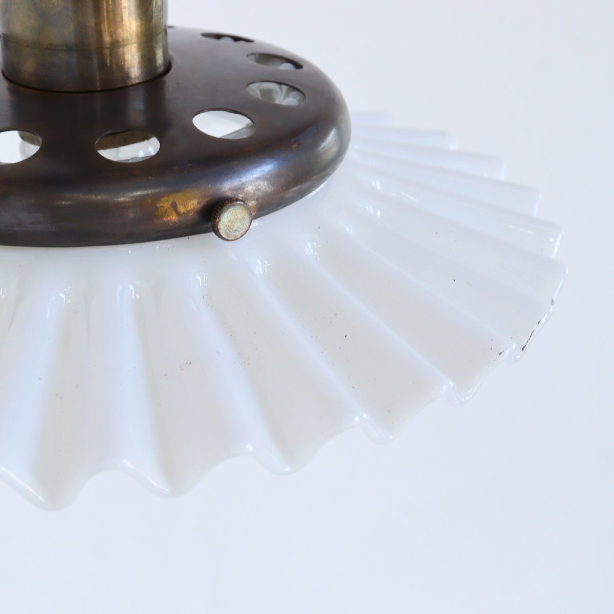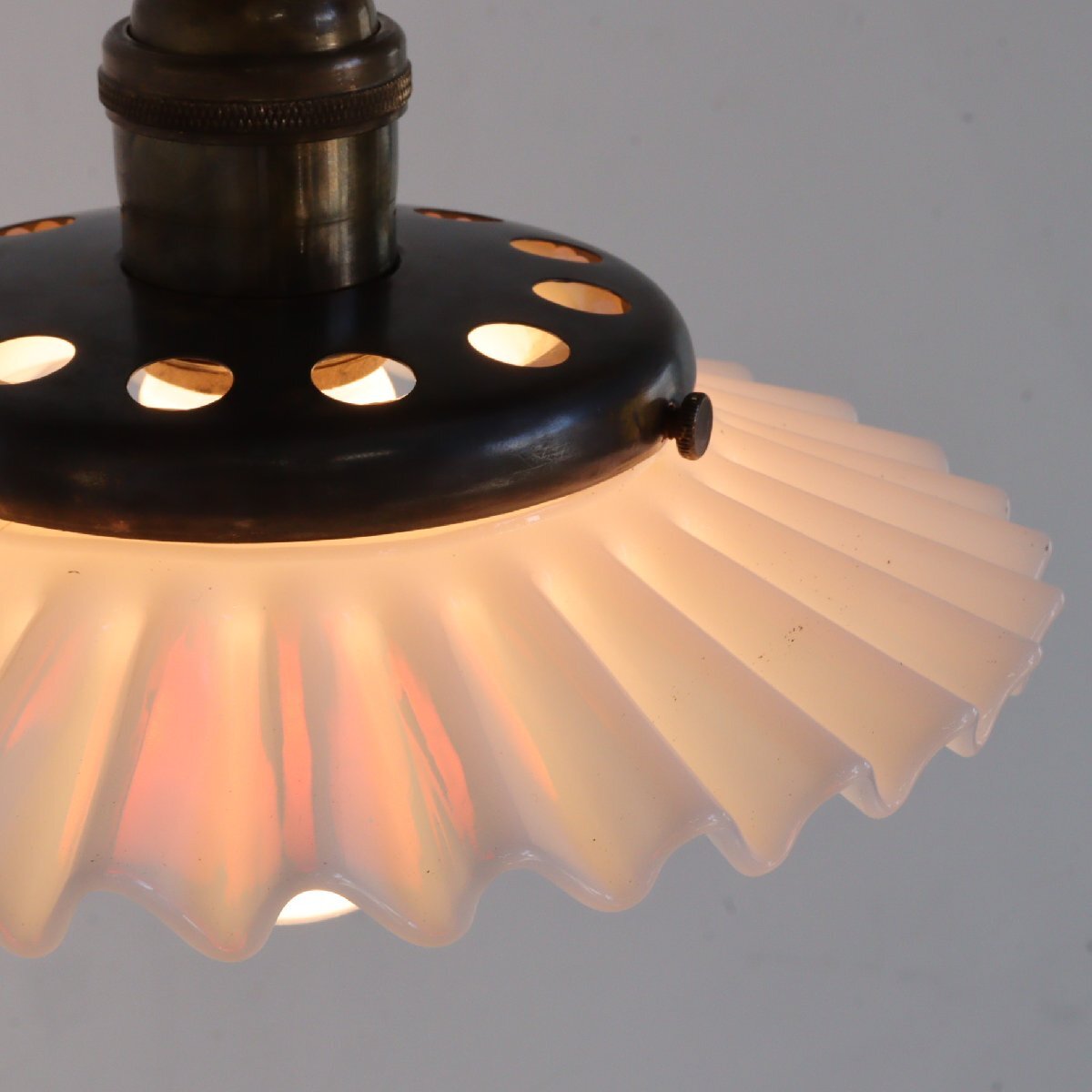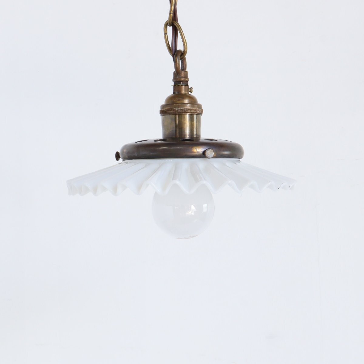 商品説明 explanation | 推定1930年から40年代頃のヴィンテージのフリルガラスペンダントランプです。 フリル型のシェードがとても魅力的で、ホワイトカラーのガラスが、優しく温かみのある光を灯してくれます。 アールデコ調の雰囲気で飾るだけでお部屋のアクセントになります。 ご自宅やお店の照明にいかがでしょうか。 |