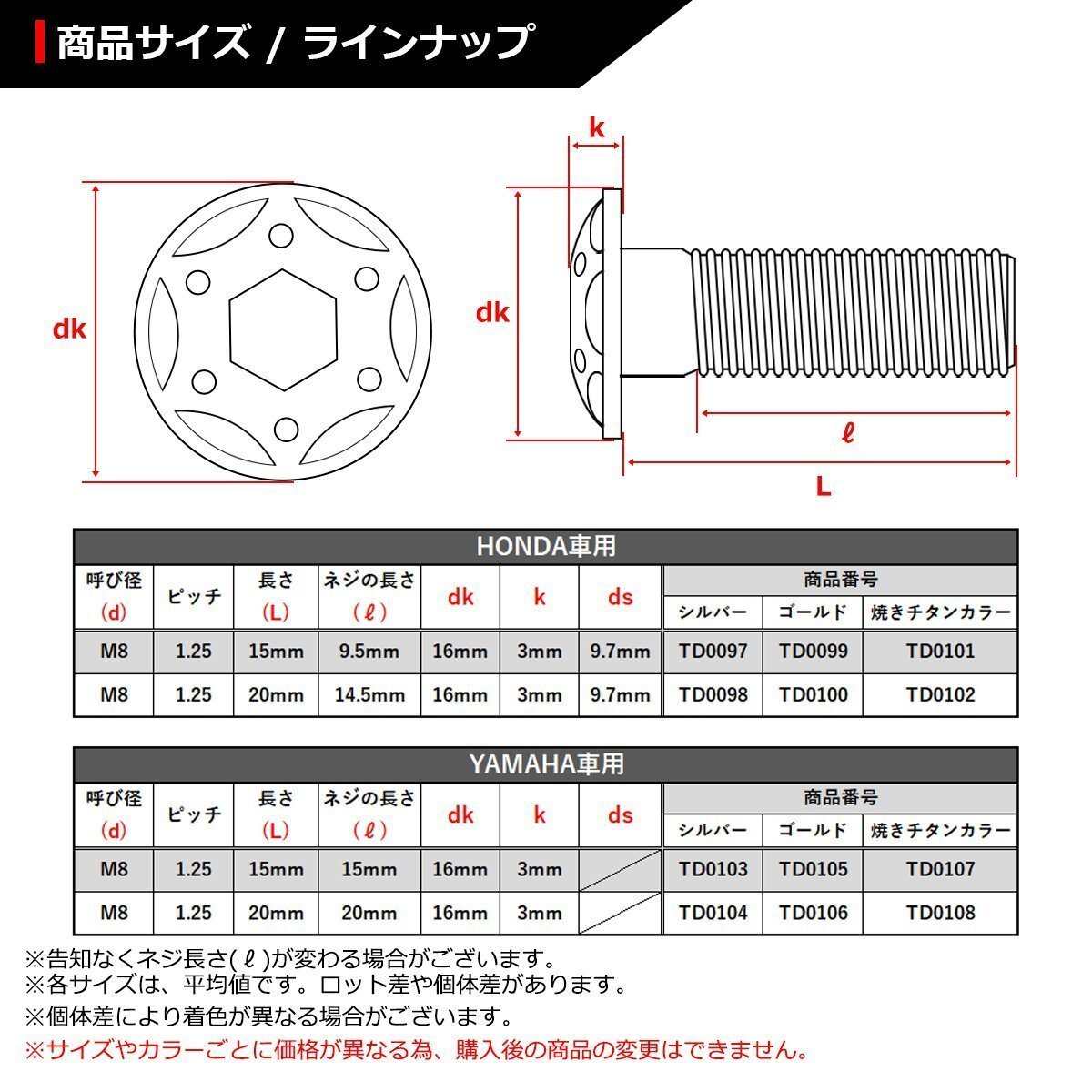ブレーキディスク ローターボルト ホンダ用 スターホールヘッド 数量:1個売り 材質:ステンレス 頭部穴形状:六角穴付き 商品サイズ:M8×20mm P1.25(詳細は画像に掲載。各サイズは、平均値です。ロット差や個体差があります。) ネジの長さ:14.5mm(告知なしで変更の時あり、詳細のサイズが必要な場合は要問い合わせ) 適合車種:ホンダ汎用。この形状は、ホンダのバイクでよく使用されておりますが、他のボルトが使用されている場合がございます。サイズ等でご判断ください。なお、適合車種に関しての回答は致しておりません。 商品カラー:ゴールド ※個体差により着色が異なる場合があります。 ※サイズやカラーごとに価格が異なる為、購入後の商品の変更はできません。 また、ご購入数しかお取引ができません。 数量以上ご必要の場合は、ご入札前にご質問ください。 在庫がございましたら別途出品させていただきます。 |