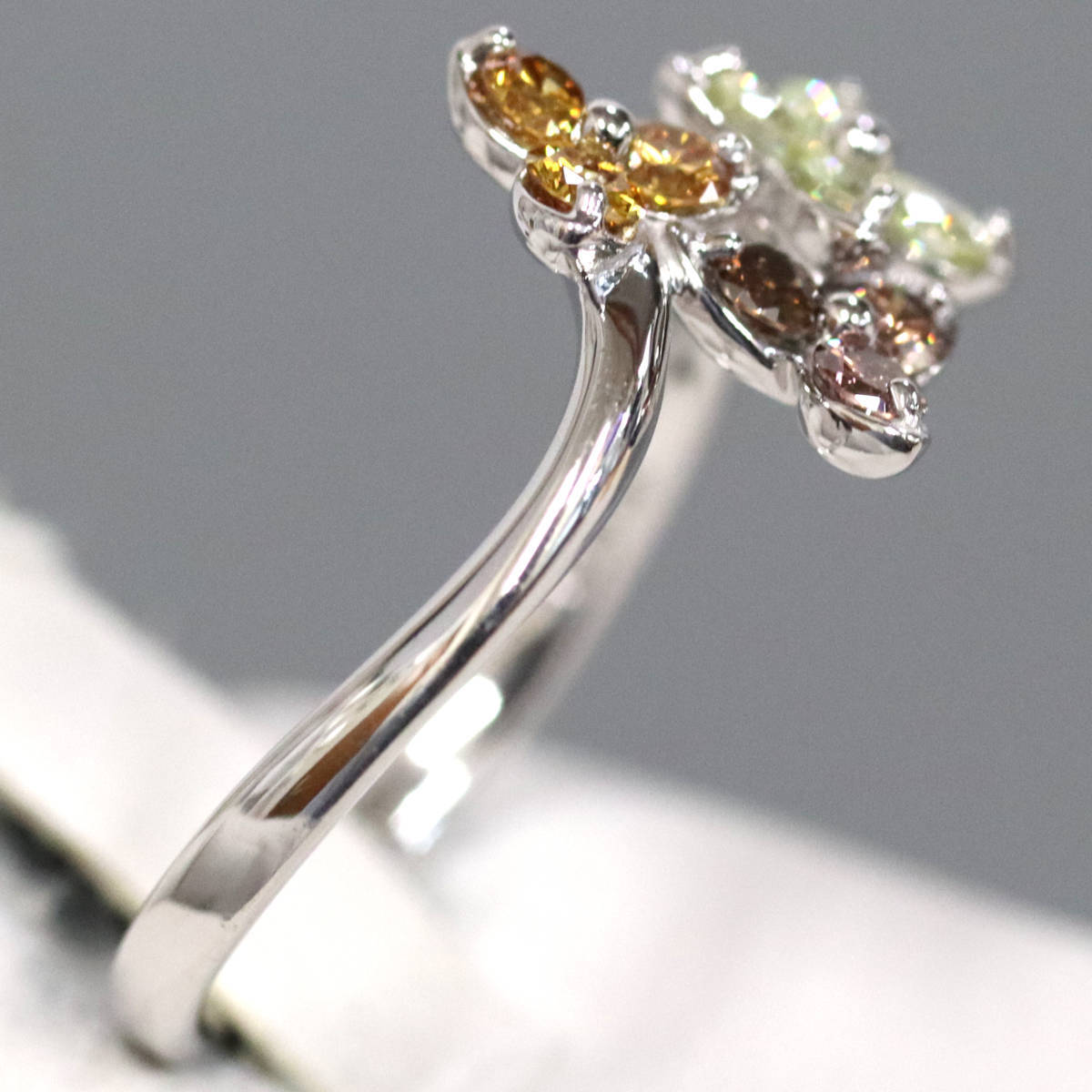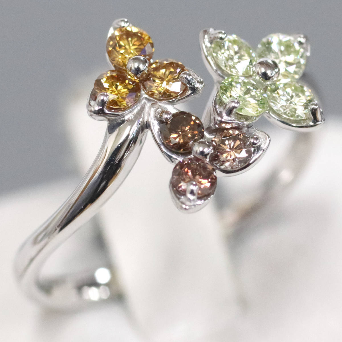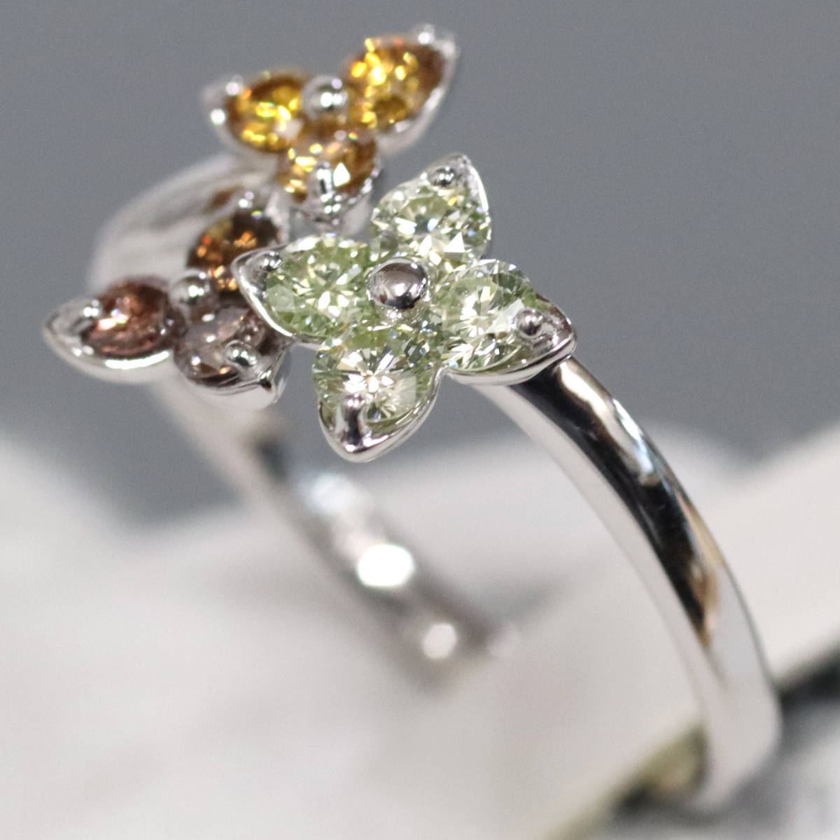 | K18WGマルチカラーダイヤモンドリングの中古品です。 鑑別書が付属します。 天然ダイヤモンドと鑑別されていますが、色の起源は不明です。 ダイヤモンドはわずかにインクルージョンがありますが、肉眼では見えません。 ダイヤモンドの表面には部分的に天然の欠けがあります。 ダイヤモンドは照りよく輝きます。 地金にはわずかに小傷があります。