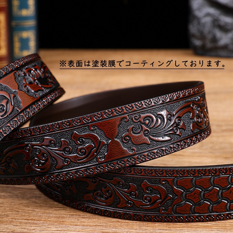 【カービング型押し】しなやかで馴染みやすい革にカービングの型押しを施し、重厚感のあるヴィンテージバックルを合わせました。コーディネートのアクセントとして大活躍のカジュアルベルトです。ウェスタン風のコーデにはもちろん、デニム、ジーンズに相性抜群です。