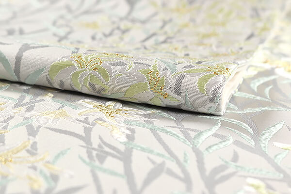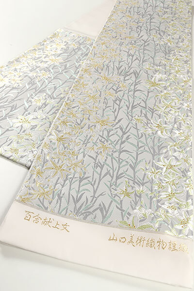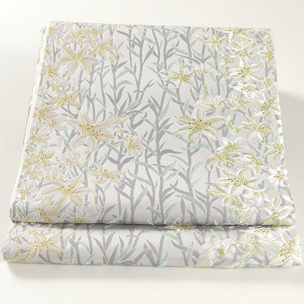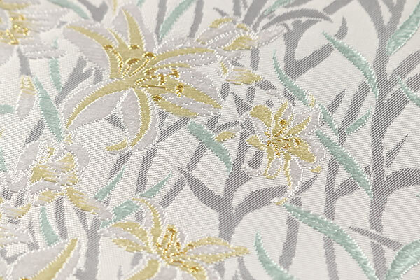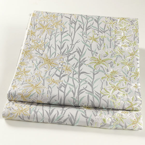 「百合献上文」と題されたこちらのお品は、白色の地にシルバーの引き箔が施され、光沢感がございます。 白色・薄い黄緑色・灰水色・クリーム色などのキレイなお色目で百合の花が見事に織り上げられております。 模様には金糸が織り込まれており、柄行にアクセントを添えております。繊細な模様が品のあるお着物によく合うことでしょう。