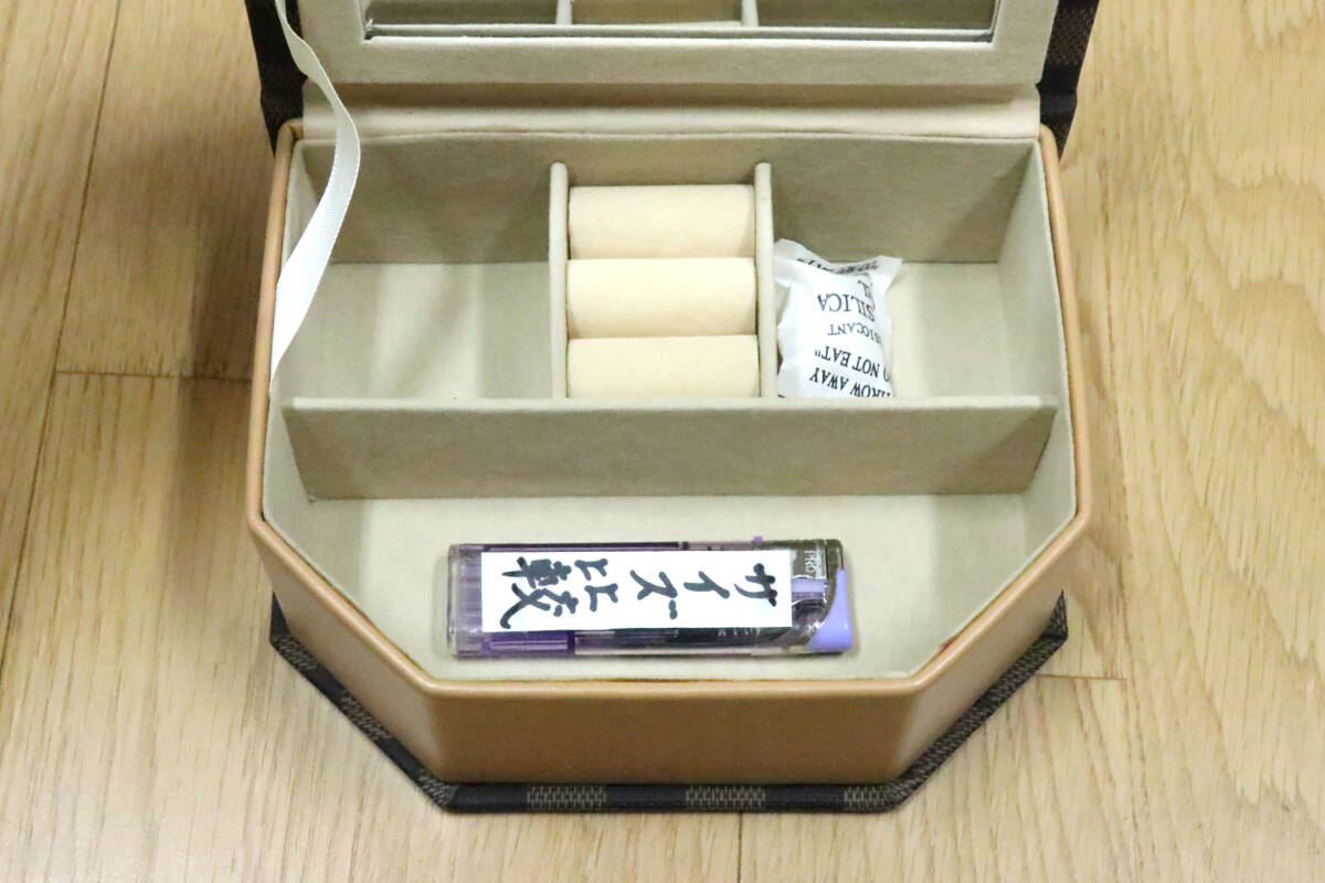 アクセサリーケースになります。未使用の保管品です。外箱はありません。写真で判断お願いします。写っている物が全てになります(ライターは付属品ではありません)。大きさは横16.5㎝、奥行き13㎝、高さ6㎝です。