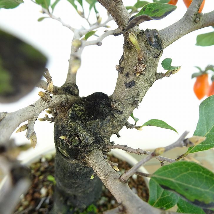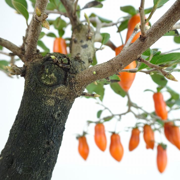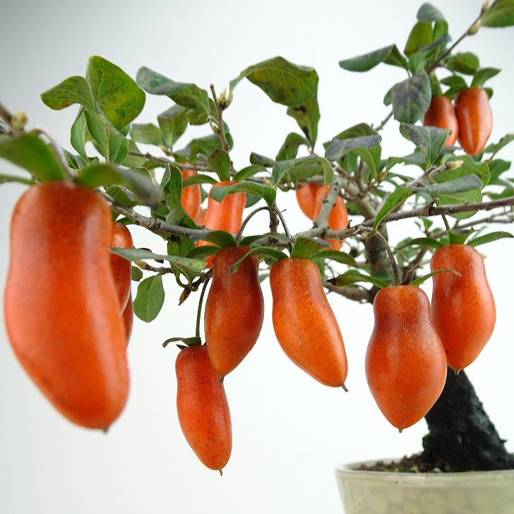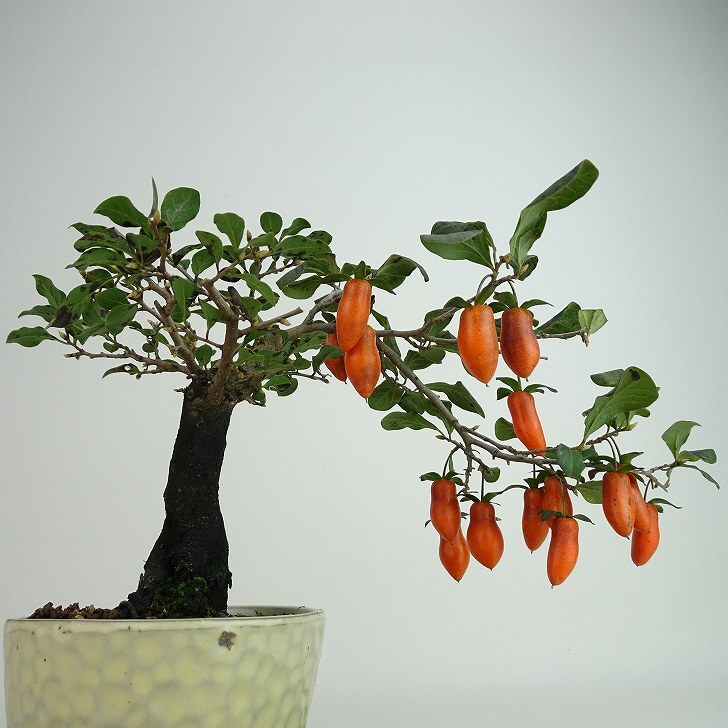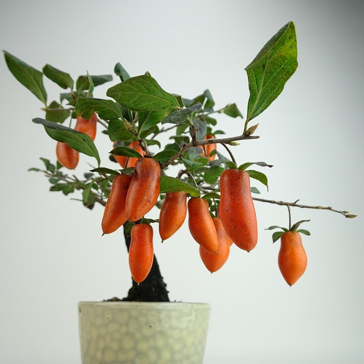 ■植物ですので撮影時期や季節によって剪定などの手入れにより写真から変化がございます。撮影日をご確認のうえ、ご注文ください。 ■翌年の実付きをよくするために葉が落ちた後の11月末~12月にかけて摘果しています。お届けの商品にはロウヤガキの実がない場合がございます。 ■老爺柿の種類は沢山あり、品種の記載がない商品は仕入れの時点で確認ができておりませんので、その旨ご了承のほどお願いいたします。 【老爺柿盆栽】 開花時期は4~5月頃に花を咲かせます。雌雄異株で、実を成らすためには雌木と雄木が必要になります。小さな実が成る渋柿で、実が枝にぶら下がって成る特徴があります。老爺柿は沢山の品種があり、実の形状や色も様々で、丸い形から細長くとがったもの、大きさも大小があり、色合いも赤みを帯びた橙色から黄色、朱赤など豊富にあります。 |