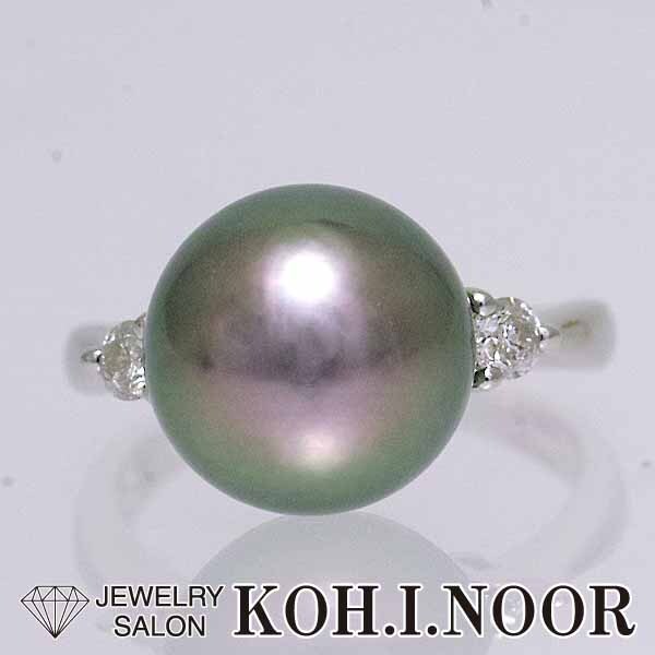 オーロラピーコックの黒蝶真珠にダイヤを添えたプラチナ製のファッションリング。