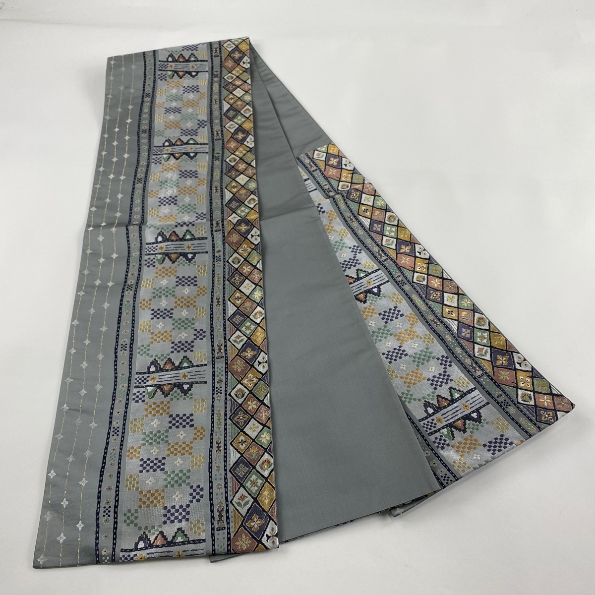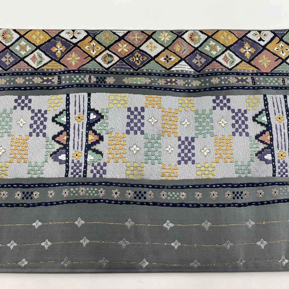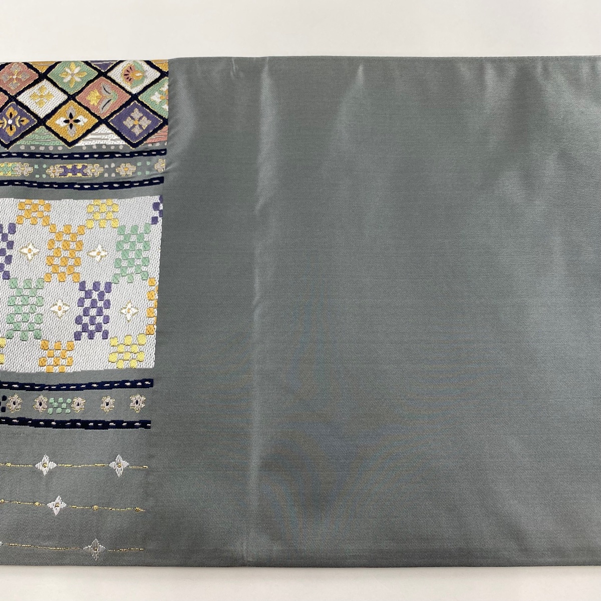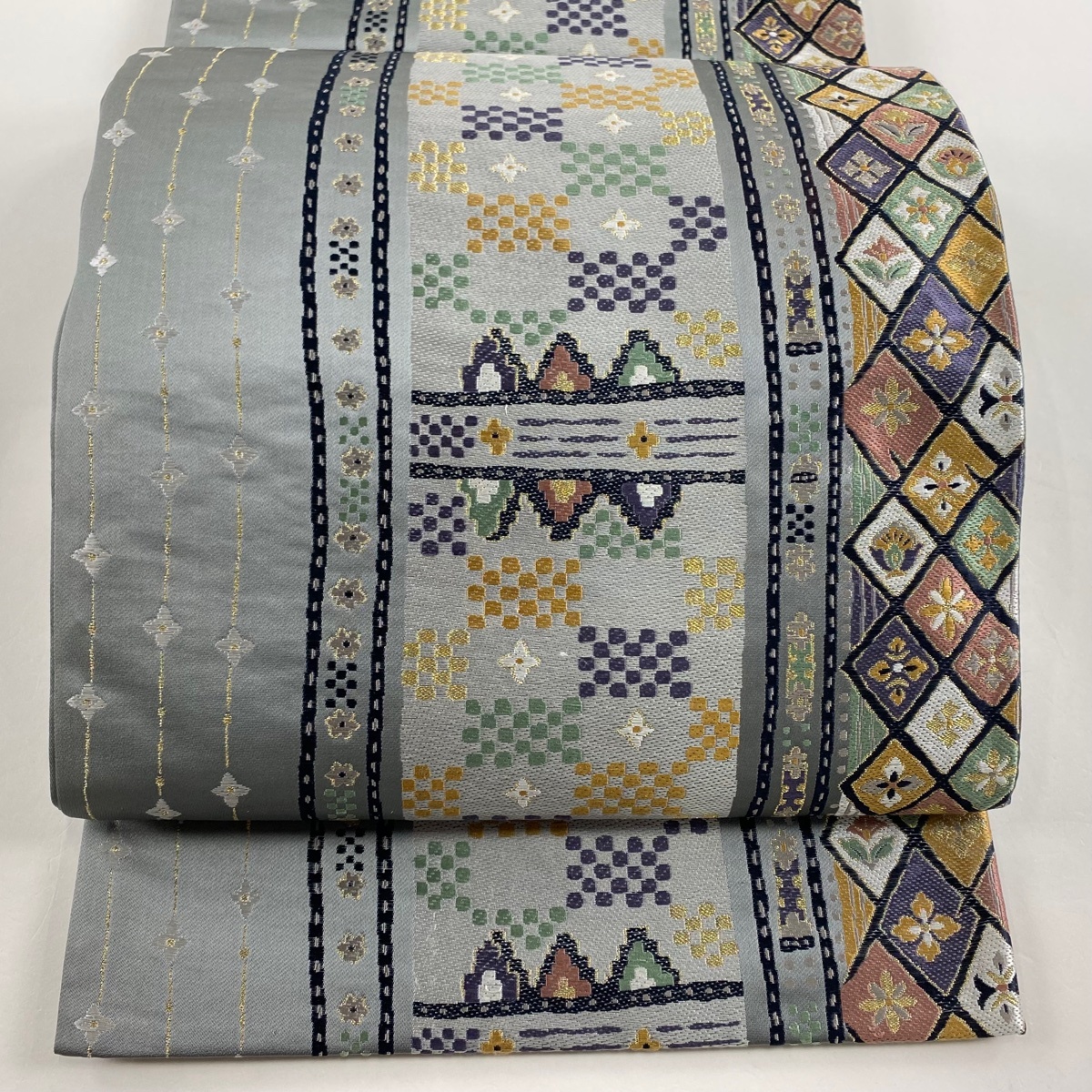 | 袋帯 美品 名品 花 縞 金糸 刺繍 灰緑 六通 正絹 【中古】 |
