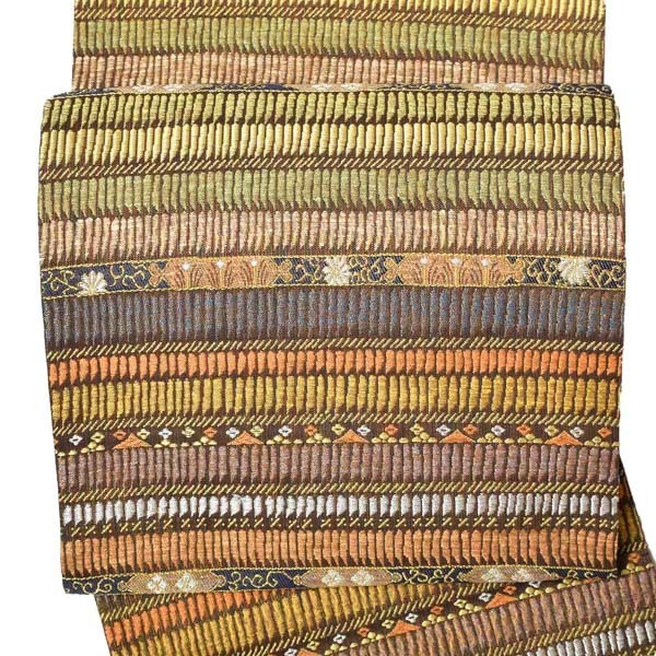 (新古品)仕立て上がり 袋帯 「こげ茶 甲冑文様」 (メール便不可)