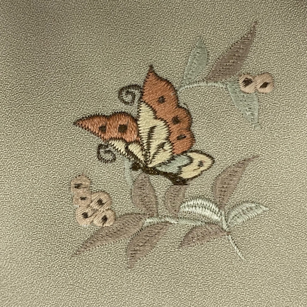 | 付下げ 秀品 檜扇 草花 刺繍 金糸 灰緑 袷 身丈161 裄丈65 M 正絹 【中古】 |
