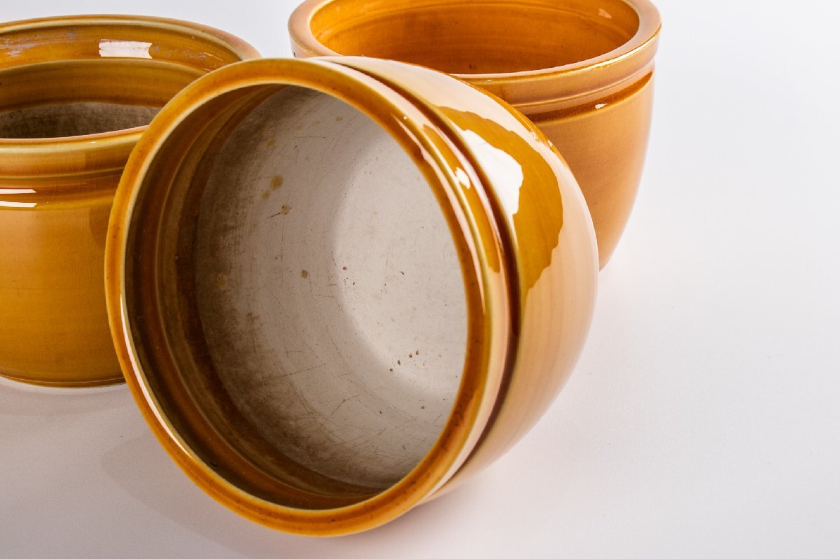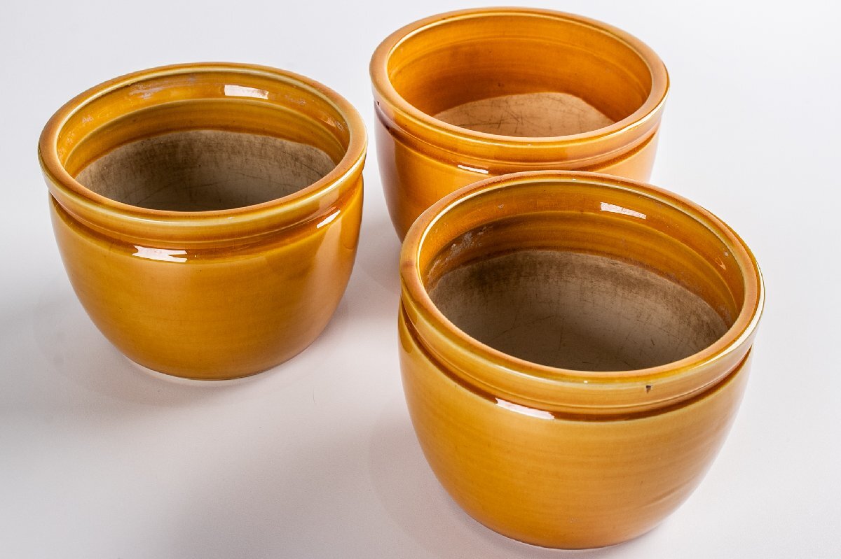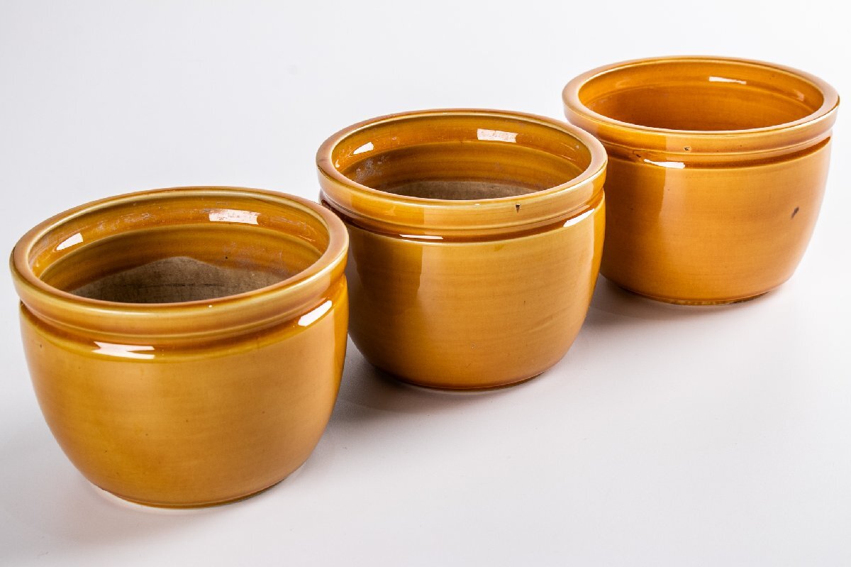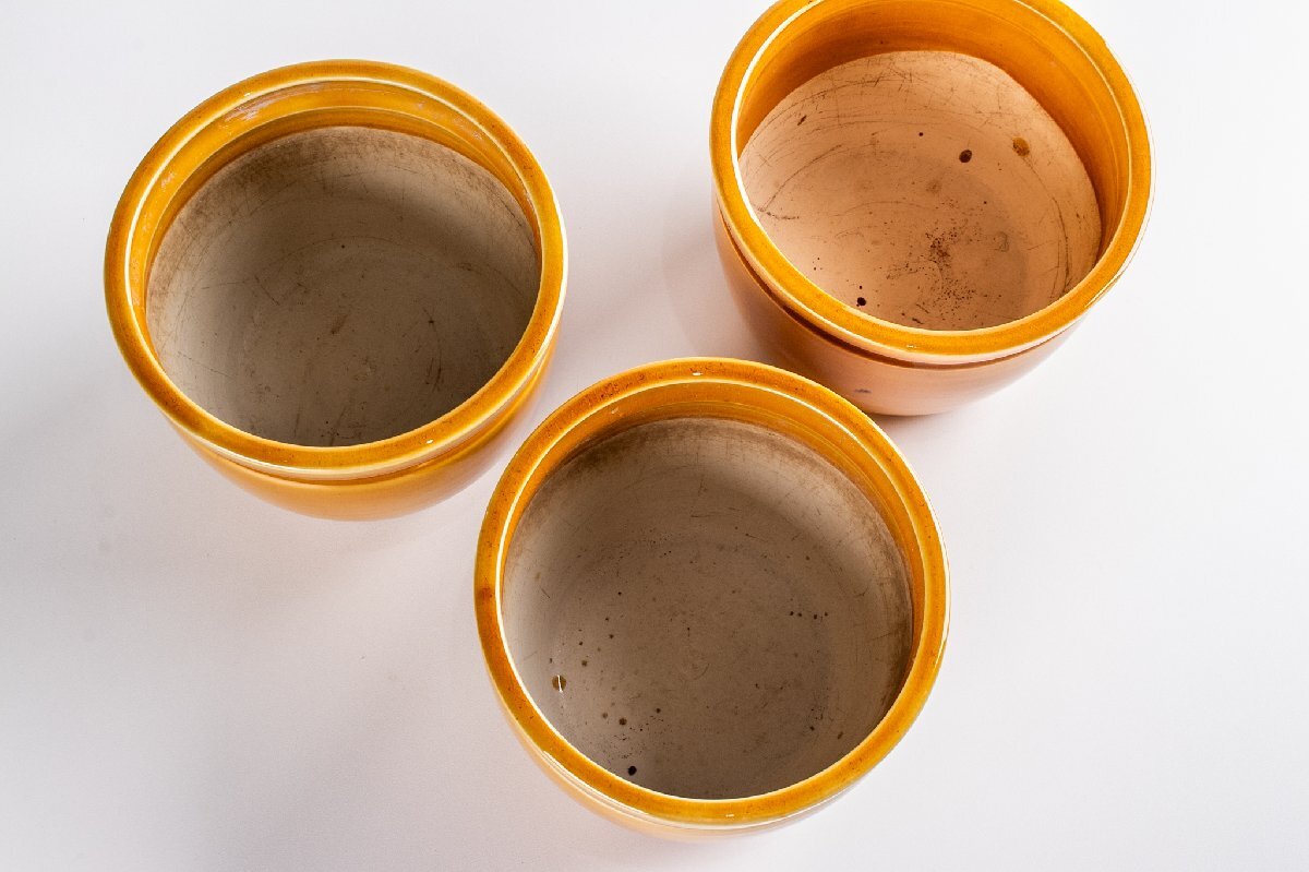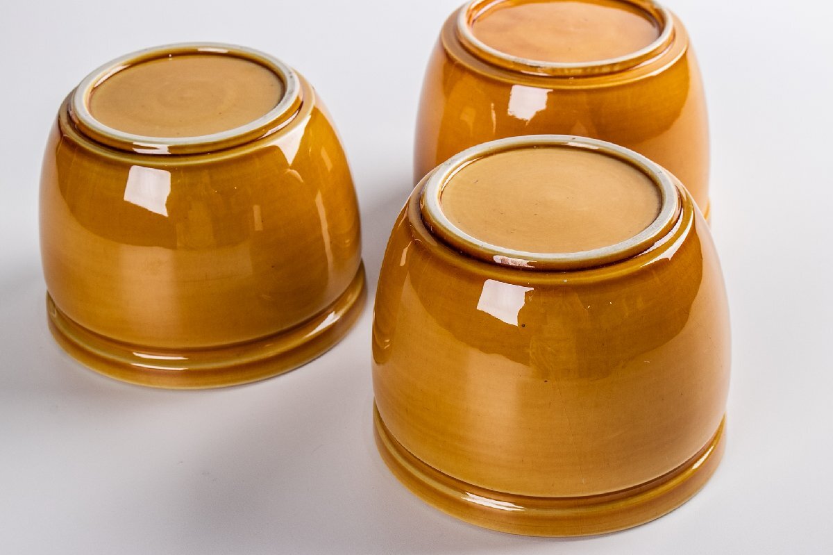 【うつわ】 淡路民平焼 黄釉火入 3客 E2287 珉平焼 淡路焼 古美術 骨董 古玩 唐物 和食器 日本料理 懐石 料亭
