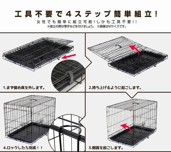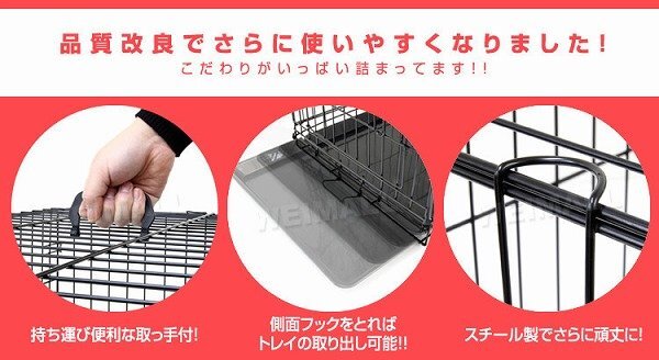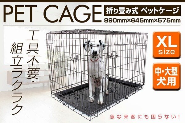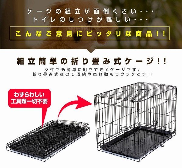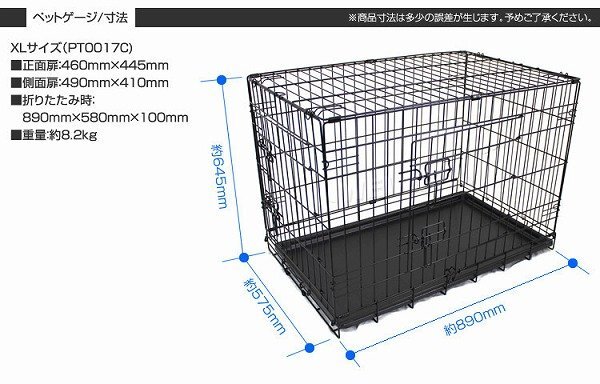 お留守番や、しつけに最適! 移動に便利な折りたたみ式ペットケージ。 本体はネジ等を一切使用せず、パタパタっと開くだけの簡単組み立て式です。 折りたたむことができるので、使わない時の収納や移動する時もラクラク! 日頃からケージを自宅で使用し、ワンちゃんも使い慣れることで、お出かけ先でも安心して休むことができ、ストレスの軽減にもつながります。 留守中やワンちゃんから目を離す時、いたずらによる怪我や事故の防止にも役立ちますし、緊急時の避難用にも重宝します。 【商品仕様】 カラー:ブラック サイズ(約):89cm×57.5cm×64.5cm (折りたたみ時(約):89cm×58cm×10cm) 材質:スチール、ABS樹脂 重量(約):8.2kg 参考サイズ:ダルメシアン ラブラドール 等 【注意事項】 ・こちらの商品は中・大型犬用のケージとなります。 ・ご注文時サイズは必ずご確認ください。 ・参考サイズはあくまで目安です。 ・本製品は屋内専用です。屋外で使用すると錆や変色の原因となります。 ・サイズ間違い、イメージとの違いによる返品、交換は一切行っておりません。 ・海外製品で、簡易梱包での輸入のため風防に擦れや多少の小キズなどがある場合がございますが、商品自体には問題ありませんのでご了承下さい。 ・仕様・デザインは改良のため予告なく変更することがあります。 |