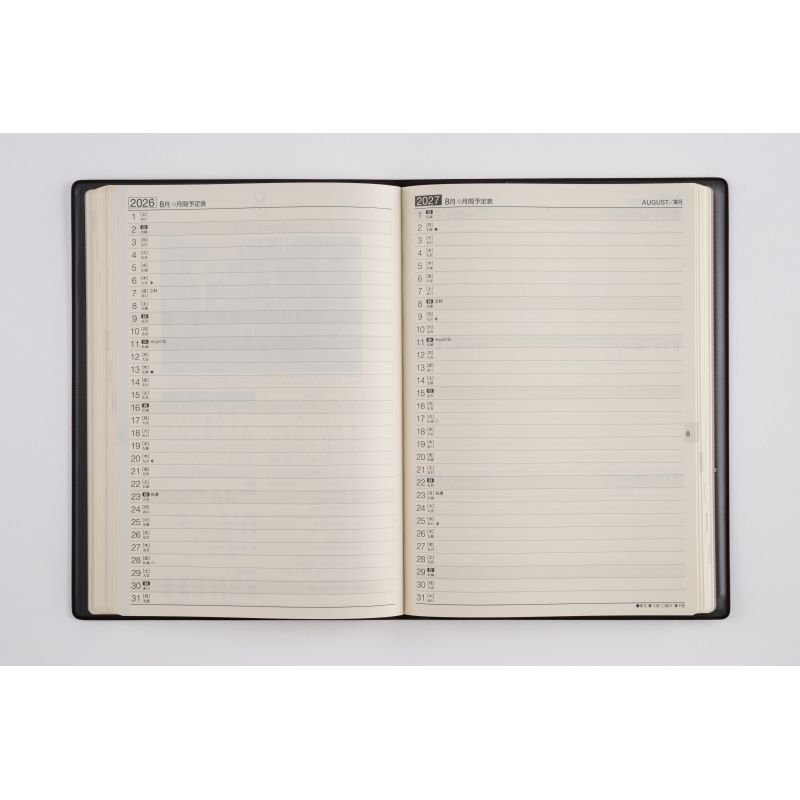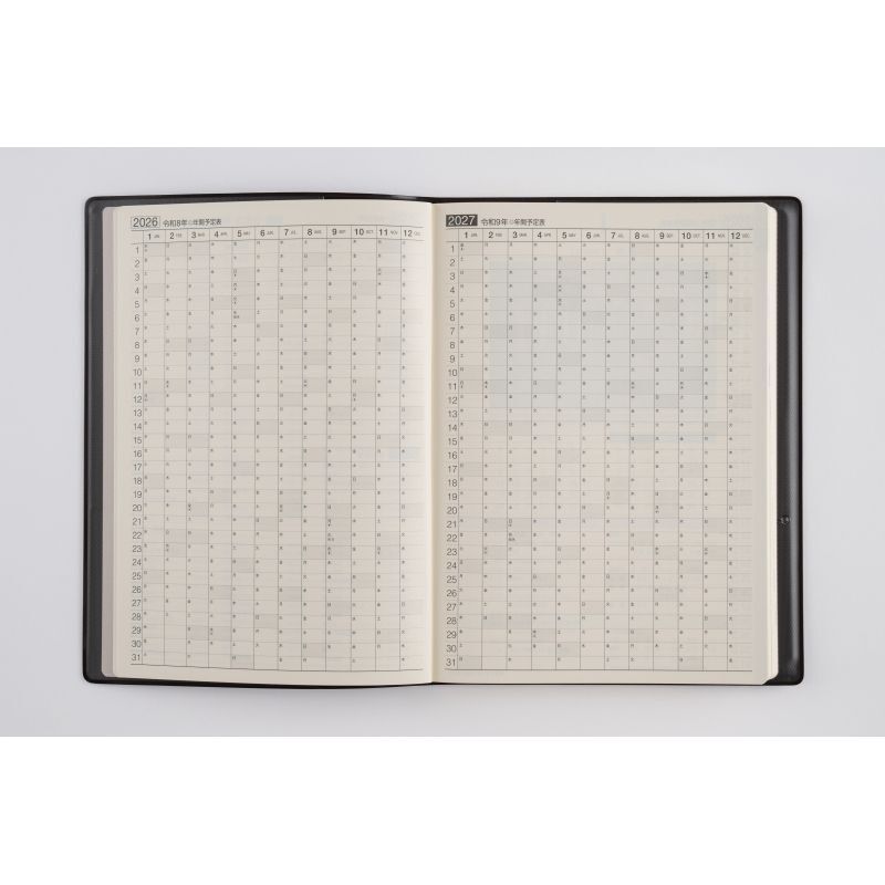 【月間予定表】見開きで1ヵ月2年分の横ケイ式。年ごとの比較がしやすいです。
