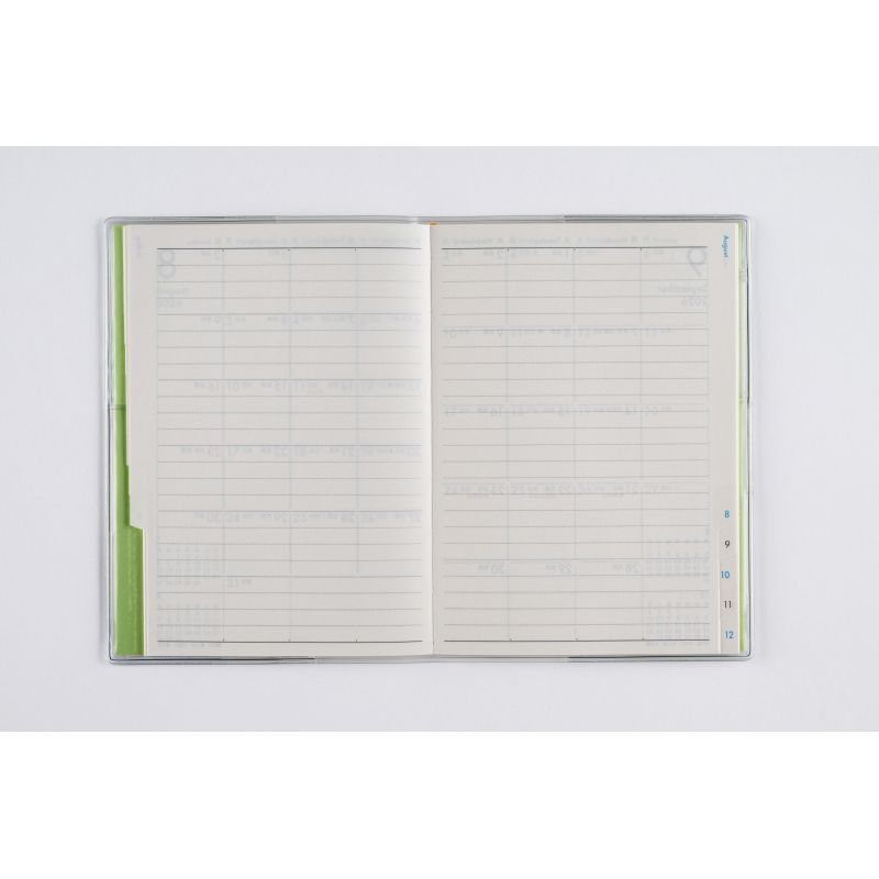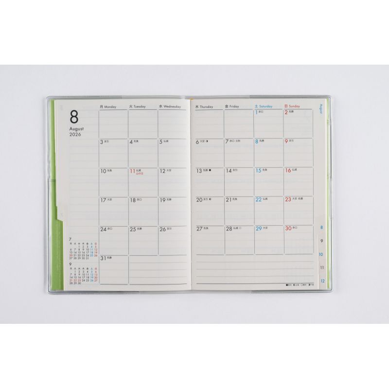 月間予定表のみの薄型タイプで、小さなカバンにもおさまりやすいハンディサイズ! 便利な月別インデックス付き。
