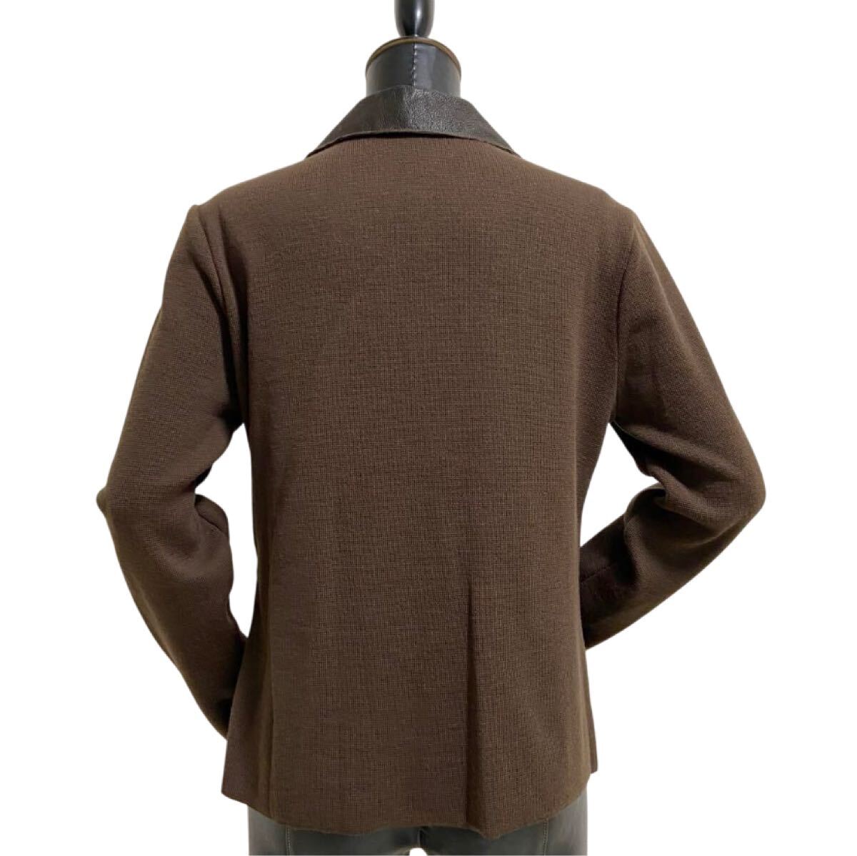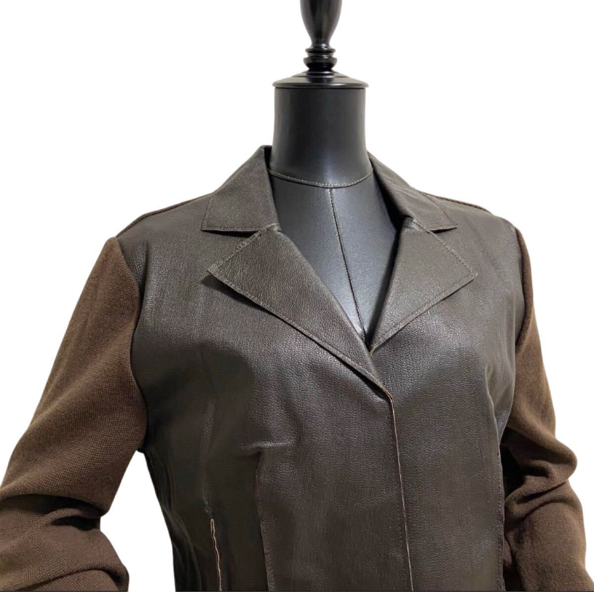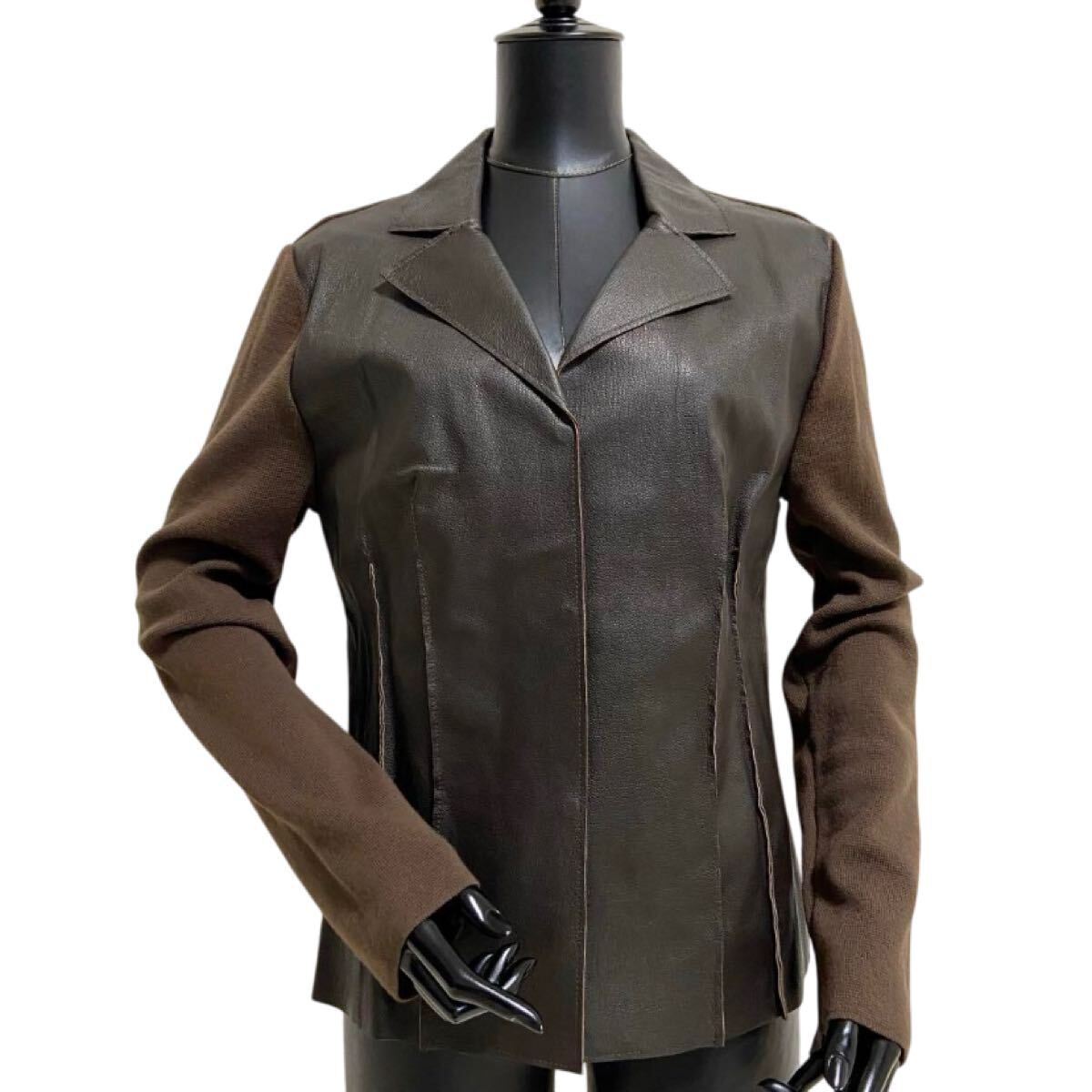 ツノダパリのスイッチファブリックジャケット。完売品。参考定価9万。超希少。選び抜かれたカウレザーにニットをドッキングしたスイッチファブリック。ニットはストレッチ性を備えており、身体にしっくりと馴染む極上の着心地。異種素材によるメリハリ。ボディラインを美しく表現する考え抜かれたシルエット。クリエイティビティとクラシックエレガンスの融合。カラーはブラウン。イタリア製。ストックマン取扱い国内正規品。裏地無し。ノーベント。フロントはスナップボタン。