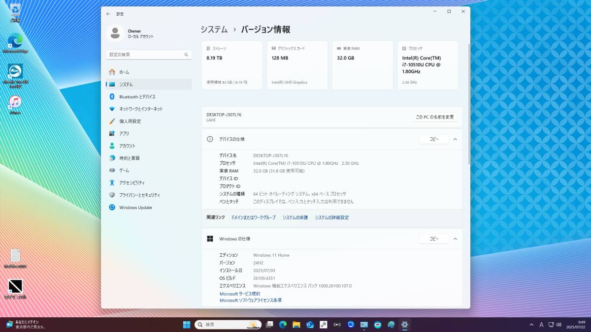 OS:Windows11 Home 64ビットWindows11 Home 64ビットで最新版(Win11バージョン:24H2)
