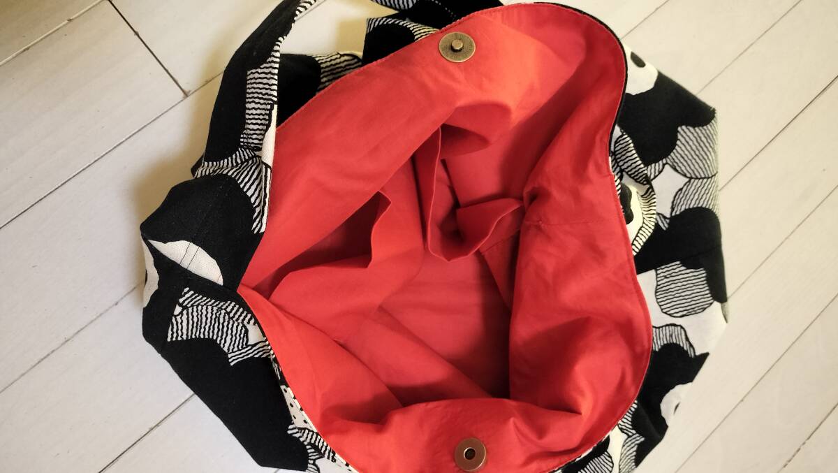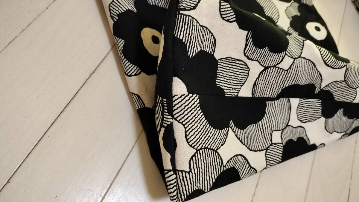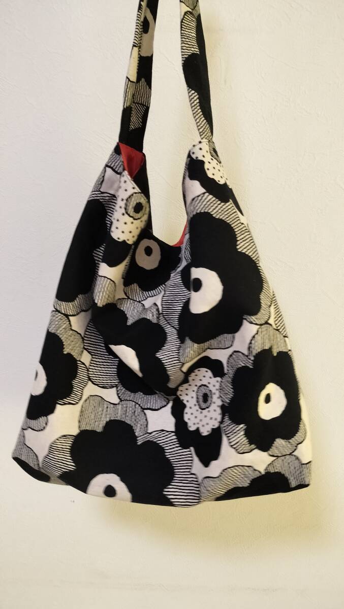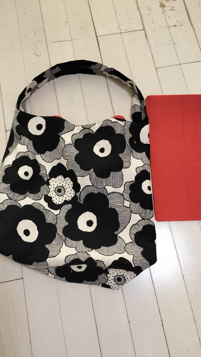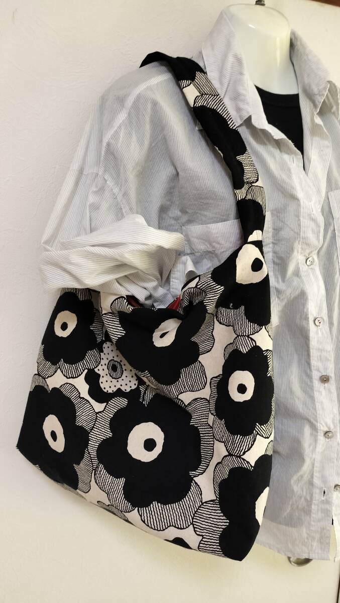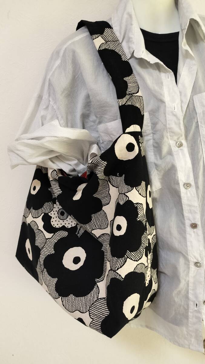 ハンドメイドのモノトーンの花柄、大きめワンショルダーバックです。