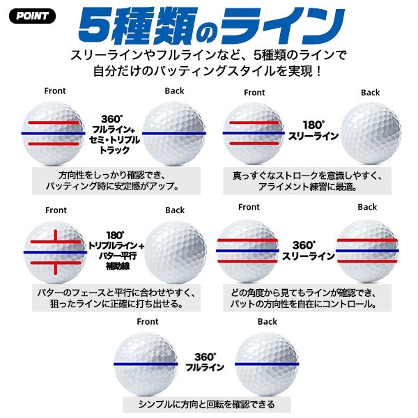 スリーラインやフルラインなど、5種類のラインで自分だけのパッティングスタイルを実現!