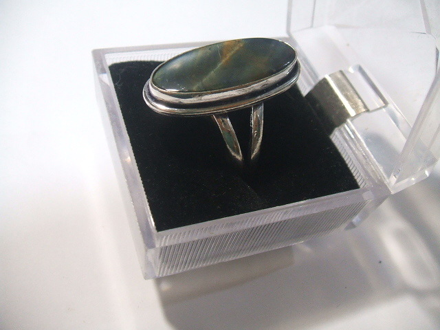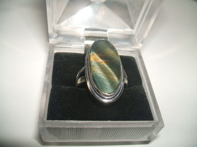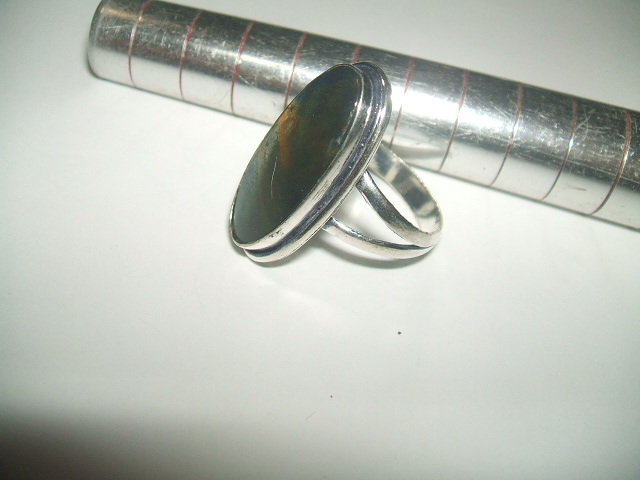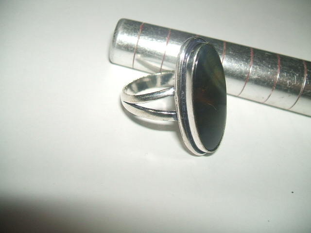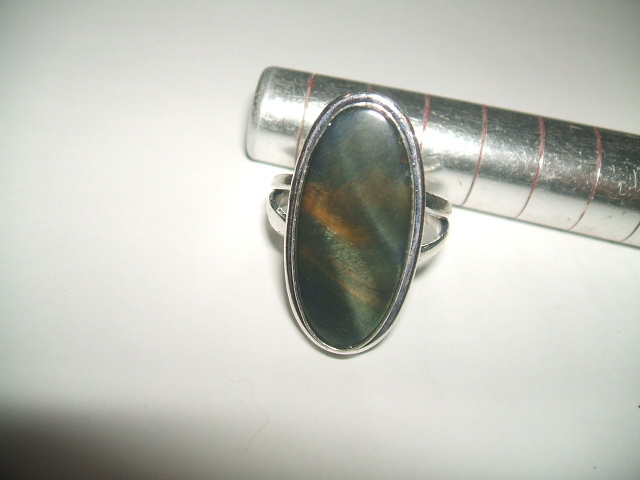 つやのあるシルキーな輝きが美しいブラックタイガーアイリングです。石の大きさは2.5x1.1センチ。金属はシルバーで925の刻印があります。墨絵のような黒い地色に薄茶の模様が幻想的な輝きを見せています。写真では薄茶の模様が赤みを帯びていますが、実際の色は茶色になり、写真ほど模様がはっきりとしていません。写真と実物の色や印象は全く同じではありませんので、あらかじめご了承ください。