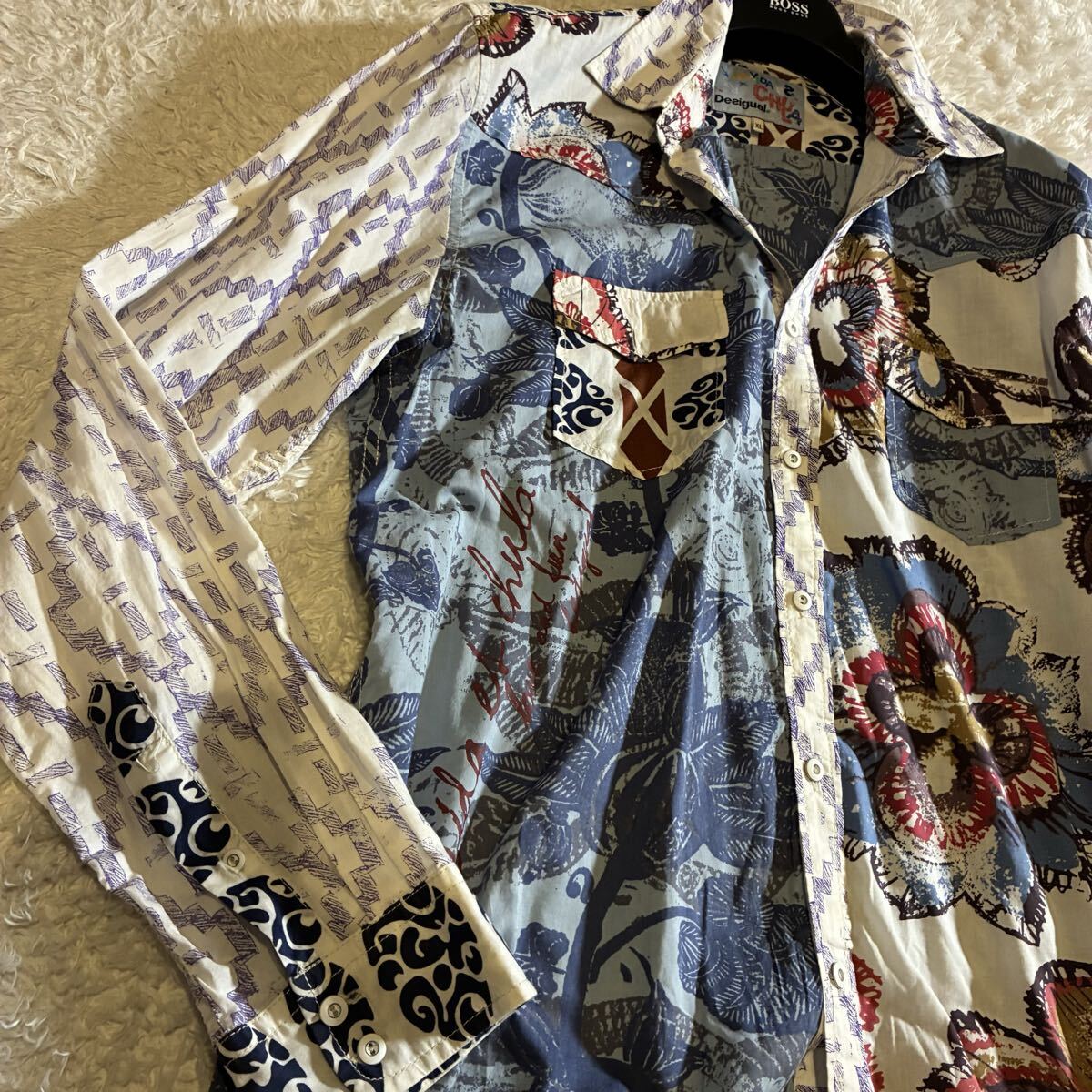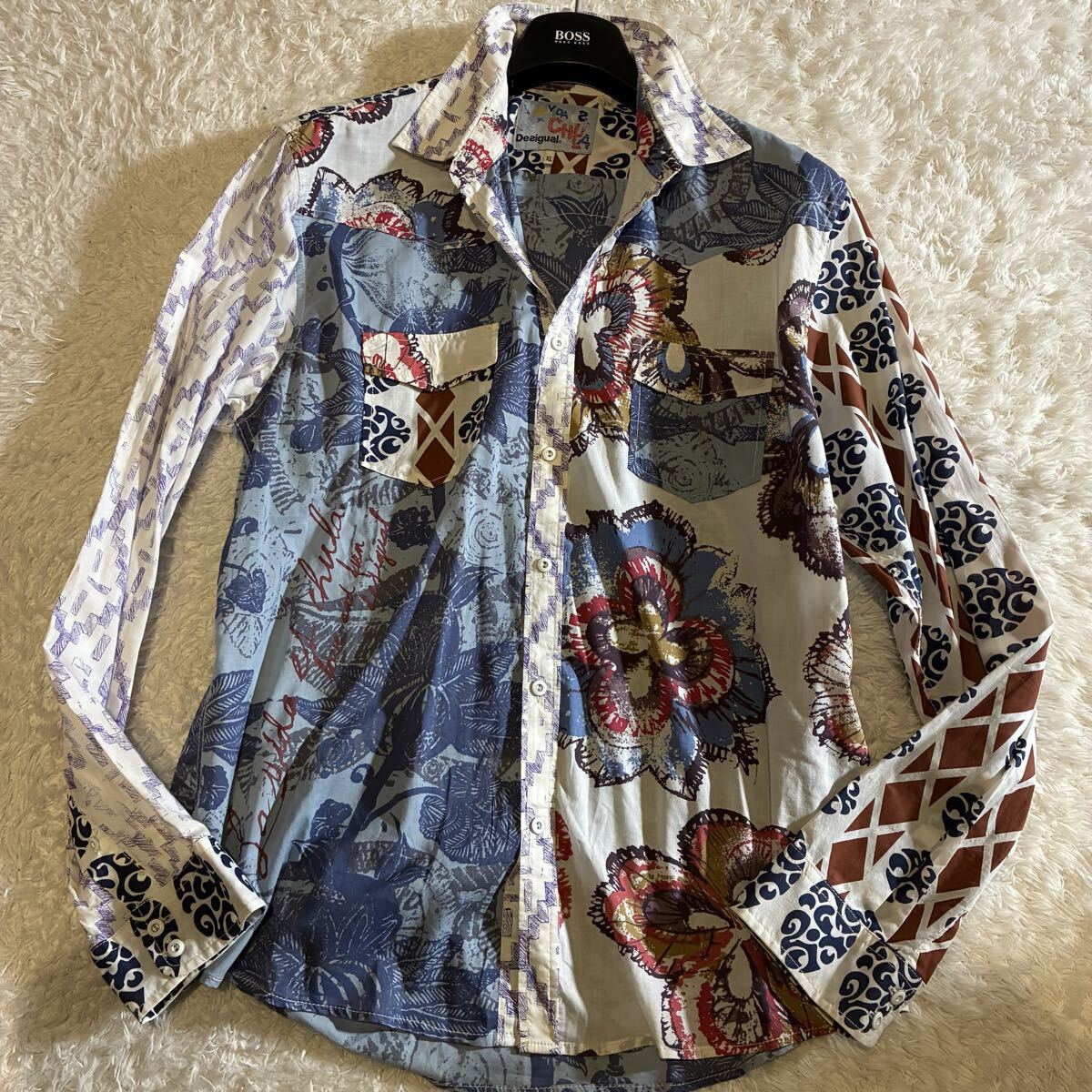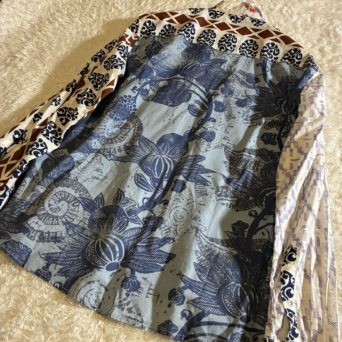 全体的に良好なコンディションで、複雑なミックスプリント柄も鮮明に保たれています。コットンの上質な素材感も損なわれておらず、目立った汚れや傷は見受けられません。デシグアル特有のアーティスティックなデザインを存分に楽しんでいただける状態です。