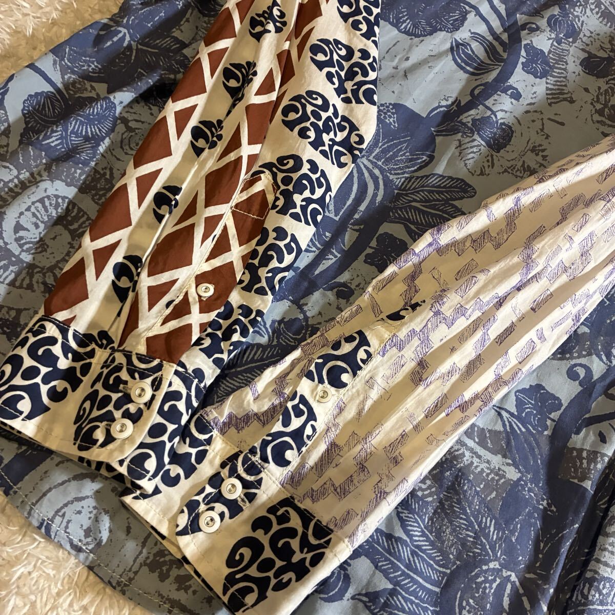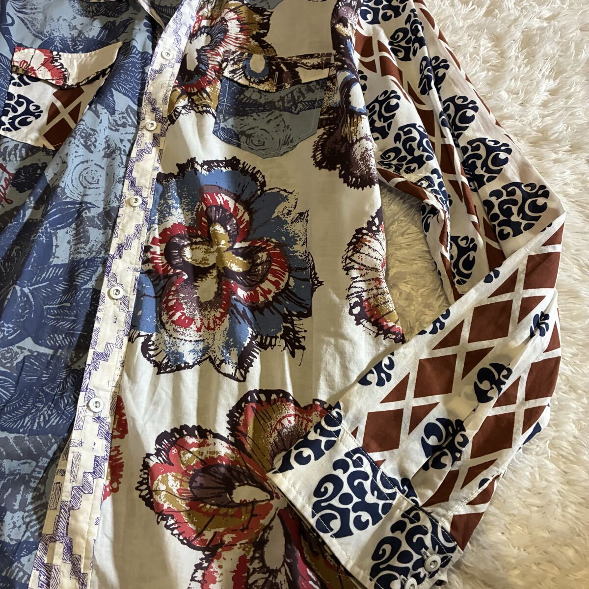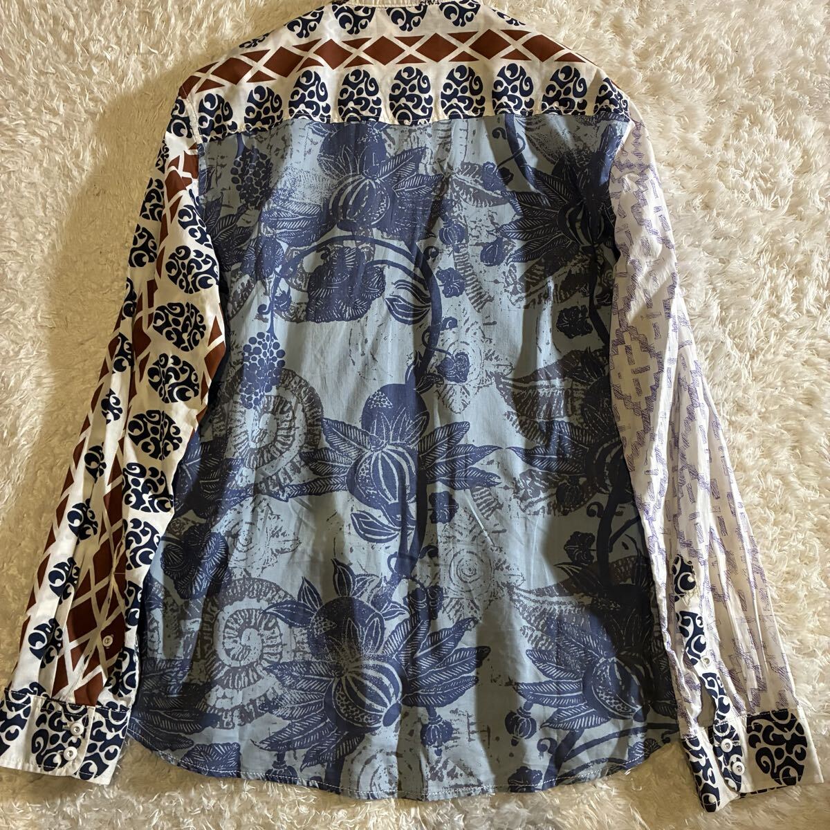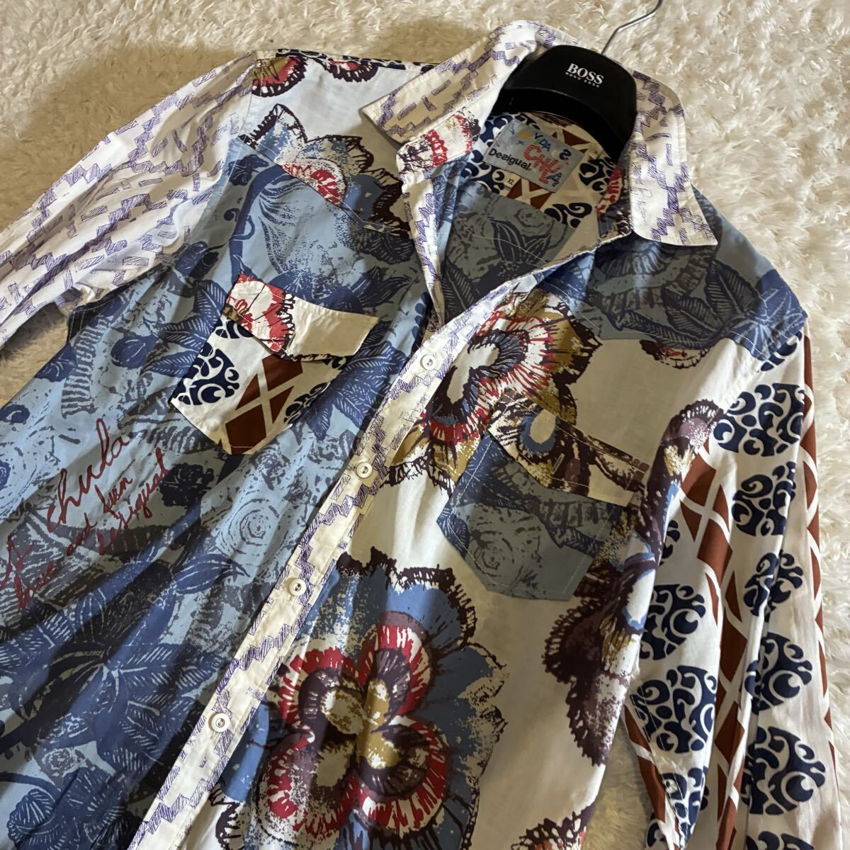 全体的に良好なコンディションで、複雑なミックスプリント柄も鮮明に保たれています。コットンの上質な素材感も損なわれておらず、目立った汚れや傷は見受けられません。デシグアル特有のアーティスティックなデザインを存分に楽しんでいただける状態です。