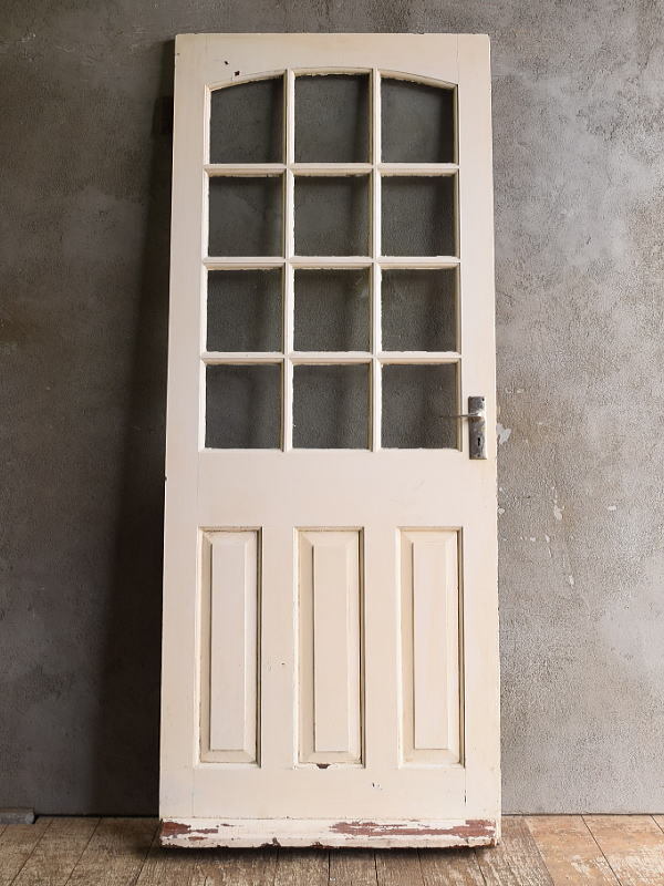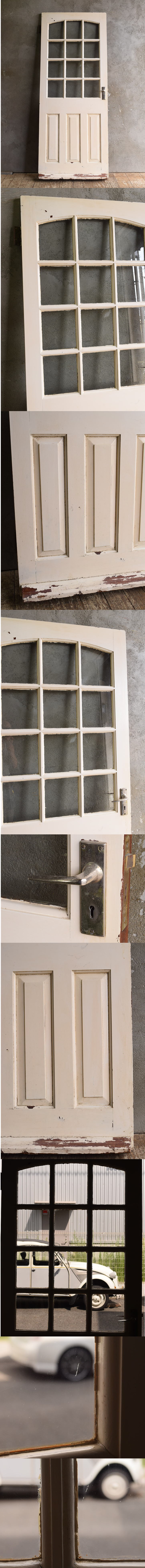 イギリスの蚤の市で見つけてきた古い、木製ドアです。 使い込まれた風合いがとても素敵です。クローム製レバーハンドルが付いています。立てかけてお部屋のインテリアにしたり お花屋さんや雑貨屋さん等 ショップディスプレイの アクセントにもオススメです。 桟、カマチが長年の使用により磨耗、取り外し時の傷があります。(画像参照)取り付けてご使用の場合加工、調整が必要です。ガラス部、傷(画像参照)がありますが、 ヒビ、チップはありません。ペイントの劣化は少しづつ進行します。 ご注文時期により現状とは多少状態が違っている場合もございますので、ご購入前にお問い合わせください 。 古いものとご理解ください。