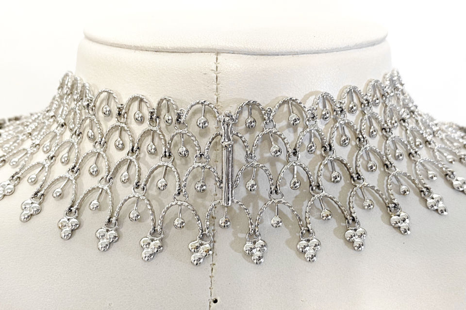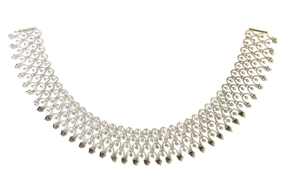 解説 | 飾り襟(コルレット)と呼ばれるレーシーな幅広チョーカー。細いWGワイヤーの一本一本をツイスト&カーブさせた連続柄は、和の古典柄、青海波を想わせます。洗練されたジャポニズムと、キラキラとしたメレーダイヤの波しぶきが、主役を美麗に輝かせます。 |