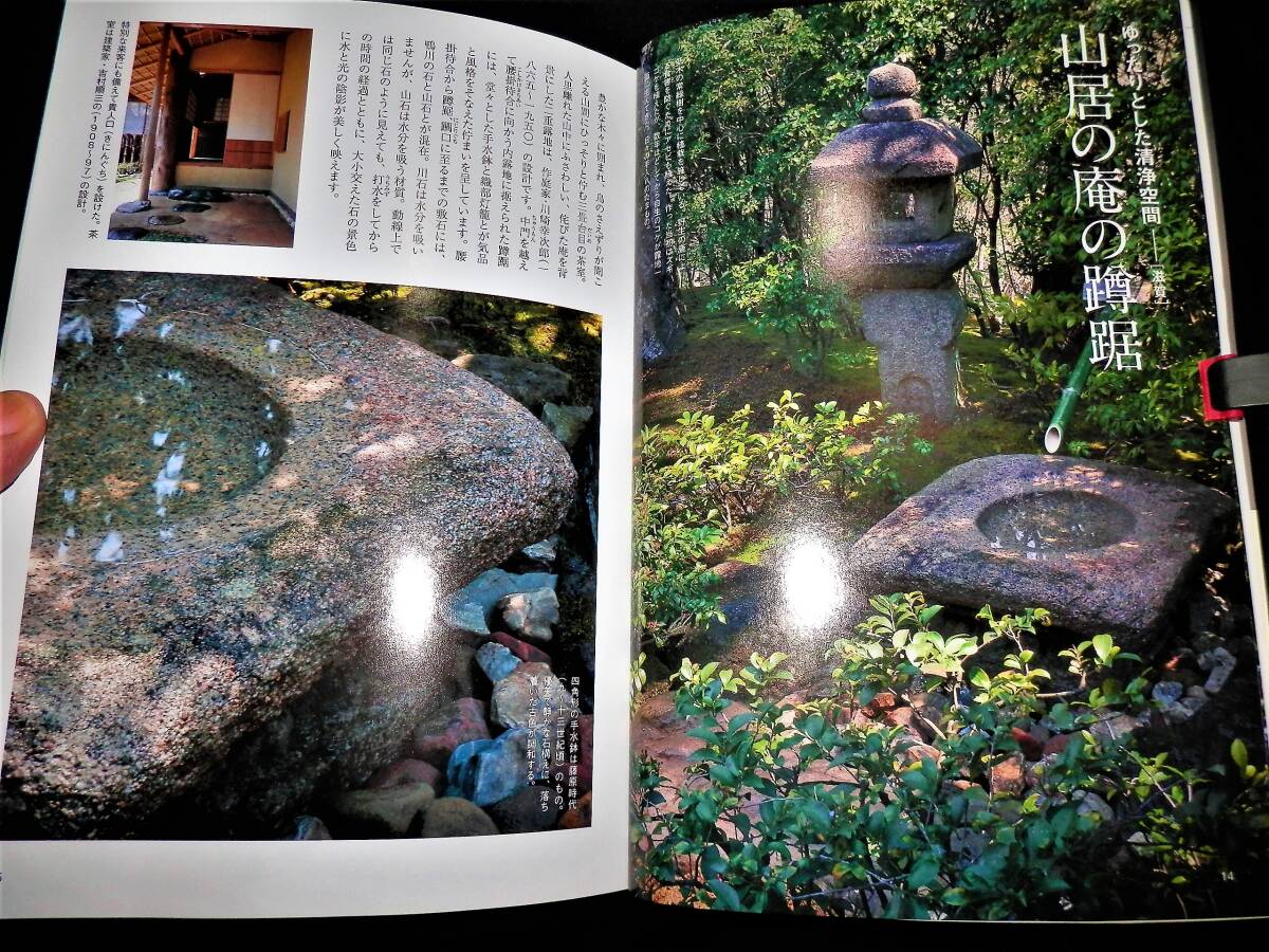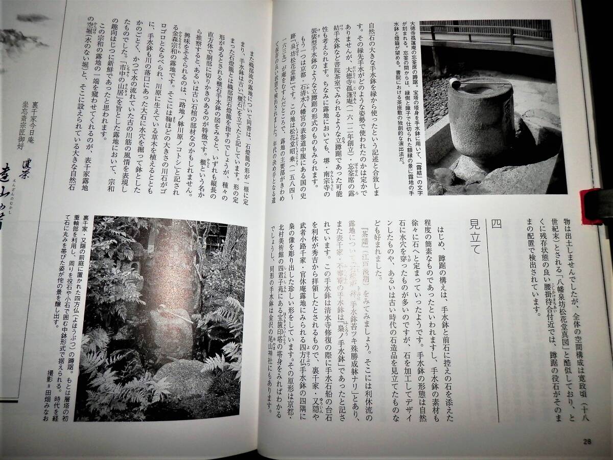 ■■『雑誌』・・・■■ ●●『なごみ』・・・●● **”(2009年7月・通巻355号)”** ■■『特集』・・・■■ ―”石・水・緑の妙”― ●●『蹲踞・手水鉢のたのしみ』・・・●● **”(約・36頁) ”** ★茶事のために庭・露地において中心的存在となる蹲踞。 もとは岩間から湧き出る山清水を茶庭に写そうと考案 されたものですが・低く据えられた手水鉢を文字通り 蹲って使う事で・心身を清める役割を担いました。 石・水・植栽・各素材が持つ機能とデザイン性がバラ ンスよく融合した景は・まさに市中の山居。 景趣や工夫など・露地に尽くされた粋をおたのしみく ださい。 ■■『小特集』・・・■■ ―”比べてみよう”― ●●『向付の名品』・・・●● **”監修・談=砂澤祐子・(五島美術館主任学芸員) ”** **”(9頁) ”** ■■『イラストで学ぶ・水屋の心得・7』・・・■■ ●●『仕覆の扱い』・・・●● **”文=入江宗敬・(裏千家正教授) ”** **”(4頁) ”** ■発行日=平成21年7月1日。 ■発行所=株式会社・淡交社。 ■サイズ=18×25.5cm。 ■定価=840円。 ■状態=美品。 ●表紙に・多少の・スレ・ヤケが有ります。 ●本誌内に・多少の・ヤケが見えますが ●傷みは・殆ど無く ●全体は・良い状態に思います。 ◆◆注意・・・◆◆ ★発行日より・経年を経て下ります。 コンディションに係らず・古書で有る事を 充分に御理解の上・御入札下さい。 ★神経質な方は入札をご辞退下さい・・!! ●全・128頁・・・!! ―”特集”― ●●「蹲踞・手水鉢のたのしみ」・・・●● **”(約・36頁) ”** ―”庭師に聞く”― ●●「茶の湯のためのよい蹲踞とは?」・・・●● ★茶室や露地の事情も違えば・庭石の組み方や素材も・ 各家の条件によって変わります。 そこでまず考慮すべきは・茶事茶会を催す目的で作る 露地の蹲踞に必要な知識。 実作の立場から・何をふまえれば・「よい蹲踞」・に なるかを伝えます。 **監修・文=岩谷浩三・(岩谷浩三庭苑研究家) ** **”協力=平井孝幸・石正園”** ◆岩谷浩三・略歴。 ◆岩谷さんによる・白山山麓の六万石と石正園製の 手水鉢とを組み合わせた未来型蹲踞。 土の地盤でもコンクリートの地盤でも作ることが でき・面積の調整も可能。 手水鉢周りは・六万石の向きを揃えて・役石とし ても使えるようにして組んだ。 これとは別に・自然石手水鉢を用いて組んだ蹲踞 の作り方は次頁に紹介。 *蹲踞を構成する各石の名称は36頁を参照。 ―”蹲踞ができるまで”― ★蹲踞はどのように作られるのでしょう? 地ならしから完成に至るまで・その工程を追いました。 **”(10点の写真と完成図)”** ―”茶の湯の蹲踞・Q&A”― ★庭の有無・マンション住まい等々・多様化する現代の 住環境。 そこに蹲踞を設けようとすれば・可能なことの範囲も スタイルもさまざまです。 理想の蹲踞を作るには何を心がけ・どのように課題を 解決したらよいのでしょう? 「庭師が教えるお施主さんへのアドバイス」・として ・岩谷浩三さんにポイントをうかがいました。 ◆蹲踞周りは自然石を・茶席の入り口付近には長方 形の切石敷を施すことで・狭いスペースにもメリ ハリがのある景が生まれる。 **”(Q&A・13)”** ★Q1-露地の四季の季節感を表現するには・どのよ うに表現したらようのでしょうか? ★Q2-植栽で景の変化をつけるのには・どうしたら よいのでしょうか? ★Q3-植栽に際して・よいコケ・悪いコケ・という のはありますか? ★Q4-以前・コケを植えたら枯れてしまいました。 失敗しないコケの育て方を教えてください。 ★Q5-ビルの中に蹲踞を設ける場合の工夫はありま すか? ★Q6-自然石・見立てものや創作もの・・・・何を 基準に手水鉢を選ぶとよいですか? ★Q7-小間と広間・それぞれに蹲踞を設ける時・手 水鉢の大きさや蹲踞の組み方に違いはありま すか? ◆金沢・つる幸の蹲踞。 コケやシダがよく根付き・豊かな景趣を育ん だ例。 ◆水面を広く取った創作手水鉢。 筧から落ちる水の景をたのしめる。 ◆側面が格子模様の・銀閣寺形手水鉢写しの蹲 踞。 ハラン植栽を使用。 ◆住居の縁先に据えた一文字の手水鉢。 周りの石組や植栽をシャープに作り込んで・ モダンな雰囲気に。 ◆石を丸形に加工した手水鉢。 ・(小松市・仙叟屋敷)。 ★Q8-見立ての手水鉢に陶磁器や鉢などを使う場合。 どのようなものを選んだらよいでしょうか? ◆利休形の湯桶の手水鉢に見立てた例。 ここでは・海の部分には・ごろた石の代わり に軒瓦を敷いた。 ◆手水鉢を用いずに・湧水や筧からの水の流れ を自然の景に見立てて蹲踞とした例。 ★Q9-海の部分には最低どのくらいのスペースがあ るとよいのですか? 小石などを置く場合は・どんな大きさでどん なものがきれいでしょう? ★Q10-蹲踞を据える二あたって・露地の動線で気 を付けておくポインとはありますか? ◆茶事において・二重露地の場合の・初入か ら退出までの流れ。 悪天時には躙口から近い蹲踞を使う(図)。 ★Q11-青竹を組んだ渡しが蹲踞に架かっているこ とがあ
