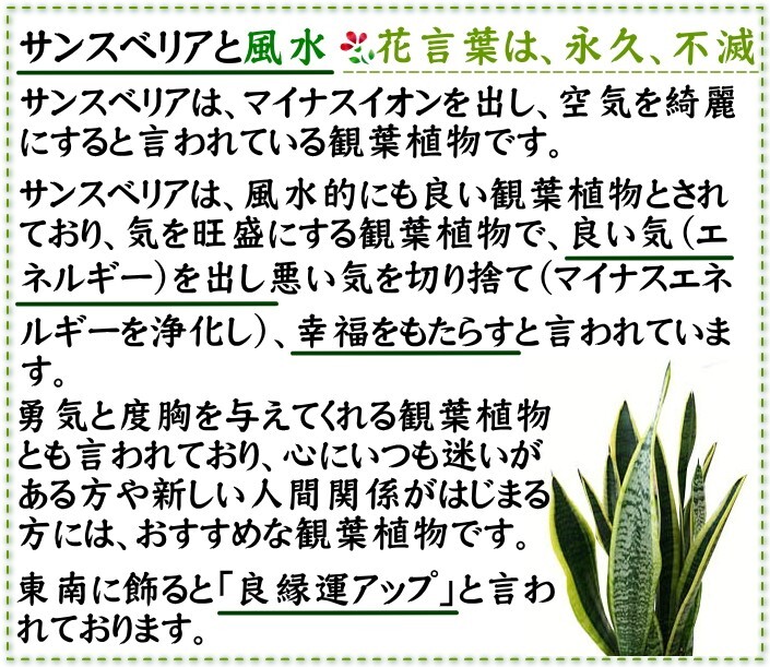 大きさと新鮮さが違います♪ 【土の表面に竹炭を敷いて、パワーアップしてリニューアル!】 マイナスイオンをたくさん出す観葉植物として人気になったのがサンスベリアなんです! 何と!大きめサイズ! ![]() 笑顔になれるゆとりの空間! ![]() 空気も綺麗に!お部屋も素敵に♪ 模様もステキ! ![]() |