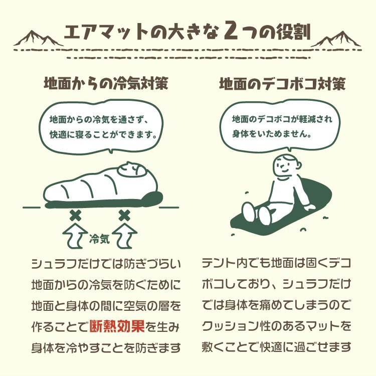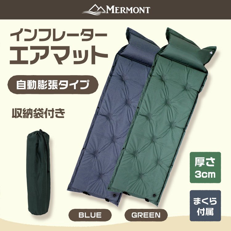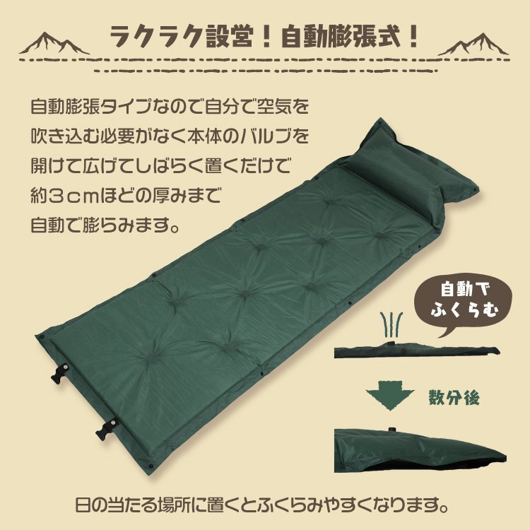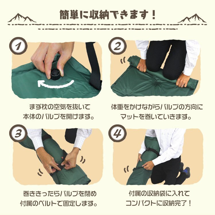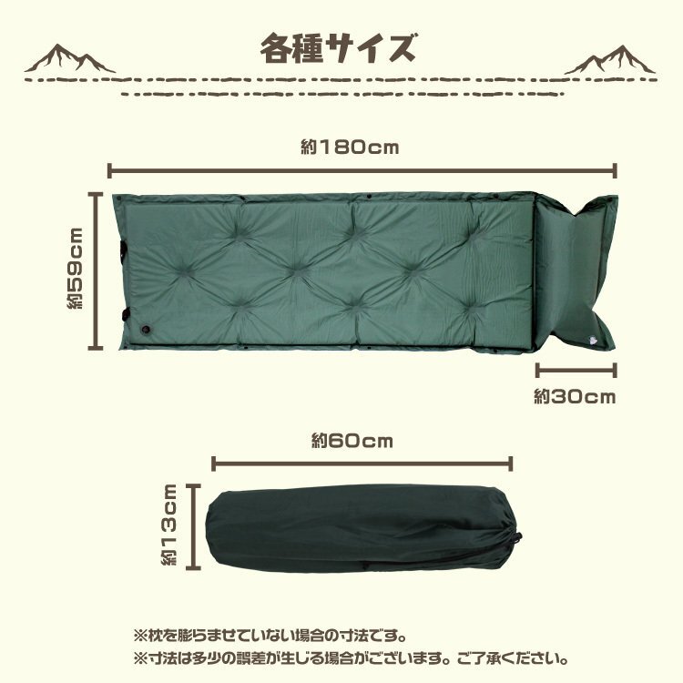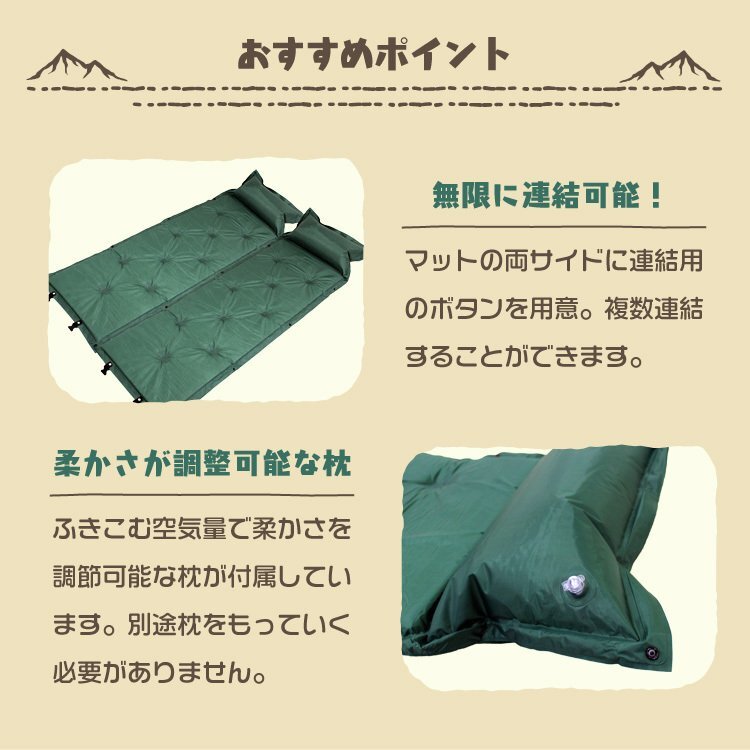厚さは3cmもあるため快適性は抜群で軽量です。枕もついています♪ 連結可能だから、2点以上購入がGOOD! 収納袋、収納バンドがついてくるから、簡単にコンパクトできます。 アウトドア・キャンプでの使用にはもちろん、ツーリング、車中宿泊などさまざまなシーンでご利用いただけます。 軽量・コンパクトなので地震や災害時の防災用品としてもオススメです。 【商品仕様】 カラー:グリーン サイズ(約):縦180cm×横59cm×厚さ3cm 収納サイズ(約):60cm×13cm 重量(約):1000g 【商品内容】 本体 ×2 収納袋 ×2 【注意事項】 ・膨らみが足りない時は直接息を吹き込んで空気を入れてください。 ・膨らませすぎるとエアマットが破損する可能性がございますのでご注意ください。 ・商品は、モニターによって色合いが異なって見える場合があります。 ・仕様・デザインは改良のため予告なく変更することがあります。 |