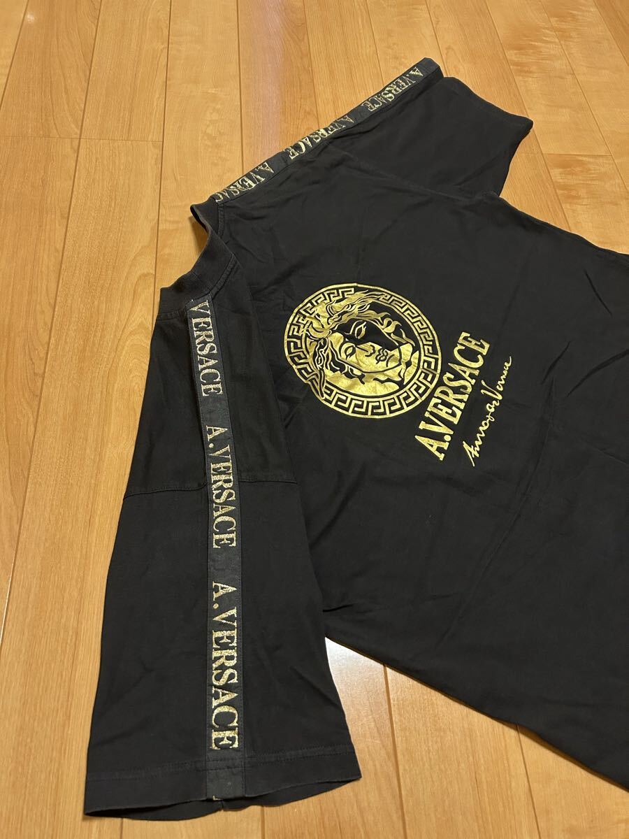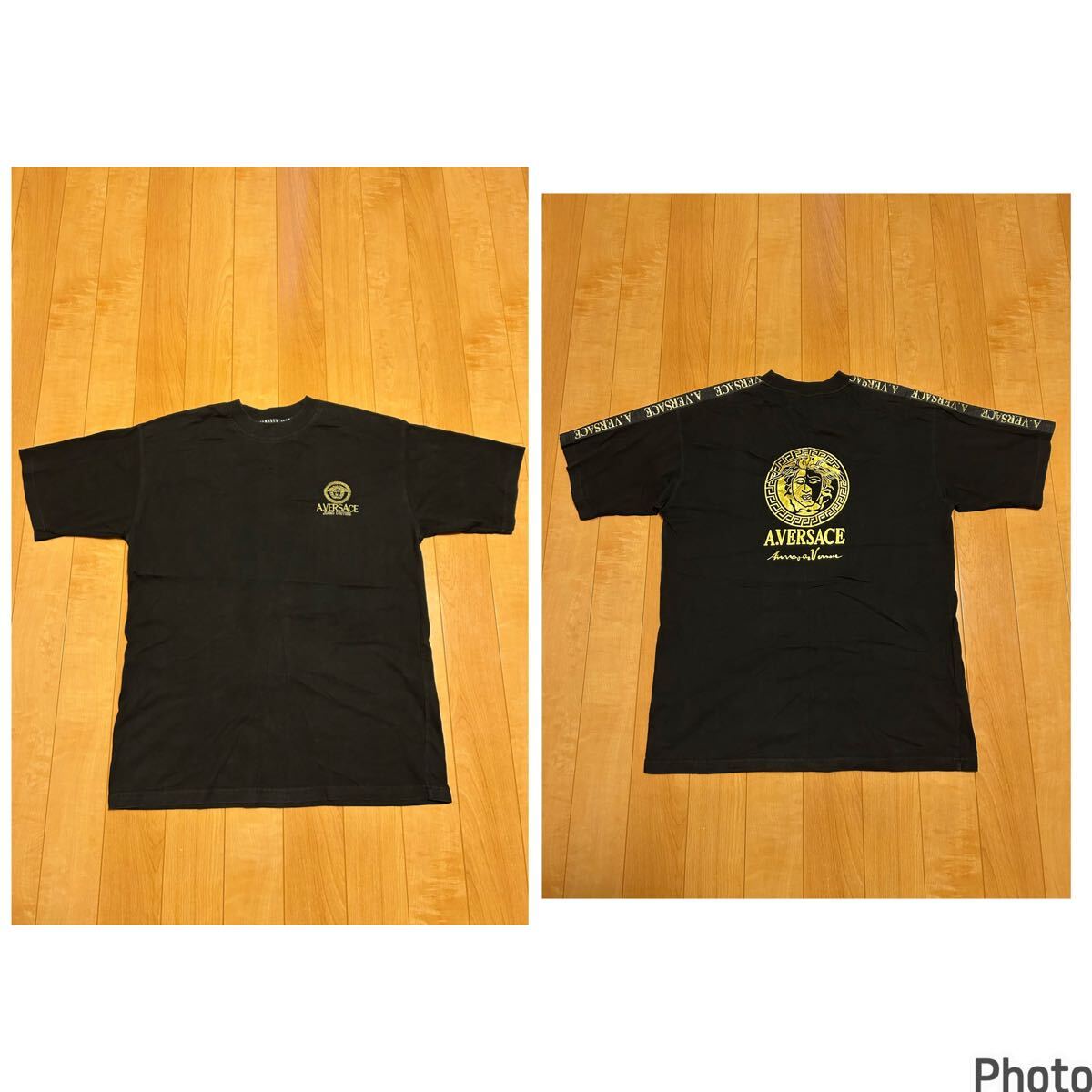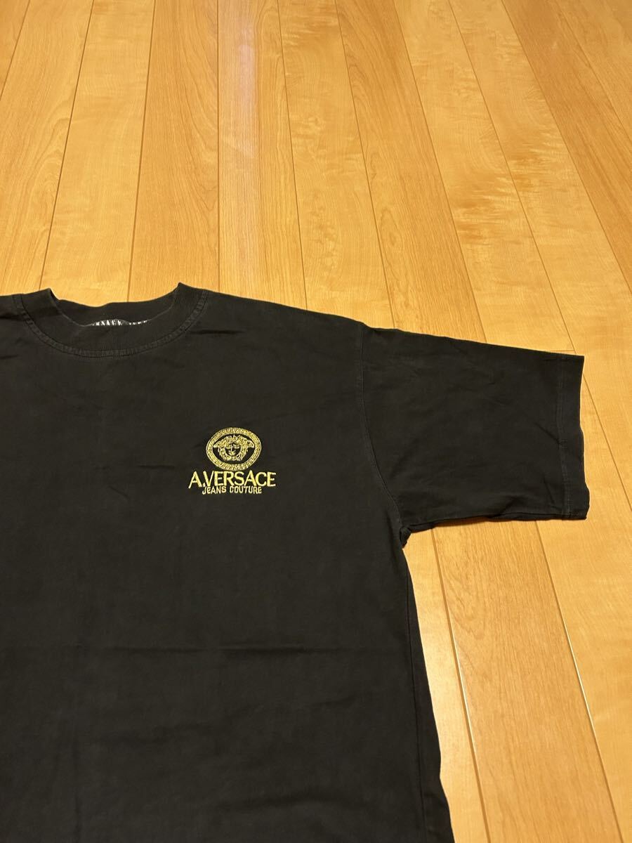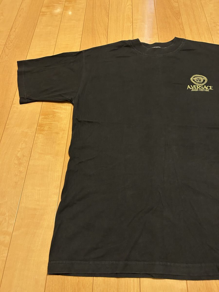 良品☆90s-Y2K・AV/A.VERSACE メンズオーバーサイズL大き目 ヘヴィコットン.半袖ブラックTシャツ 背面BIGメデューサ&袖ロゴライン入!黒