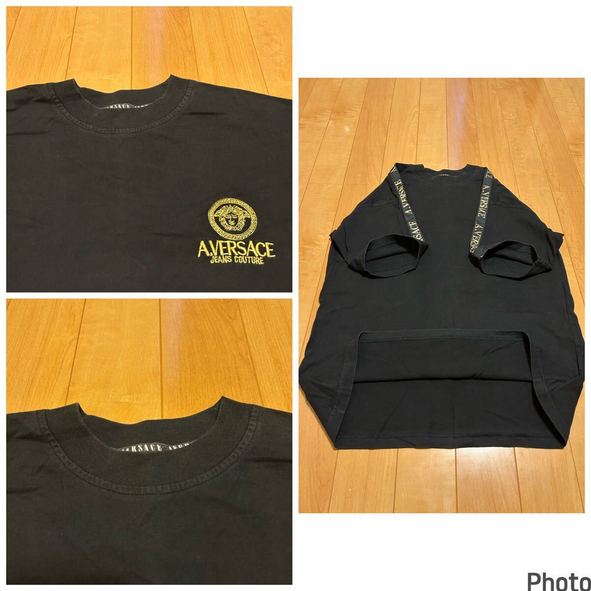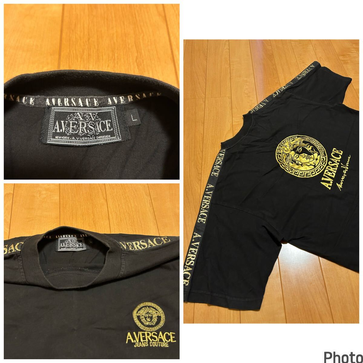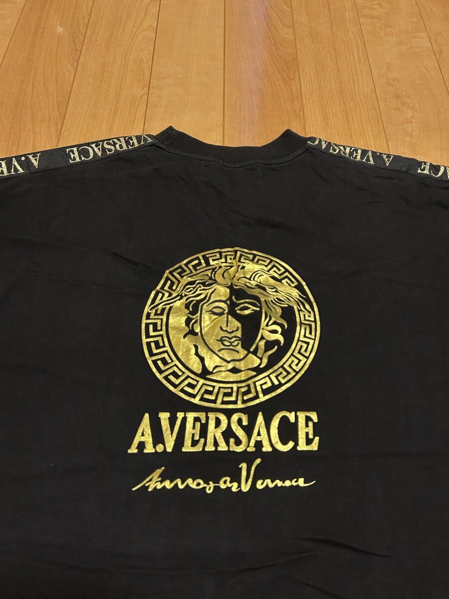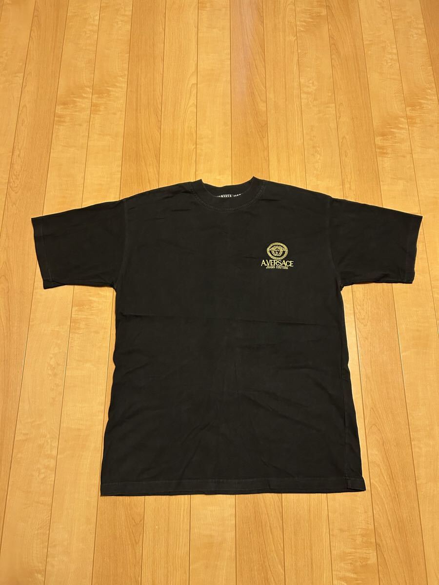 良品☆90s-Y2K・AV/A.VERSACE メンズオーバーサイズL大き目 ヘヴィコットン.半袖ブラックTシャツ 背面BIGメデューサ&袖ロゴライン入!黒