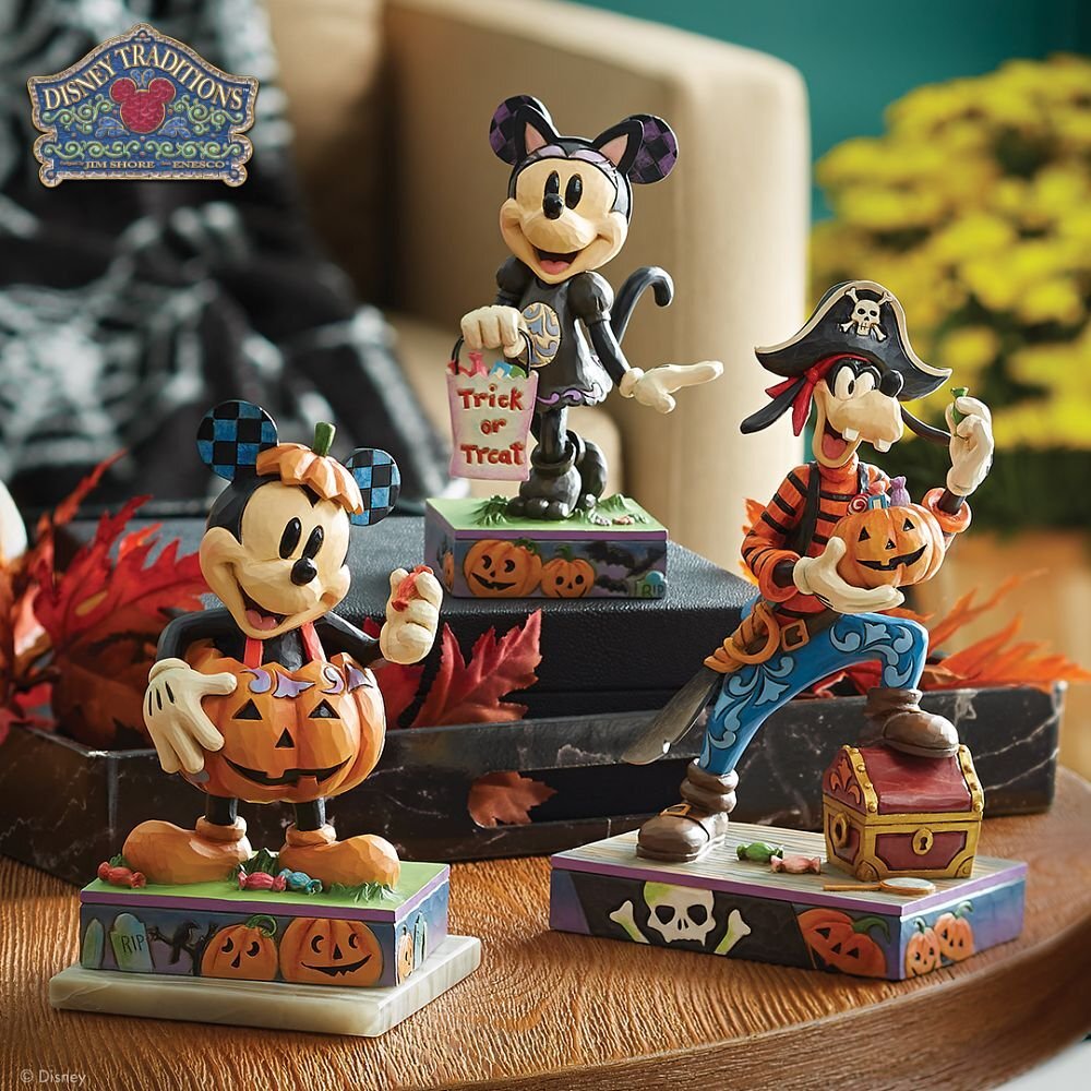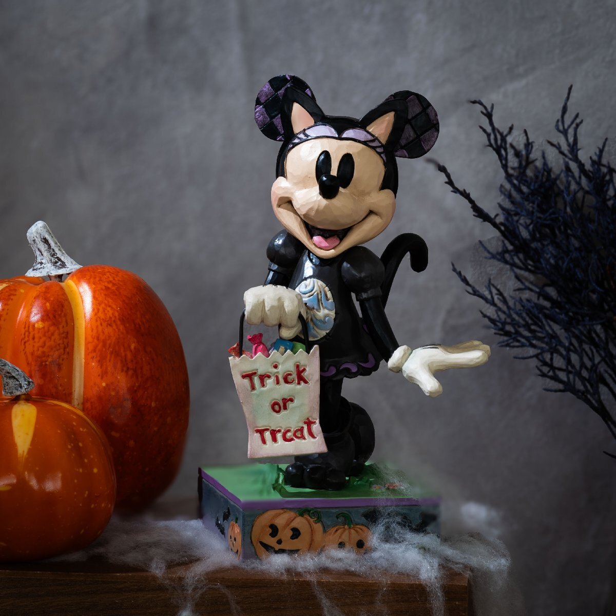 アメリカ・サウスカロライナ州出身のアーティスト、ジム・ショア氏が語るシリーズ「DISNEY TRADITIONS(ディズニー・トラディション)」。猫のコスチュームに扮したキュートなミニーがハロウィンのキャンディを集めています。ジャック・オー・ランタンとコウモリの不気味な彫刻が黒く描かれた台座が見た目も不気味に演出します。このノスタルジックな作品は、木工品の温かみある質感を再現するため、木の原型から型を取り込み、すべてハンドペイントで仕上げられています。