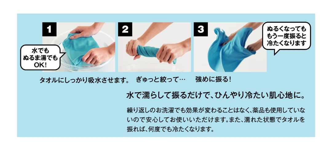 ぬらして、しぼって、ふるだけで生地温度が低下し冷たくなります♪