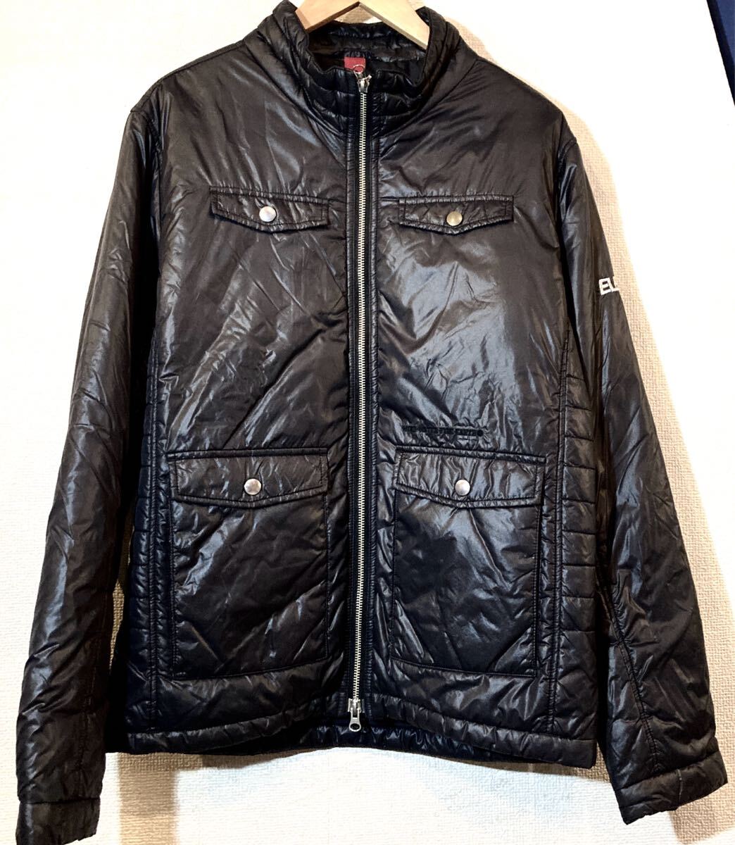 ブラックカラーのナイロン生地でできたシングルタイプのライダースジャケットで、中綿の入った軽くて暖かいデザインになっています。