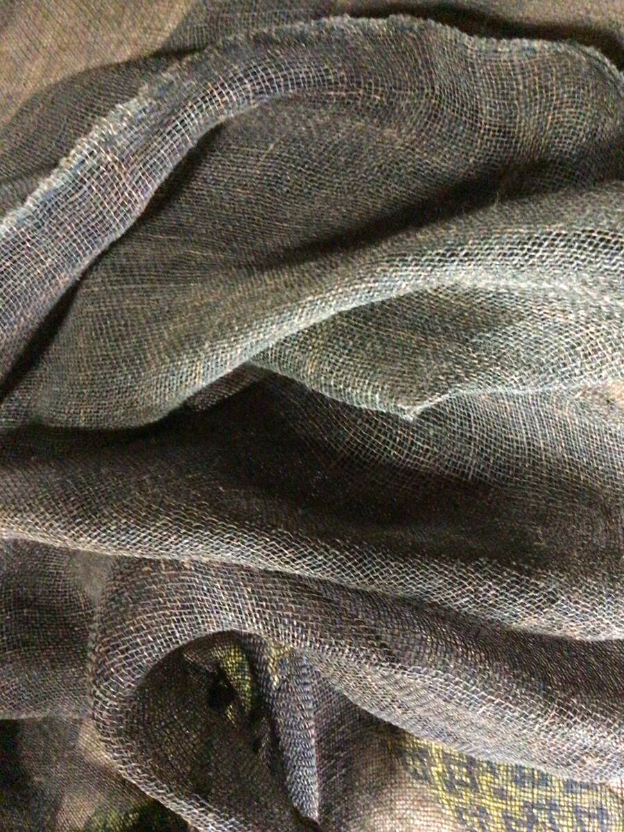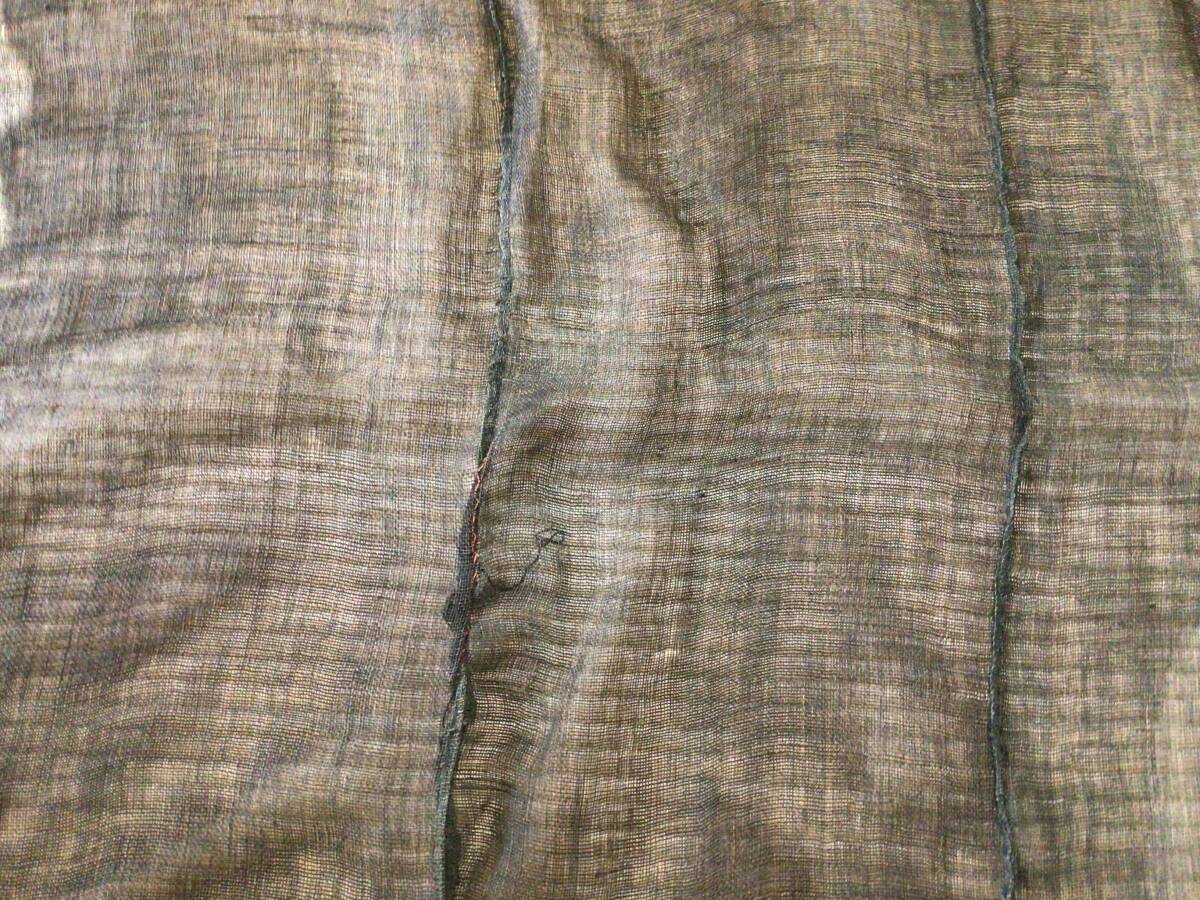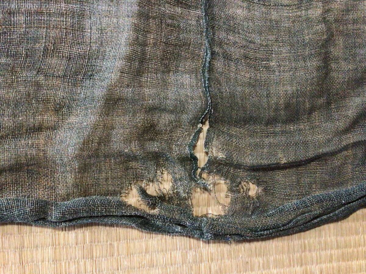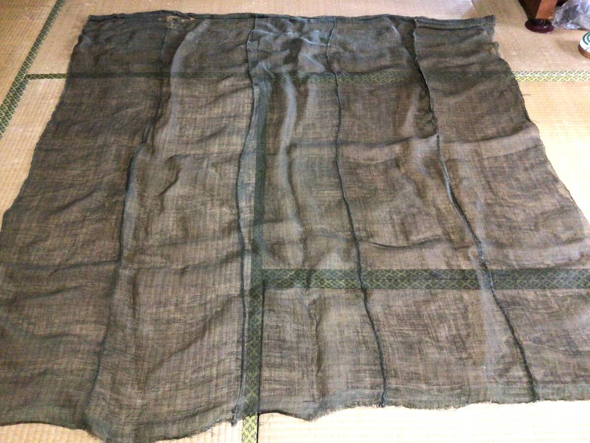 160×160センチあり、明治期の麻蚊帳はぎれです。傷みが1か所あり、自然の褪色もあります。