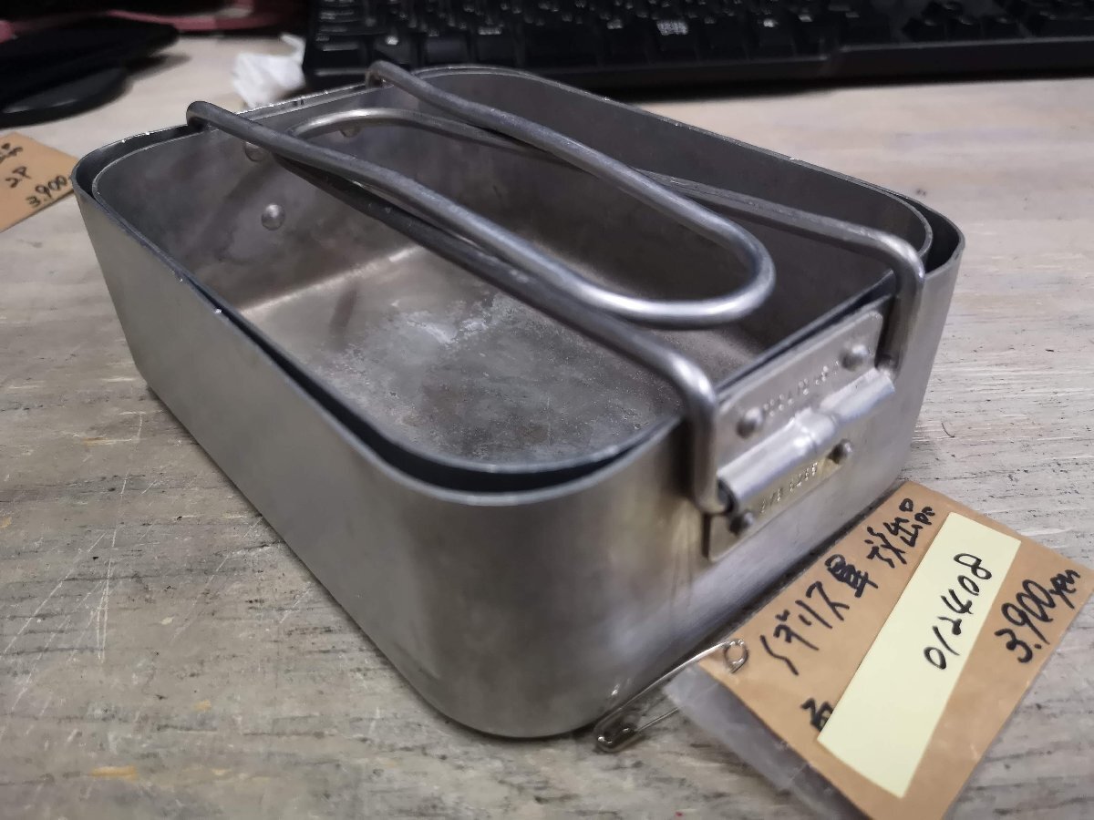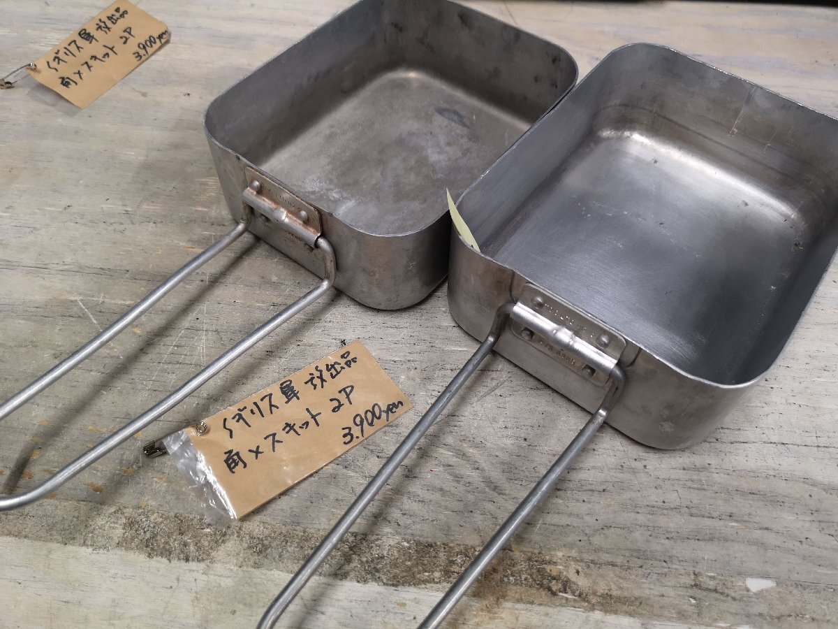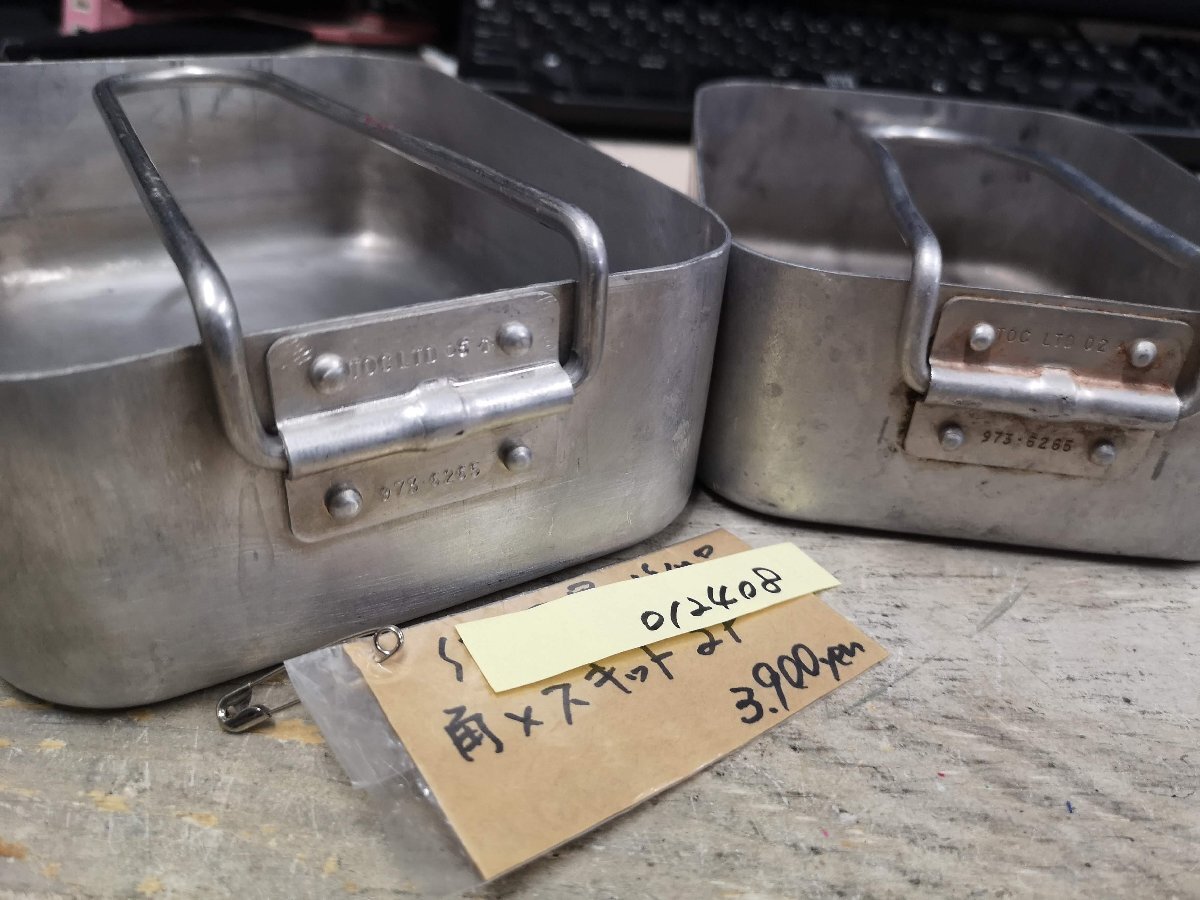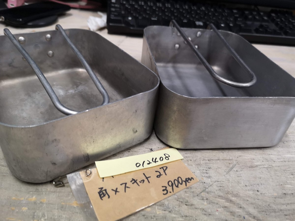 イギリス軍放出のお品です、ふたのないアルミメスキット2Pセットで年式などは不明、基本的にボコボコしていて味のあるお品です。サイズは大きいほうが18×14×6センチほどです。神経質な方は入札をお控えください。 沖縄離島を除く全国元払い500円にてお送りいたします。落札価格にプラスでお願いします。