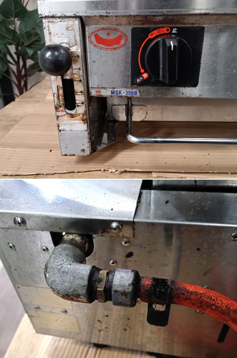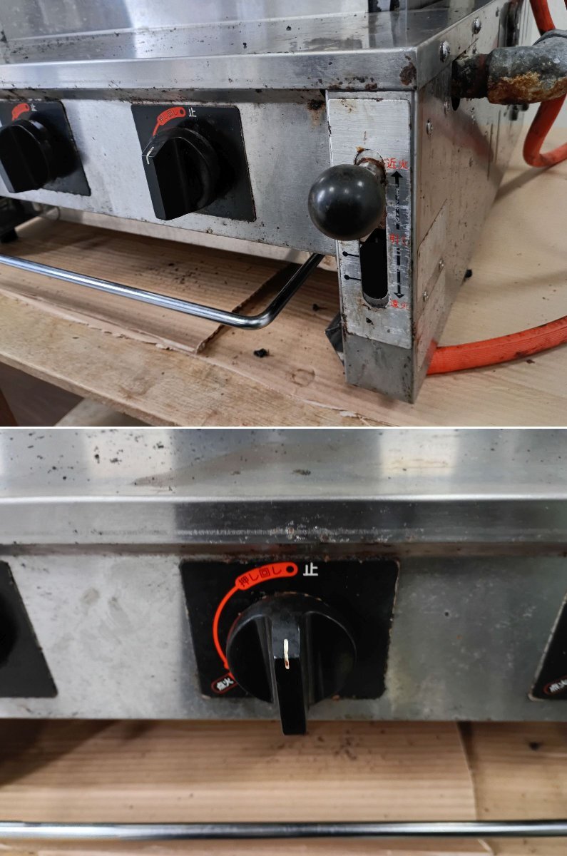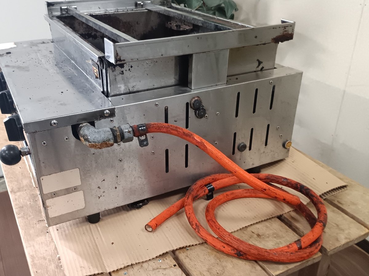 店舗にて実際に使用されていたものですが、 当方ではガス接続ができないため、動作確認は行っておりません。 外観は可能な範囲で洗浄済みですが、使用に伴う焦げ付きや落としきれなかった油汚れ、キズなどが残っています。 ガスホースが接続されたままの状態ですが、消耗品のため必要に応じて交換をおすすめします。